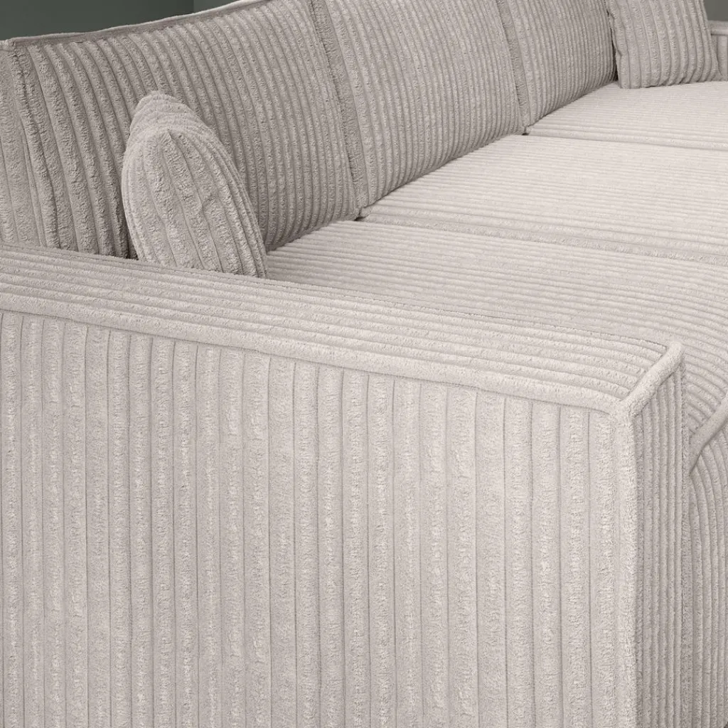 De bank is bekleed met ribstof met een aangename textuur die warmte en comfort uitstraalt. De ribstof, die een breedte van 2,5 cm per rib heeft, voelt zacht en fijn aan. De lage ronde poten zijn van kunststof gemaakt.