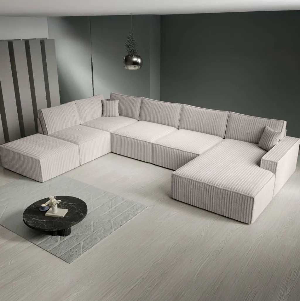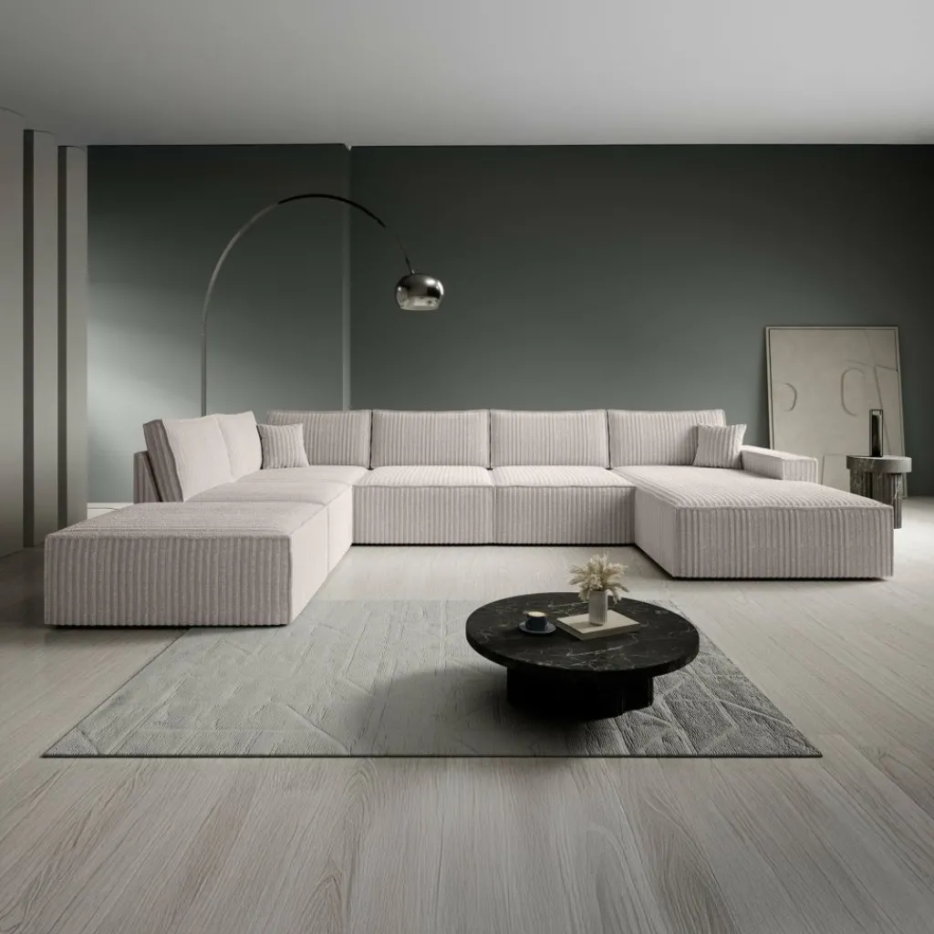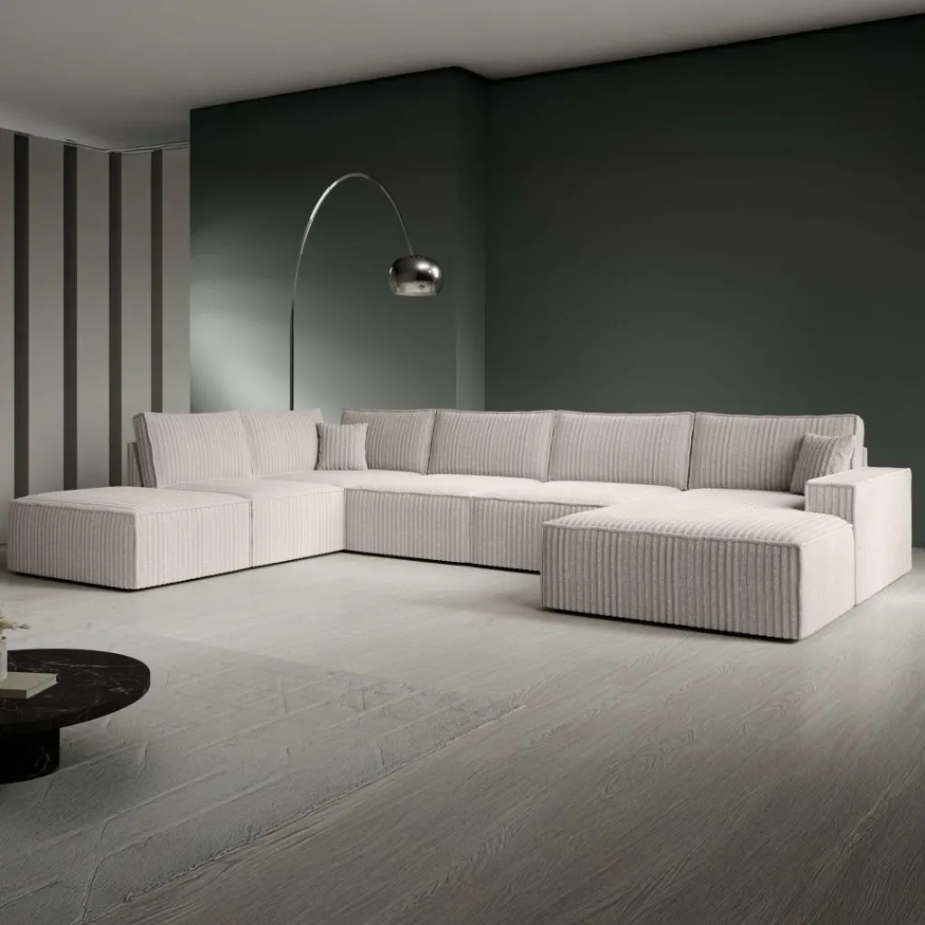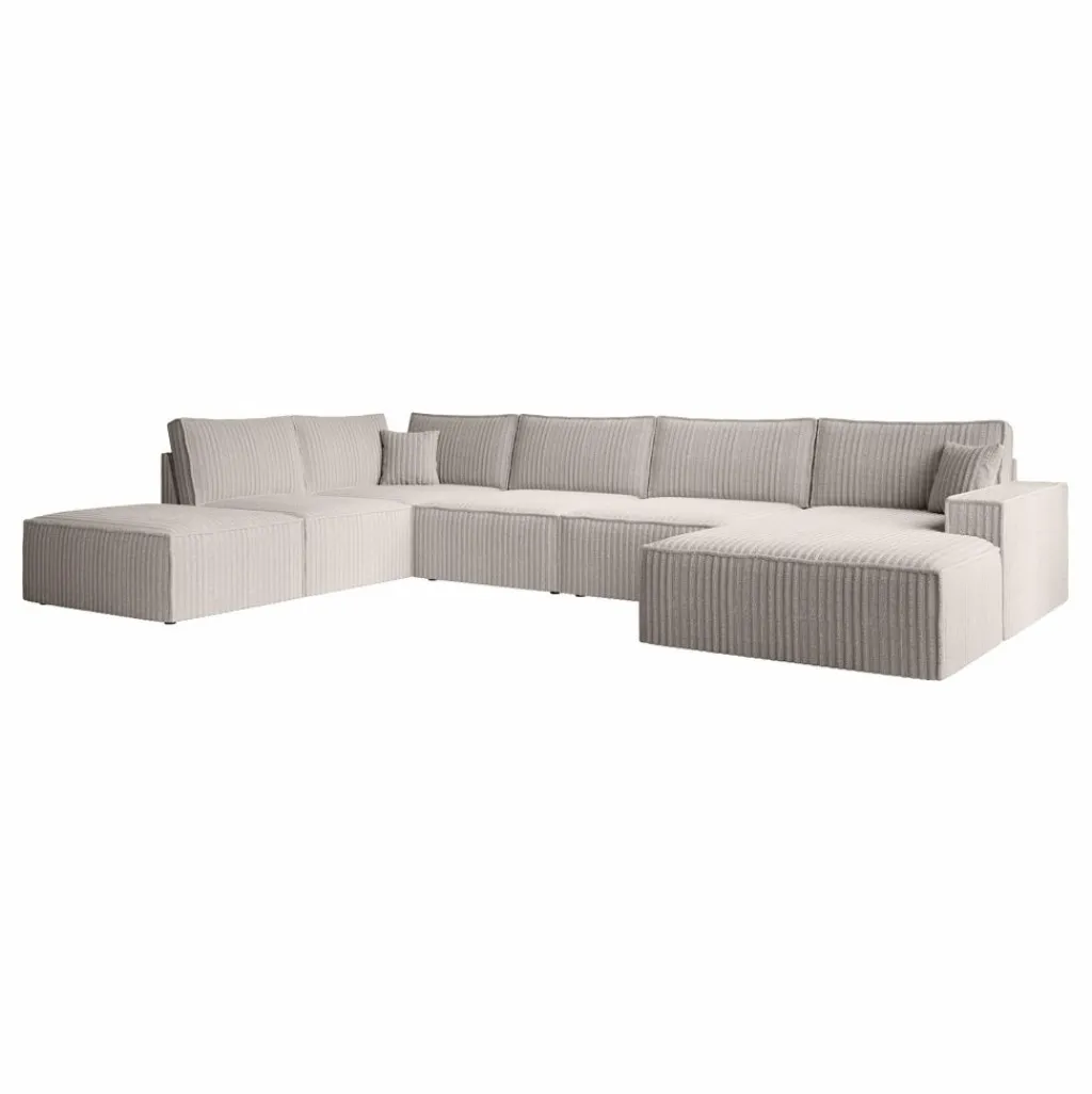 Hoekbank Manolo is een strakke, moderne hoekbank met een naar buiten gestikte siernaad op de randen. De Manolo is een U-vormige hoekbank en geschikt voor 6 tot 7 personen. Deze hoekbank beschikt over vaste zitkussens en grote, losse rugkussens. De bank bestaat uit een lounge-gedeelte, 2-zitsbank, hoekelement en 1,5 zitter. De bank staat op lage, kunststof pootjes.
