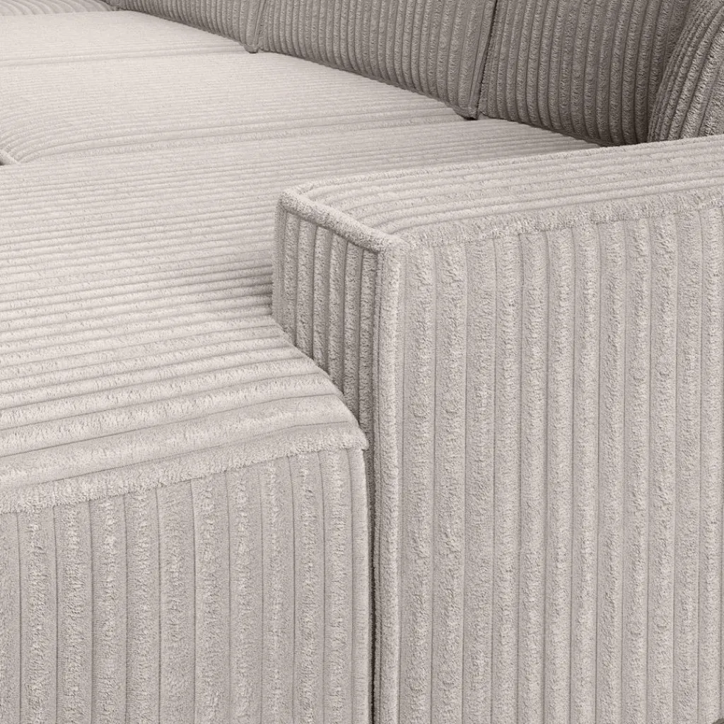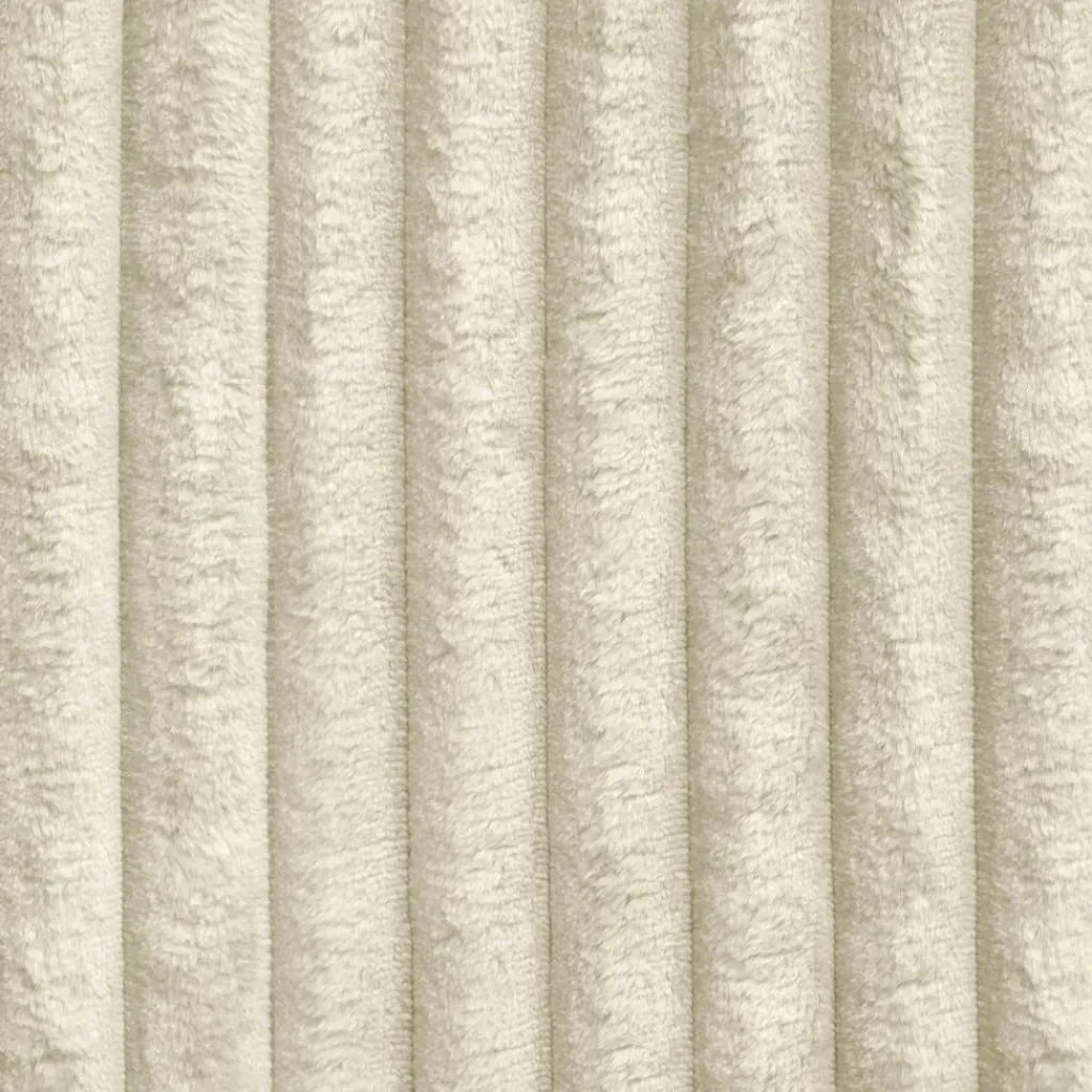 De bank is bekleed met ribstof met een aangename textuur die warmte en comfort uitstraalt. De ribstof, die een breedte van 2,5 cm per rib heeft, voelt zacht en fijn aan. De lage ronde poten zijn van kunststof gemaakt.