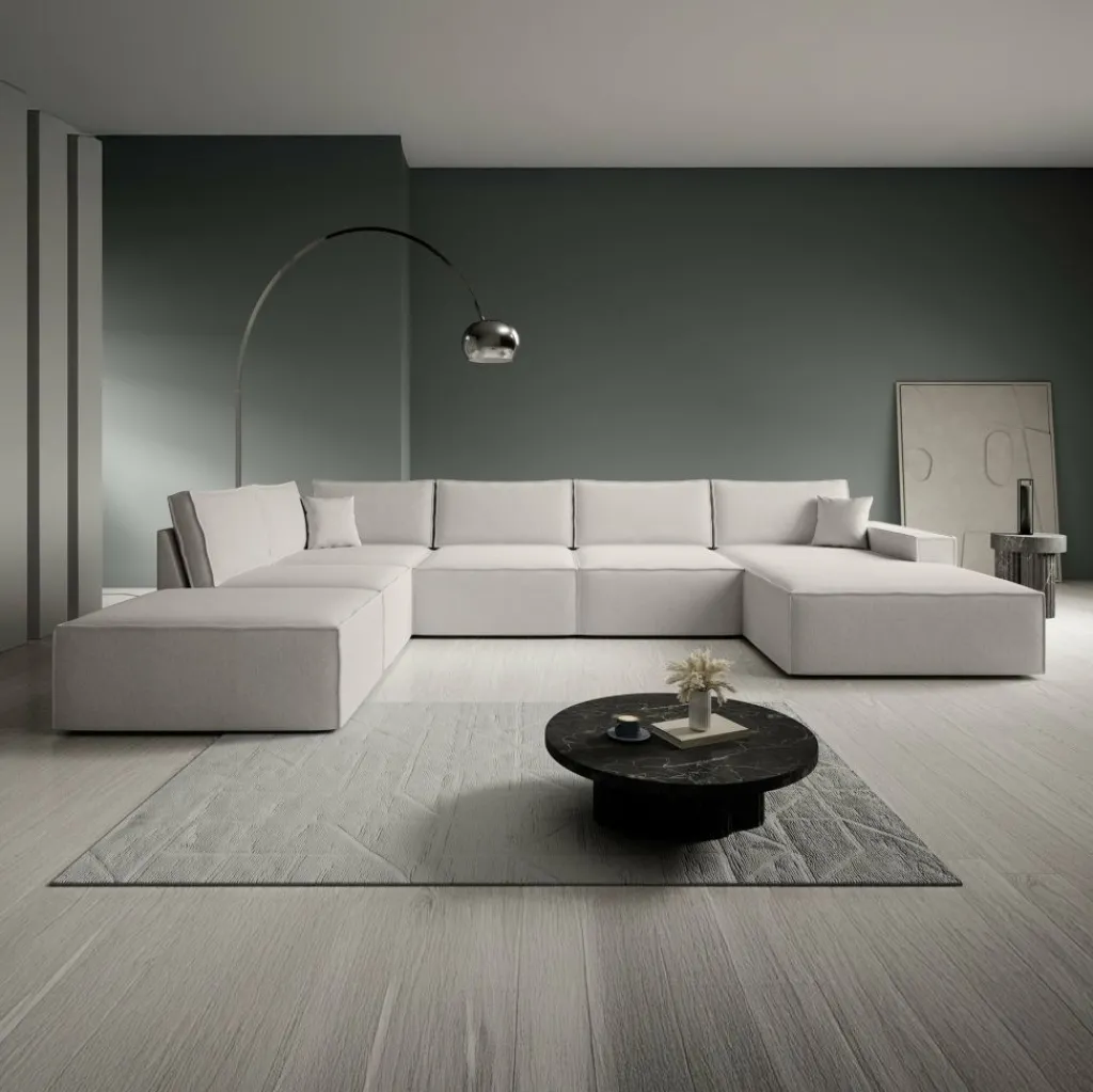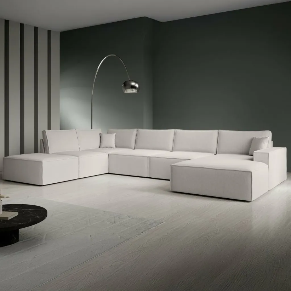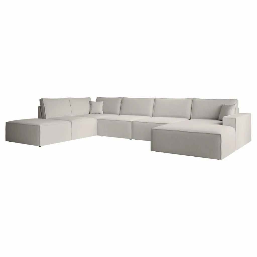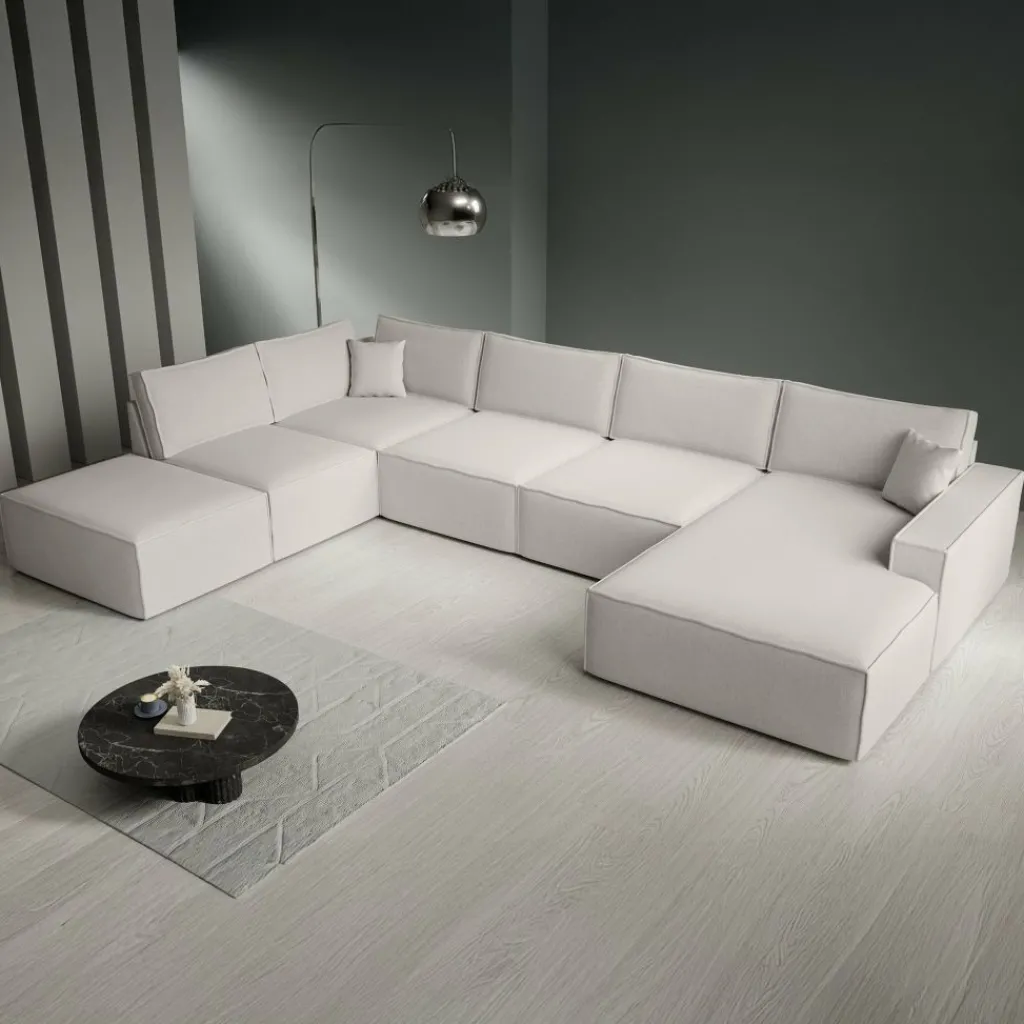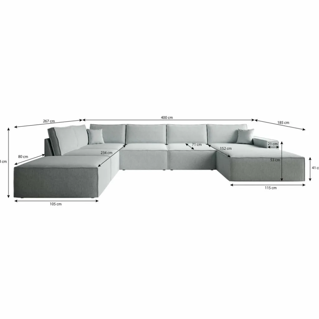 Hoekbank Manolo is een strakke, moderne hoekbank met een naar buiten gestikte siernaad op de randen. De Manolo is een U-vormige hoekbank en geschikt voor 6 tot 7 personen. Deze hoekbank beschikt over vaste zitkussens en grote, losse rugkussens. De bank bestaat uit een lounge-gedeelte, 2-zitsbank, hoekelement en 1,5 zitter. De bank staat op lage, kunststof pootjes.