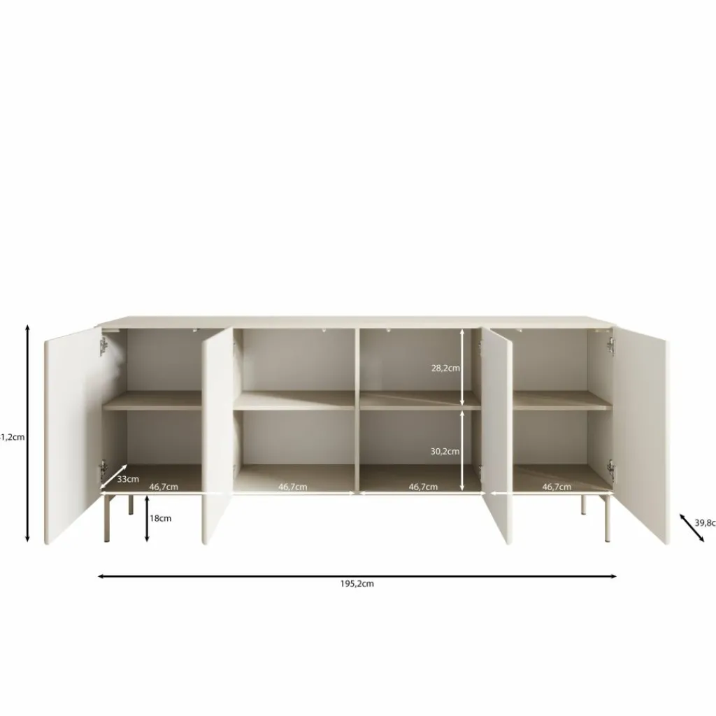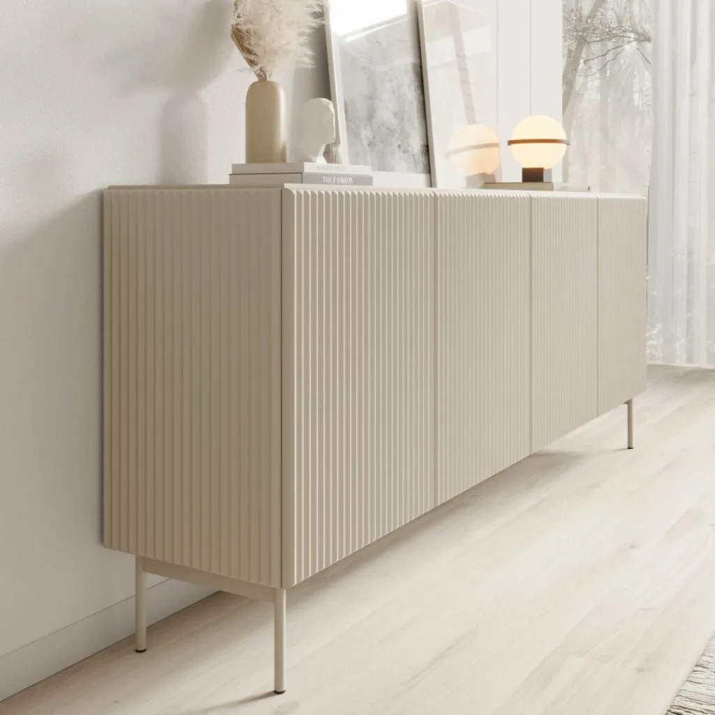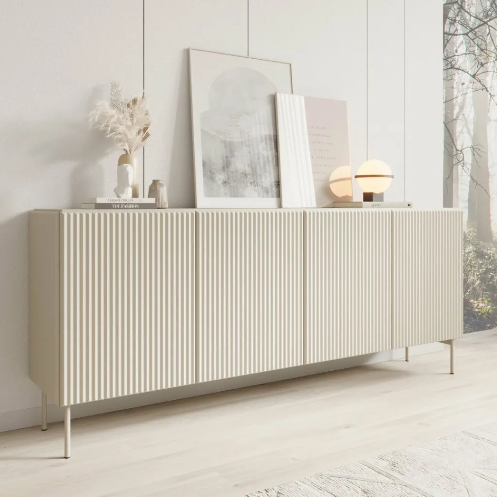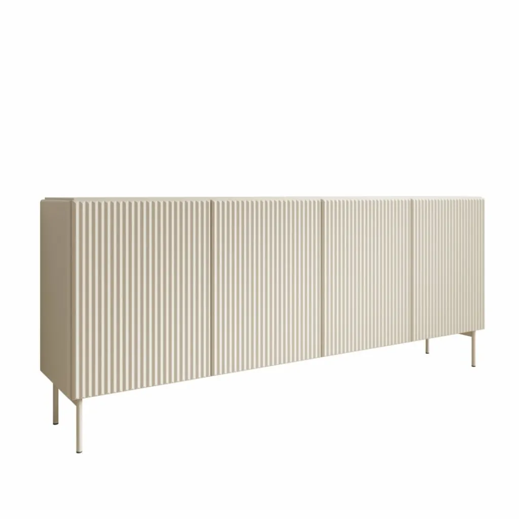 De vier deuren openen via geïntegreerde handgrepen en verbergen praktische opbergvakken. De verticale latstructuur geeft het front een stijlvolle, ritmische uitstraling, terwijl de beige kleur het geheel een elegante en tijdloze look geeft. Het dressoir staat op metalen poten voor extra stabiliteit en een luchtige uitstraling.