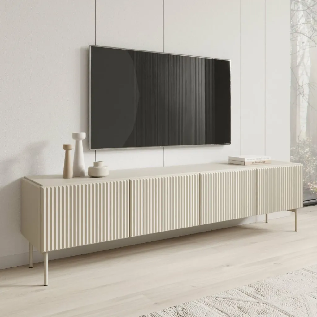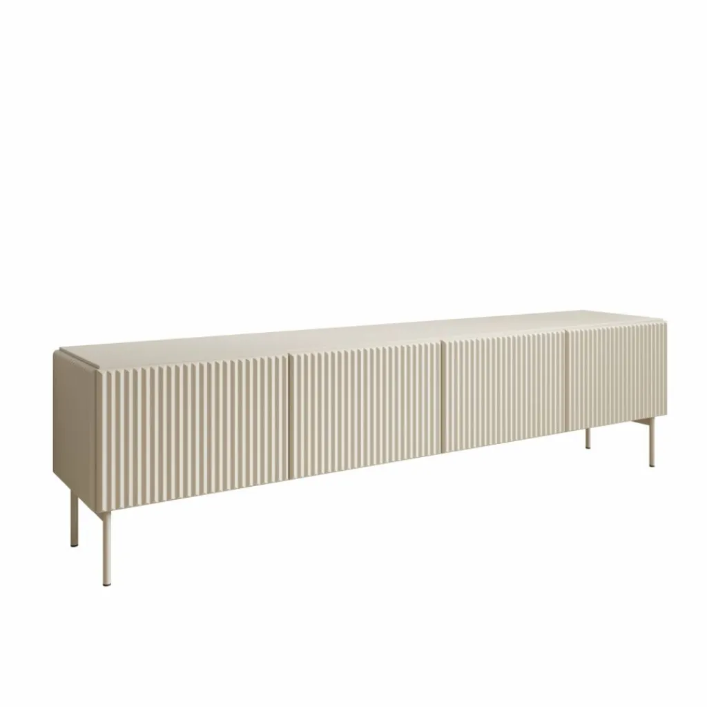 Het Marajo tv-meubel heeft een breedte van 195 cm, een diepte van 40 cm en een hoogte van 51 cm. De kast is uitgevoerd in beige en voorzien van vier deuren met een verticale latstructuur aan de voorzijde. Achter de deuren bevinden zich ruime vakken voor het opbergen van apparatuur, kabels en andere accessoires.