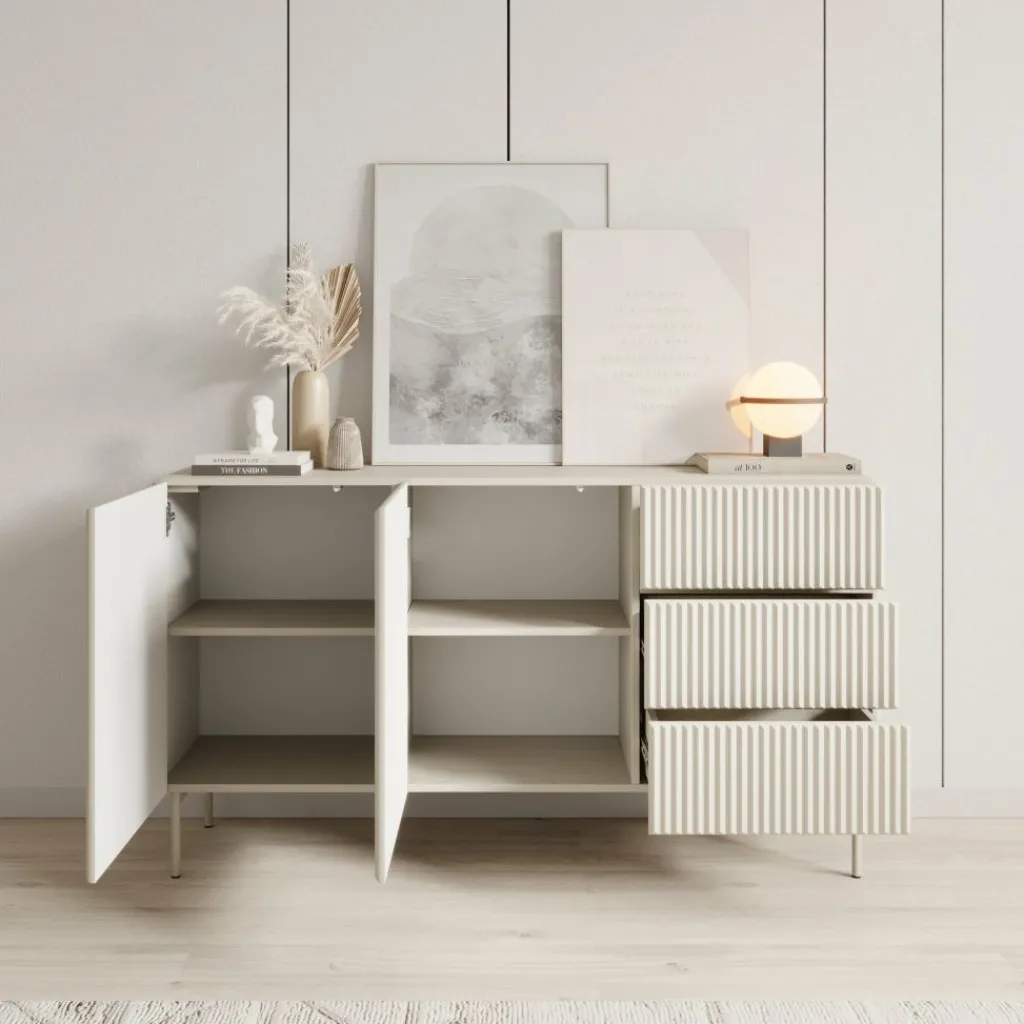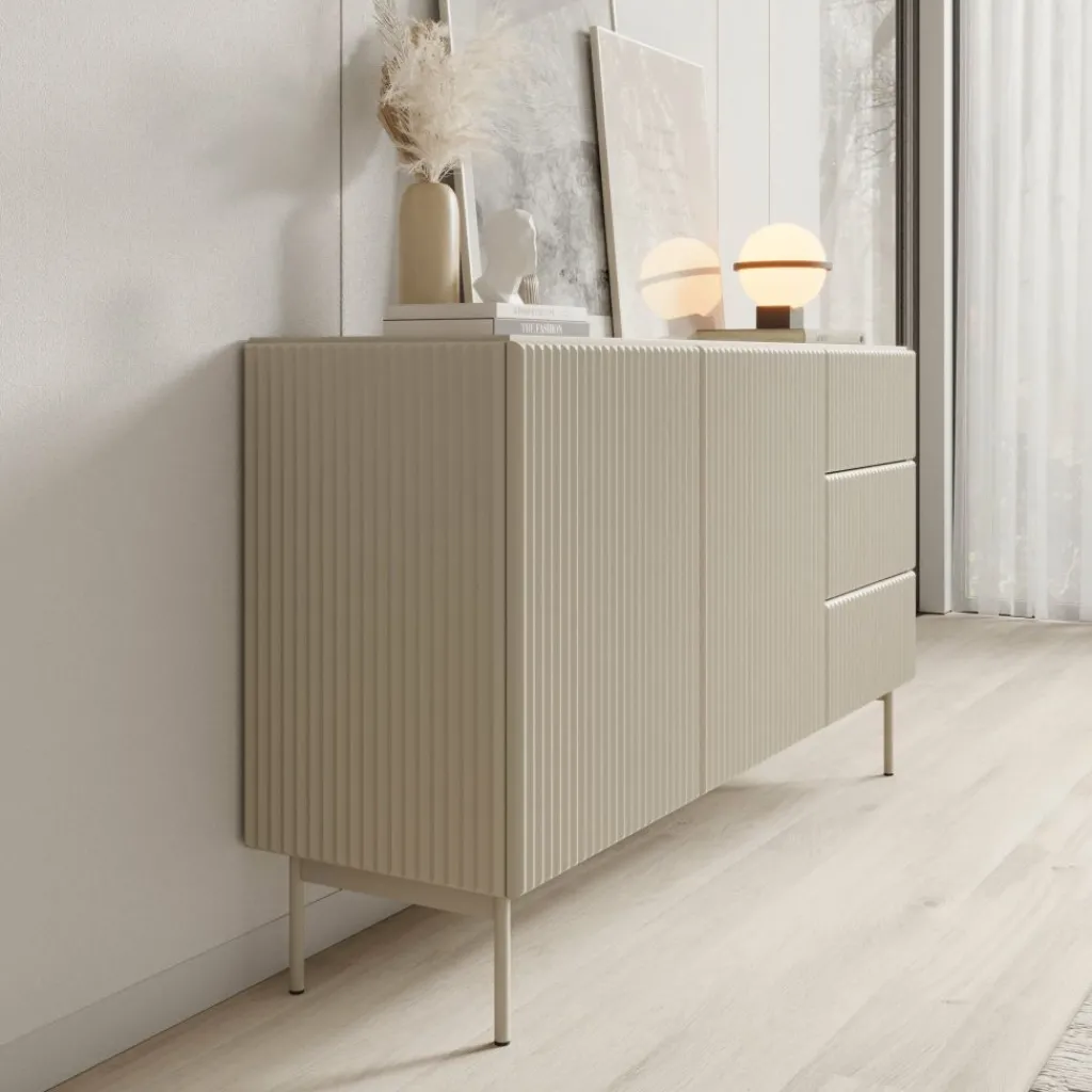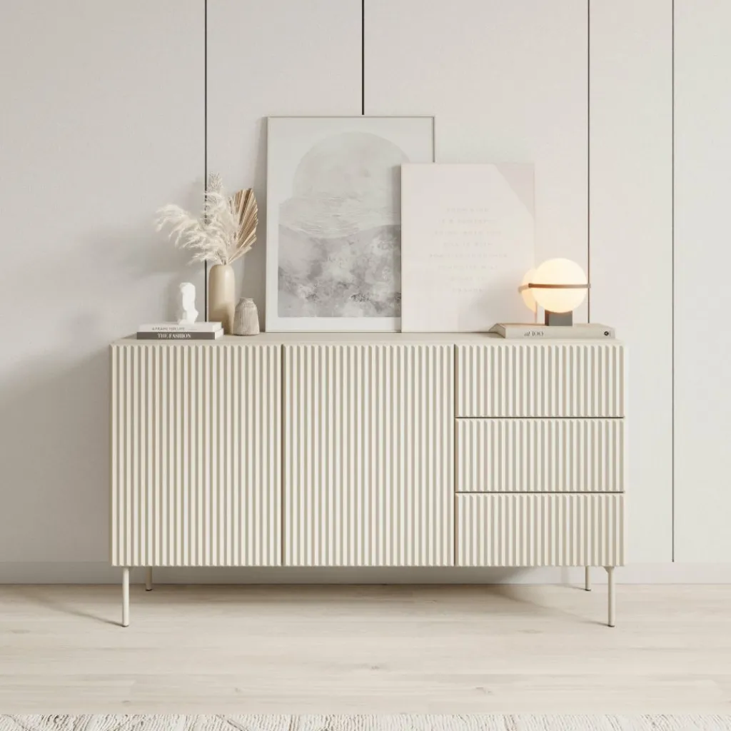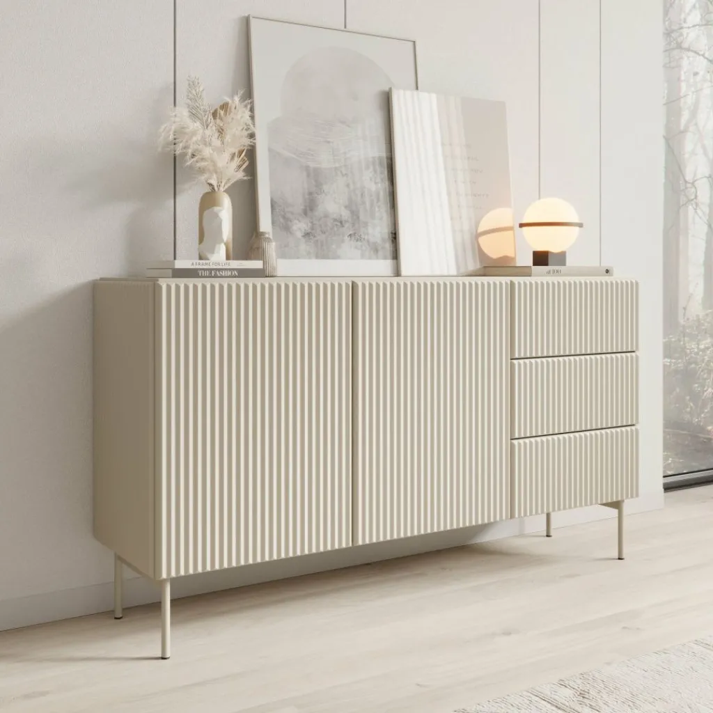 Het dressoir is uitgevoerd in beige plaatmateriaal met verticale latstructuur en staat op metalen poten voor extra stabiliteit.