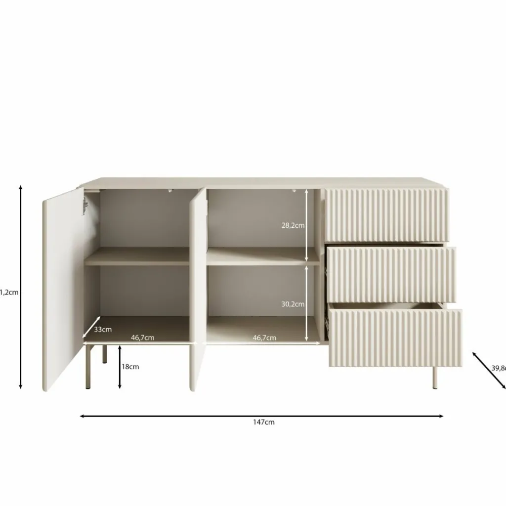 Het Marajo dressoir biedt praktische opbergruimte met twee deuren en drie ruime lades. Met een afmeting van 147 cm breed, 40 cm diep en 81 cm hoog is het meubel geschikt voor verschillende woonruimtes. De deuren en lades openen via geïntegreerde handgrepen en sluiten zacht dankzij het solide scharnierwerk.