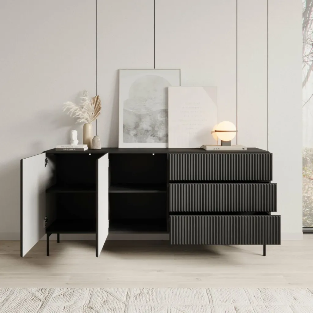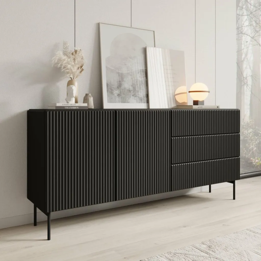 De verticale latstructuur op de fronten geeft het meubel een strak lijnenspel, terwijl de zwarte afwerking zorgt voor een moderne uitstraling. De metalen poten dragen bij aan de stevigheid en stabiliteit van het geheel. De deuren en lades openen eenvoudig via geïntegreerde handgrepen.