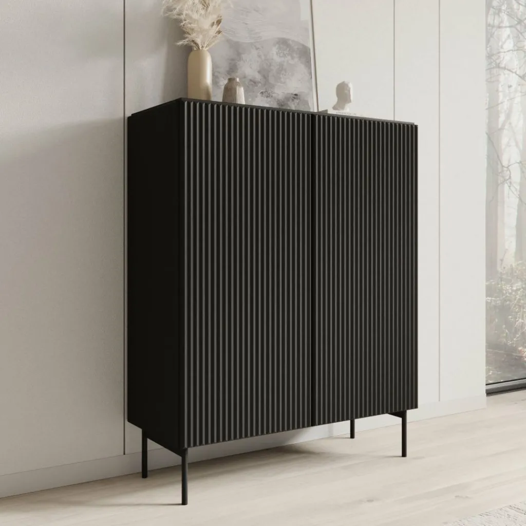 Het Marajo dressoir heeft een strak design met een opvallend front voorzien van verticale latstructuur. De zwarte afwerking geeft het meubel een rustige en moderne uitstraling die goed past in diverse interieurs.