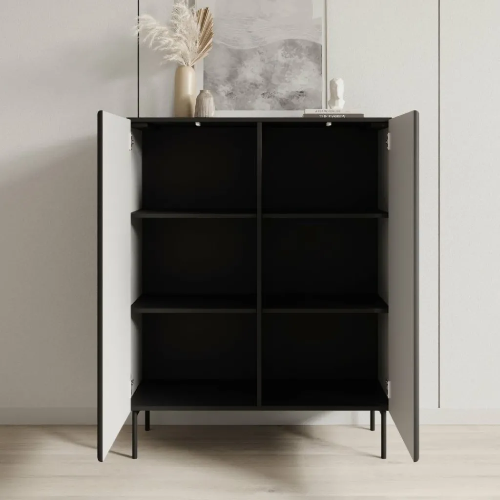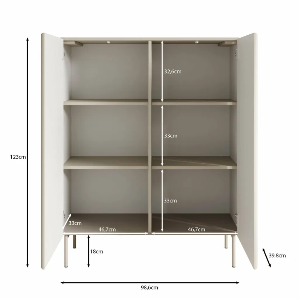 Met een breedte van 99 cm, diepte van 40 cm en hoogte van 123 cm biedt het dressoir voldoende ruimte voor het opbergen van servies, glaswerk of andere spullen. Achter de twee deuren bevinden zich praktische legvakken die helpen alles netjes geordend te houden.