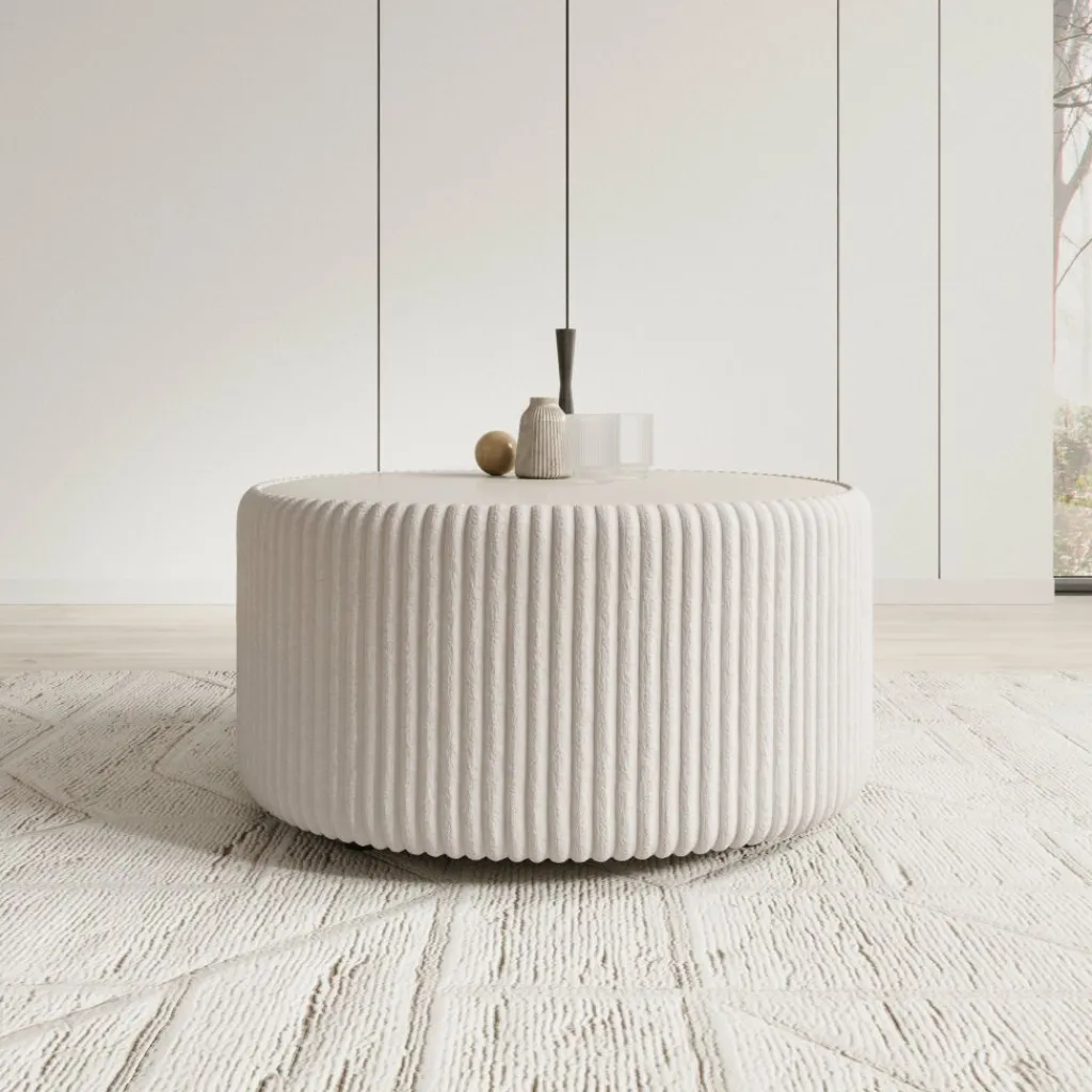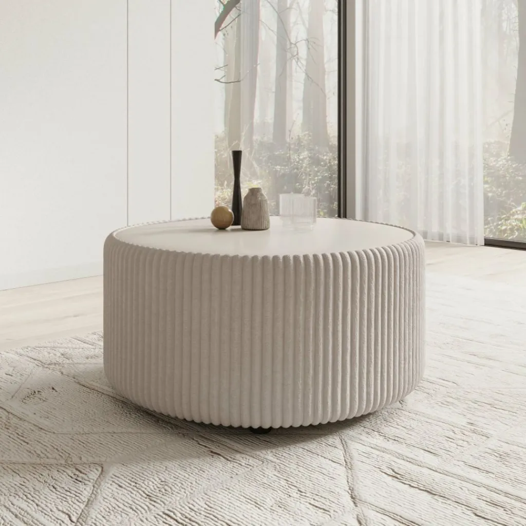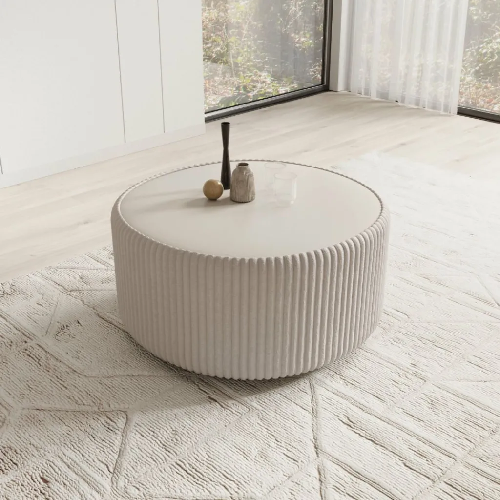 De tafel is rondom bekleed met witte fluffy ribstof die direct opvalt door de duidelijke structuur. Het verticale ribpatroon loopt volledig rondom door en contrasteert met het glad afgewerkte bovenblad. Dankzij de afgeronde hoeken blijft de tafel prettig in gebruik binnen de loopruimte.