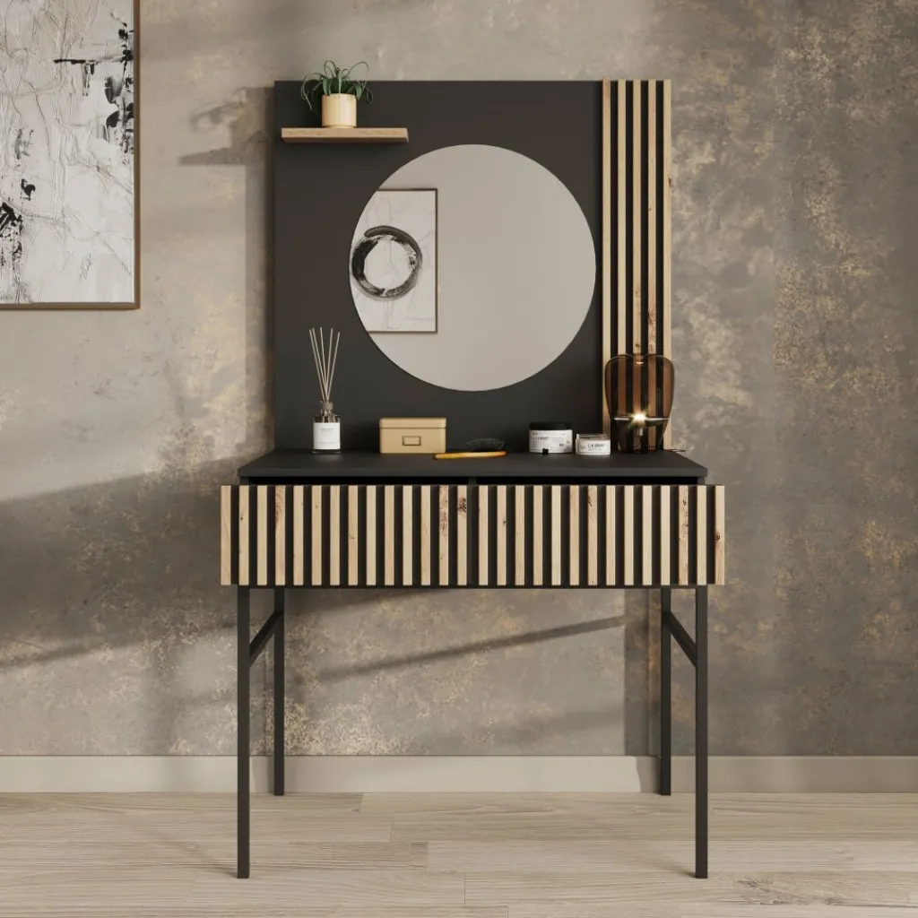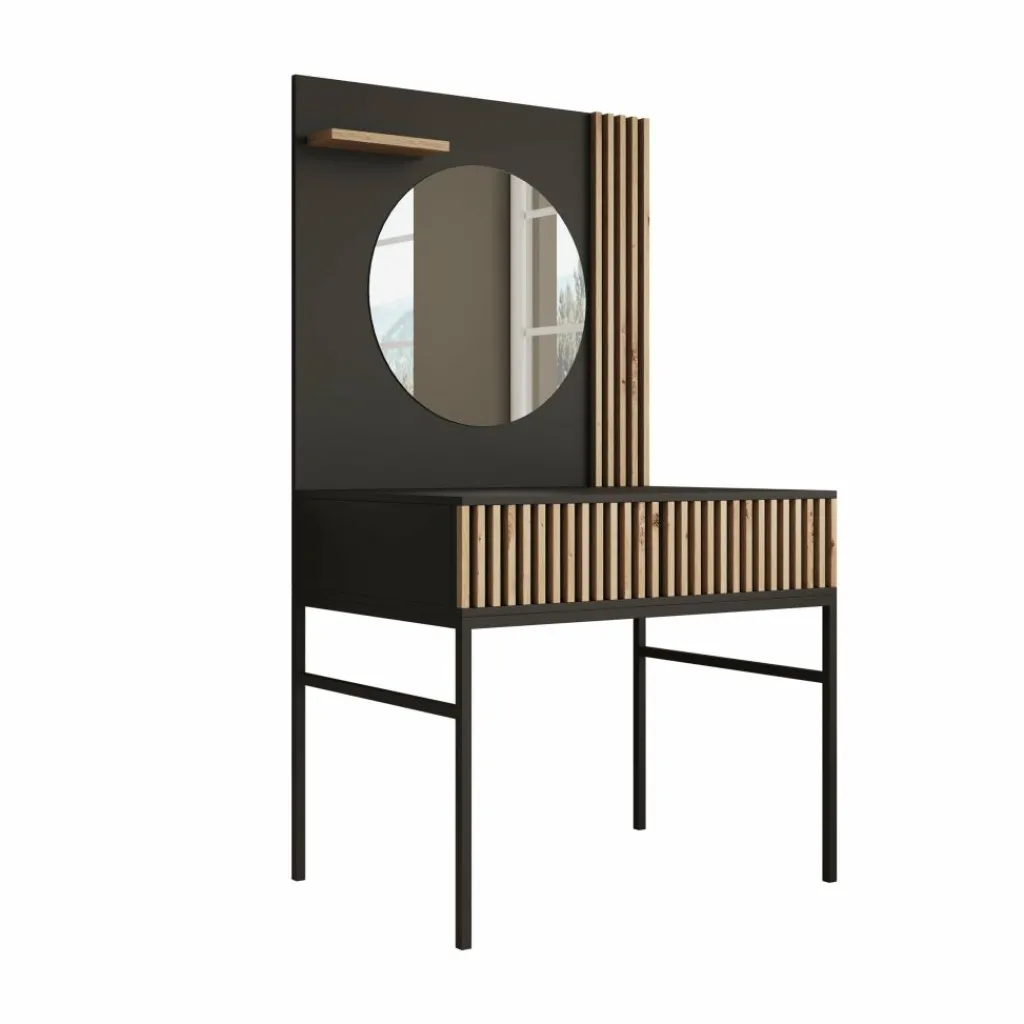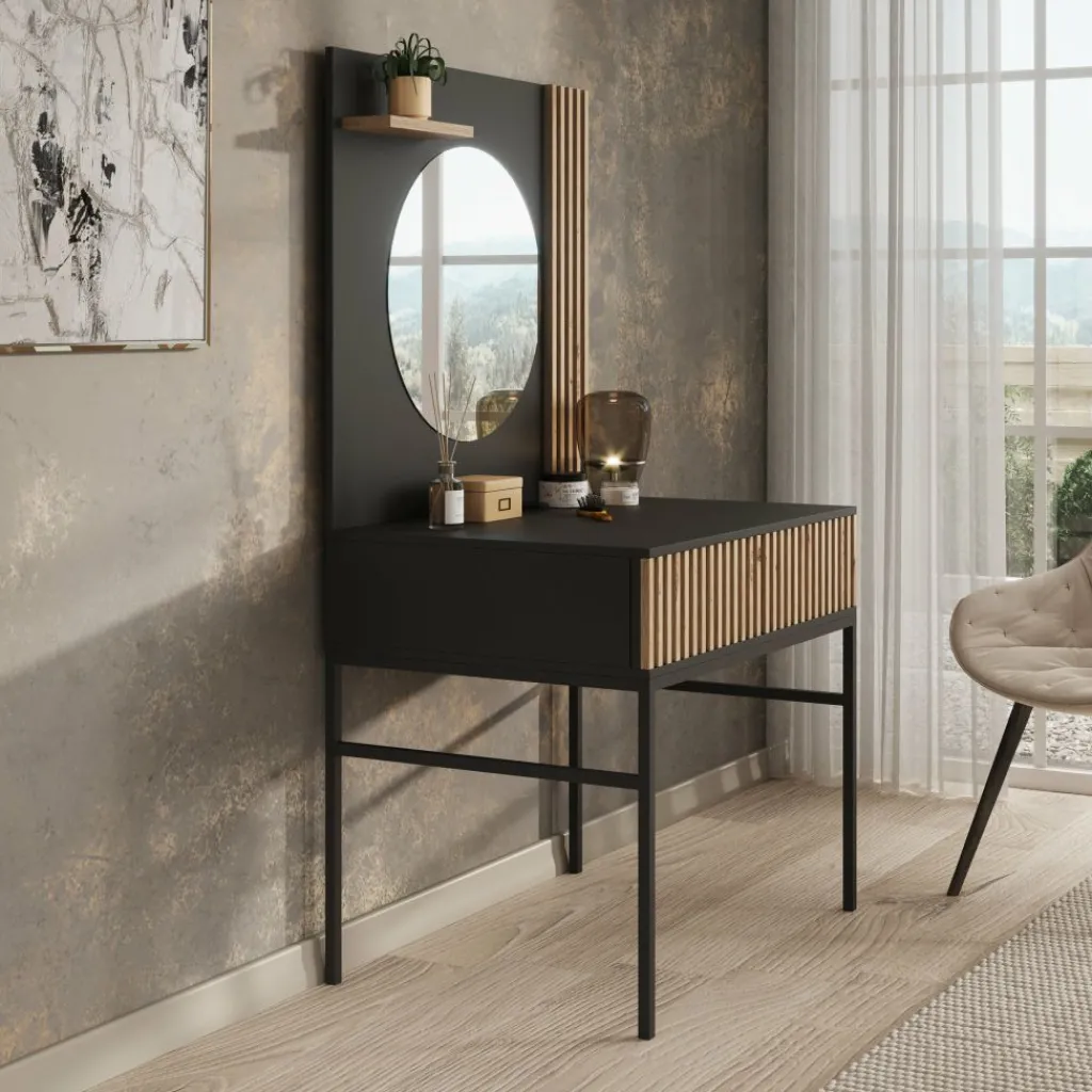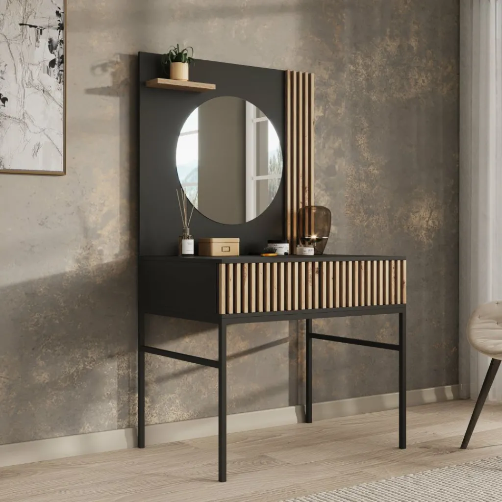 Kaptafel Marbella is moderne, industriële kaptafel uitgevoerd in een zwarte kleur. De kaptafel beschikt over een greeploze opberglade waarvan de voorkant eiken kleurige latjes heeft. Het blad is 85×38 cm en biedt daardoor genoeg plek voor alle make-up, sieraden en accessoires. Ook beschikt de Marbella over een mooie zwarte achterwand met latjes waar een ronde spiegel op is geplaatst. Ten slotte staat dit meubel op een metalen onderstel.