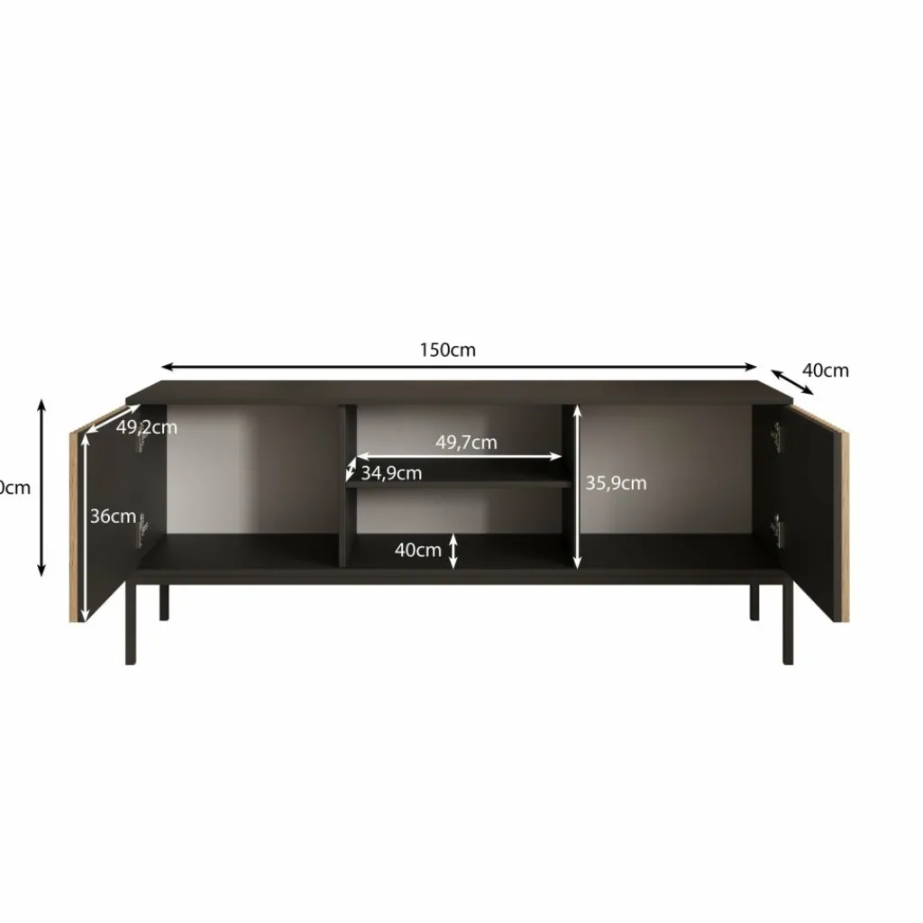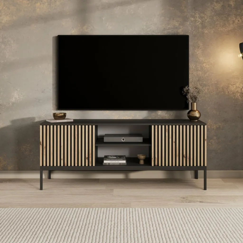 TV-Meubel Marbella is een opbergkast voor onder de tv in een moderne, industriële stijl. De TV-kast is gemaakt in een mat zwarte kleur. De Marbella beschikt over 2 open vakken en 2 deuren. Deze deuren hebben op de voorkant eiken kleurige latjes. De kast staat op een metalen onderstel. Er zit geen uitsparing voor bedrading in de achterwand van dit meubel.