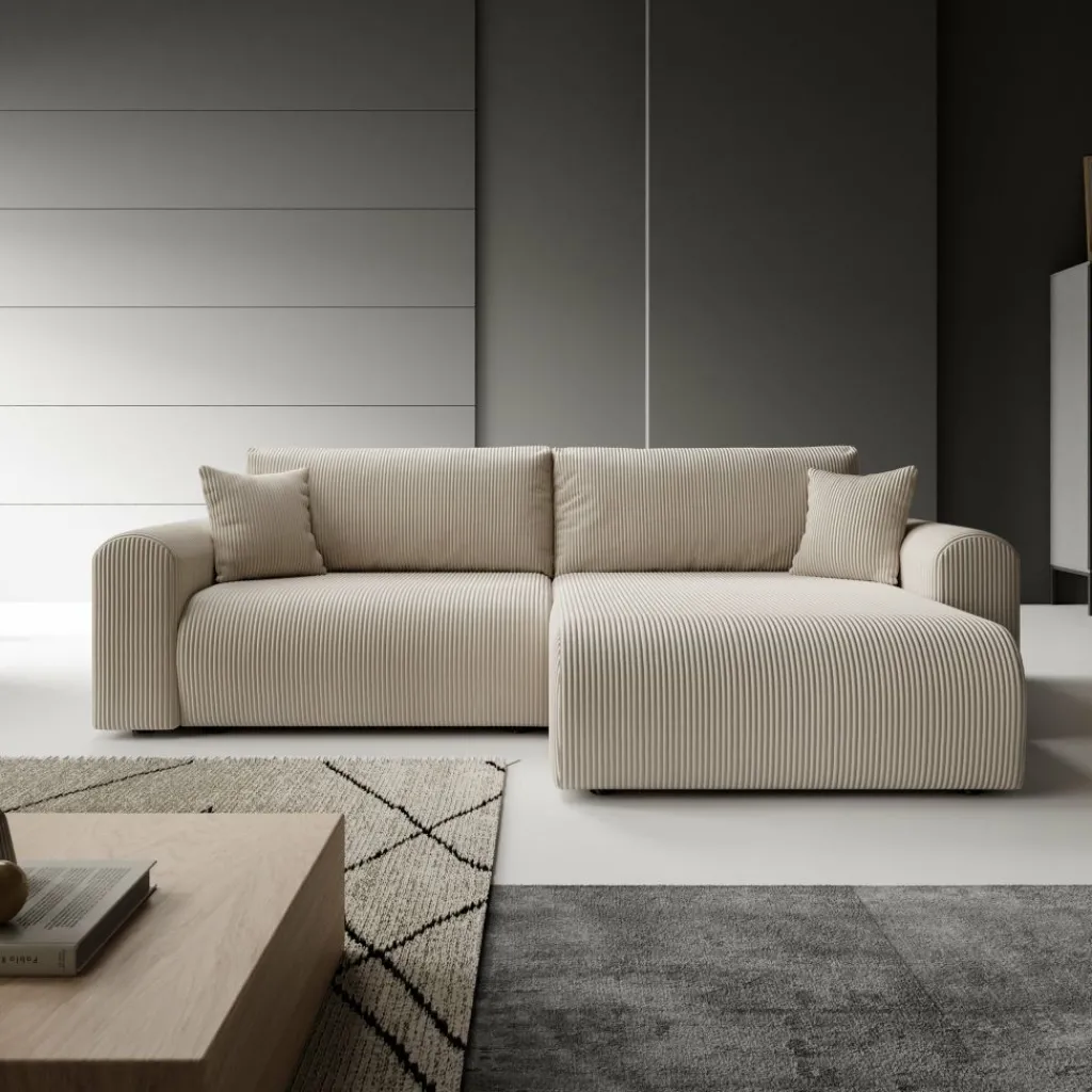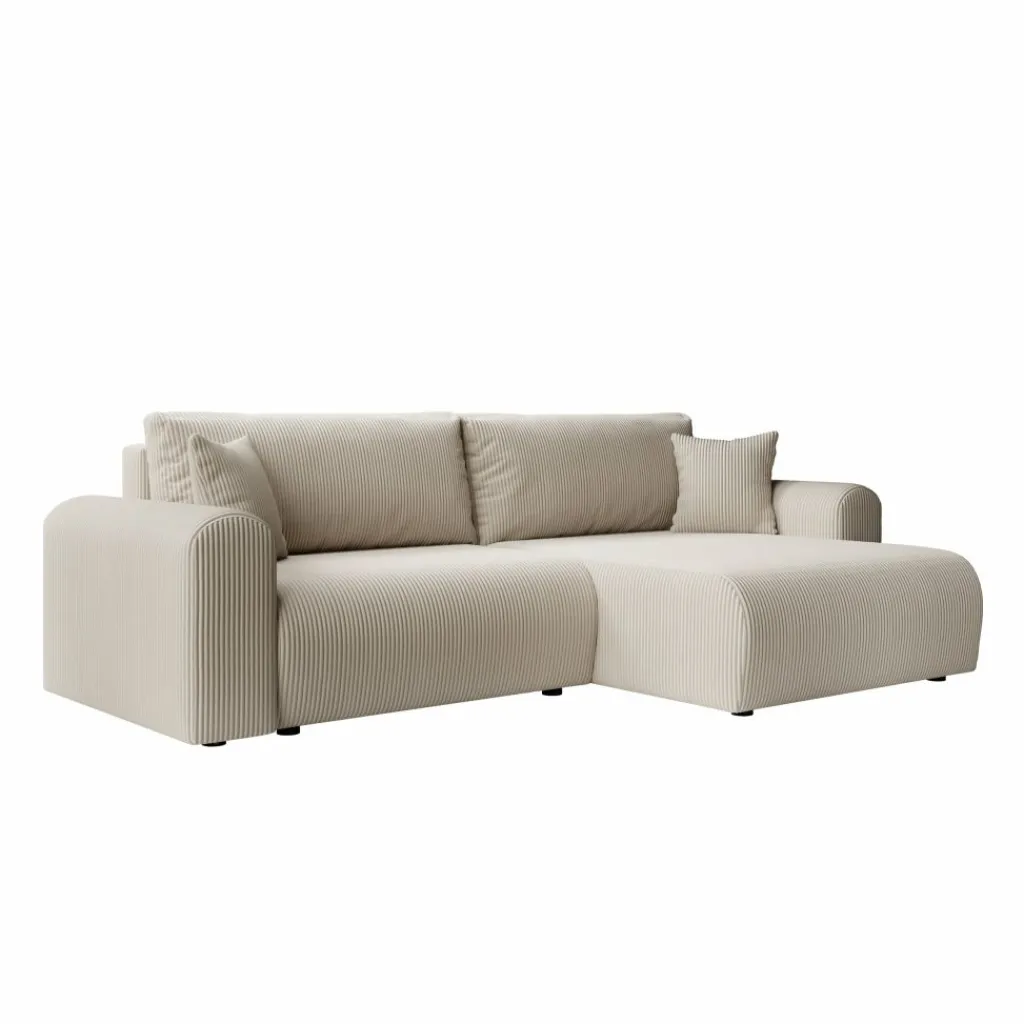 De Marcelli hoekbank is uitgevoerd in een beige ribstof en heeft een moderne vormgeving met afgeronde armleuningen. De bank biedt een comfortabele zitplaats voor drie personen en past dankzij het neutrale kleurgebruik in verschillende interieurstijlen. Bij dit model bevindt de chaise longue zich aan de rechterkant.