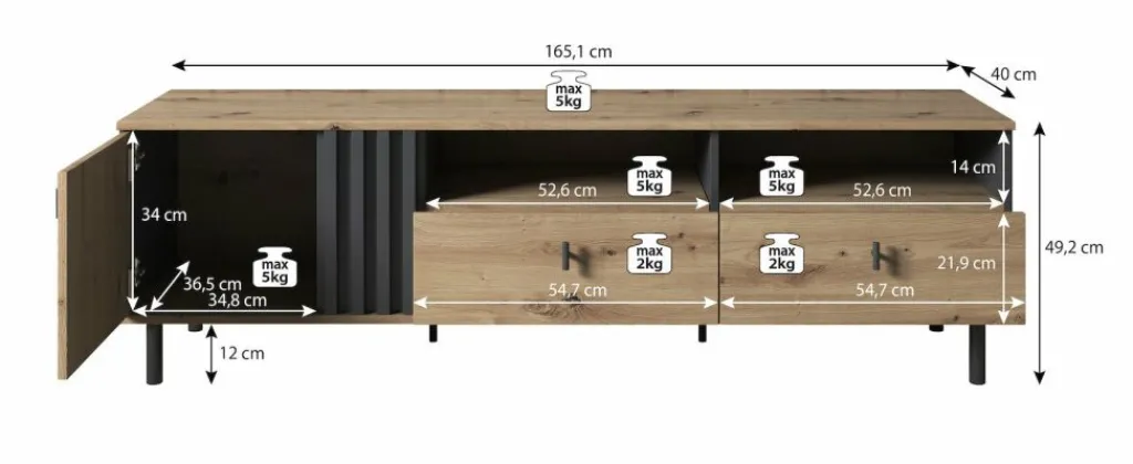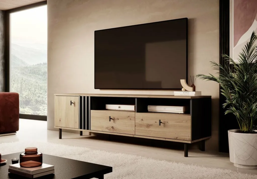 Tv-meubel Marcos is een praktisch vormgegeven dressoir met handige opbergmogelijkheden. Het tv-meubel beschikt over een opbergvak welke af te sluiten is met een klepdeur. Rechts bevinden zich twee open schappen, geschikt voor receivers. Daaronder zitten twee handige opberglades.