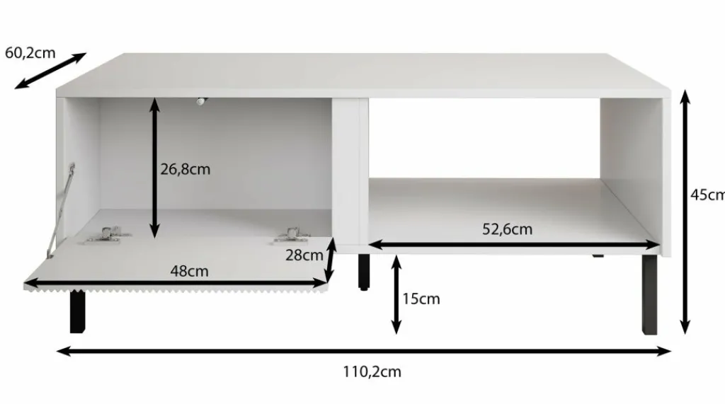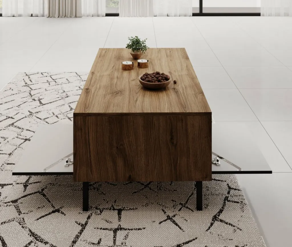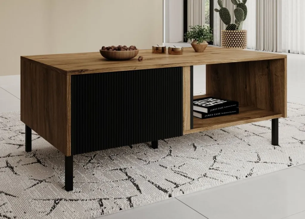 Salontafel Margareth is een rechthoekige salontafel met een moderne uitstraling. De tafel beschikt over 2 kleppen die op de voorkant een latten patroon hebben. De kleppen zijn te openen met het push to open systeem. Daarnaast zit een groot open vak. Het meubel staat op metalen pootjes. De Margareth is uitgevoerd in een eiken kleur met zwart.