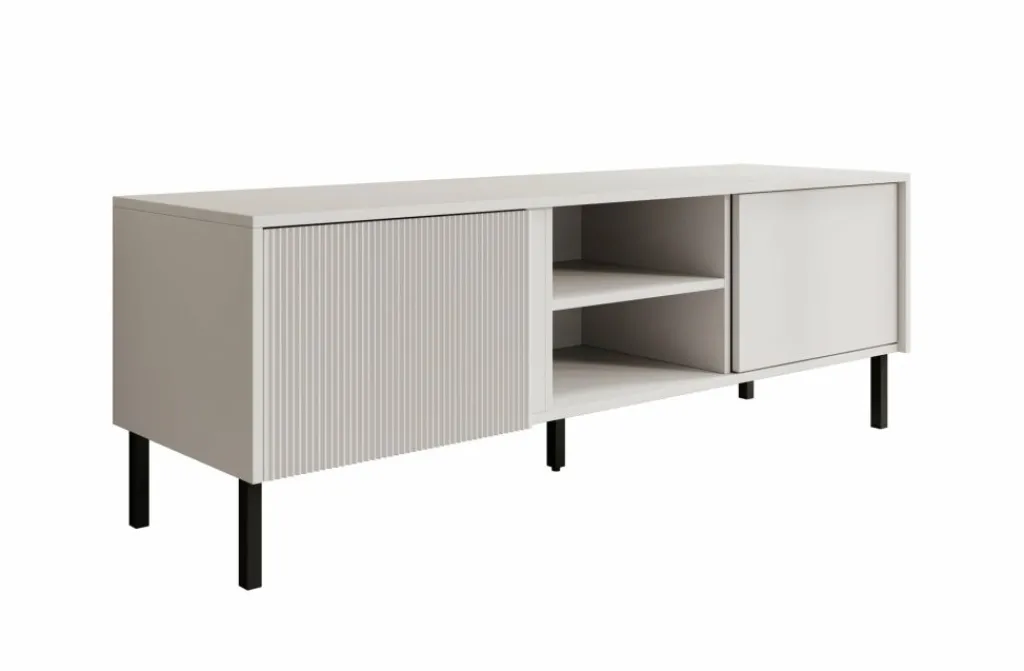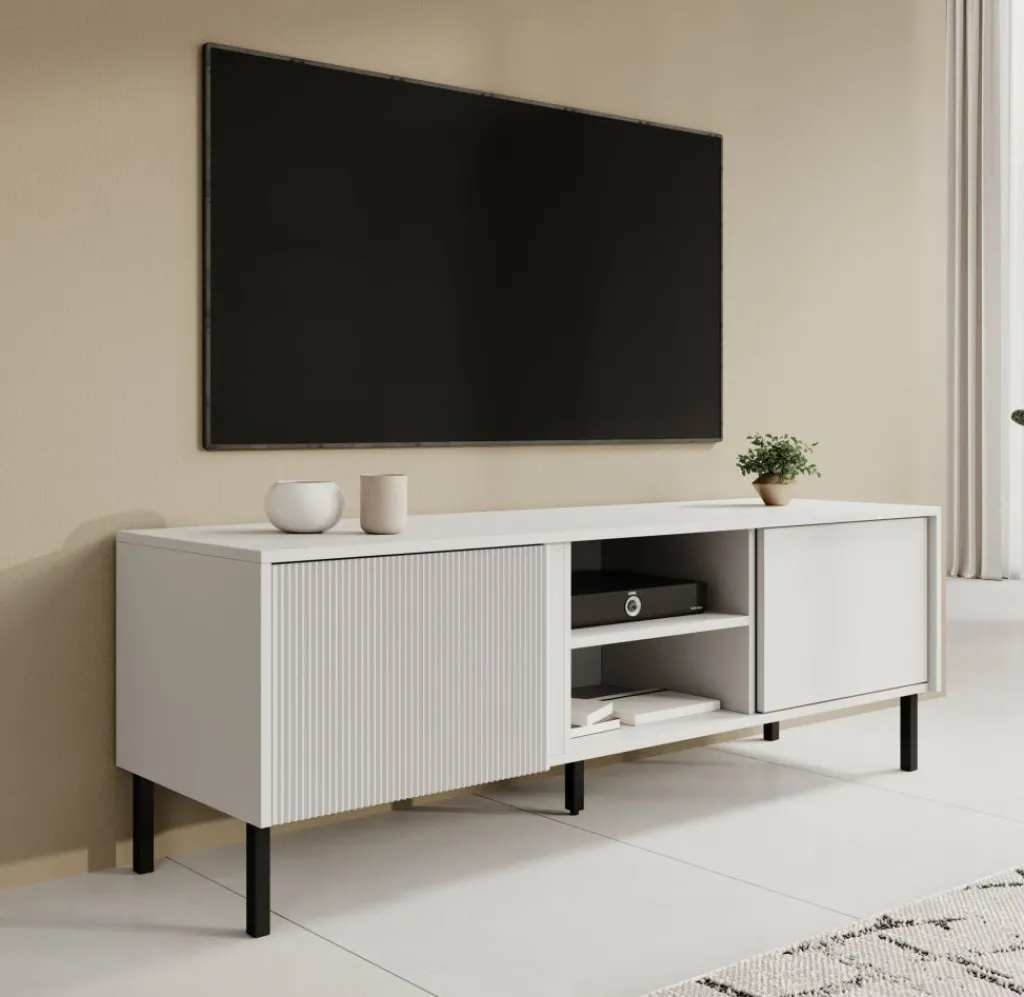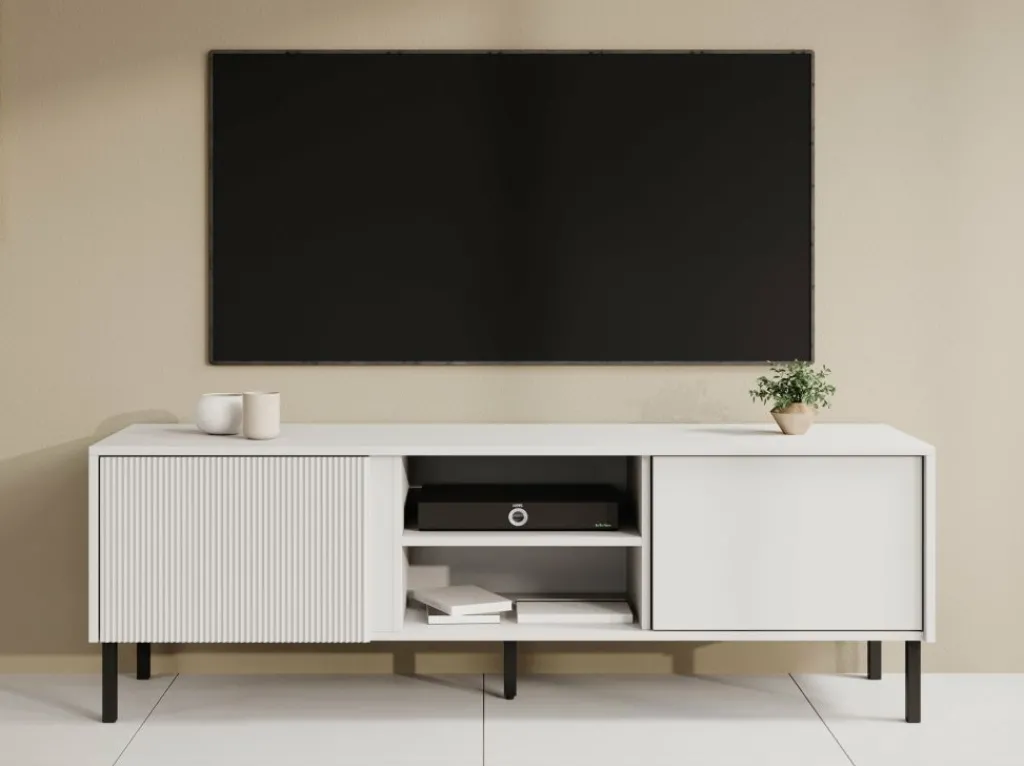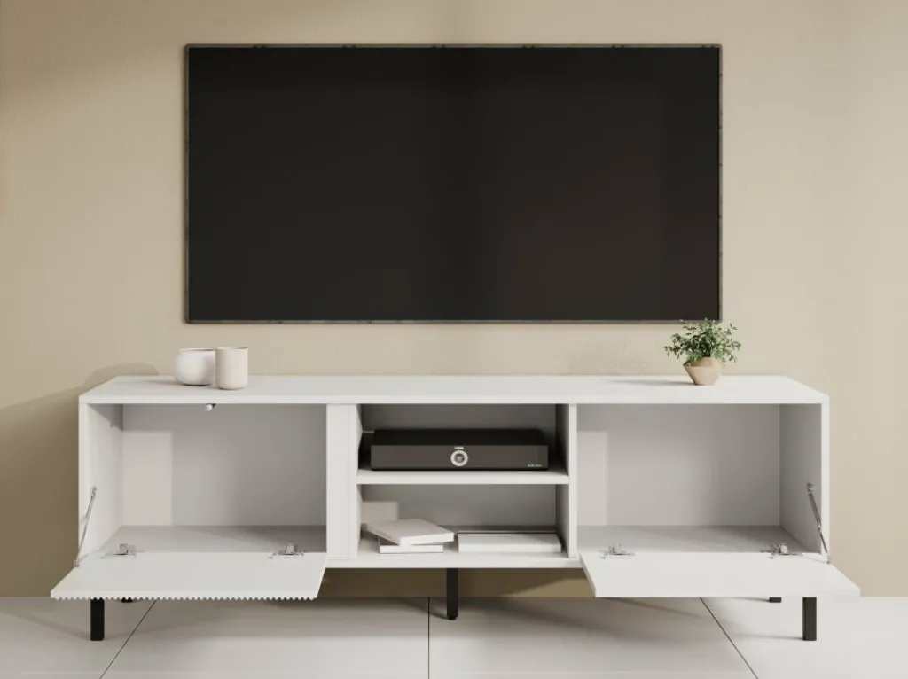 TV-Meubel Margareth is een opbergkast voor onder de tv in een moderne stijl. De TV-kast is gemaakt in een witte kleur. De Margareth beschikt over 2 open vakken en 2 kleppen die openen met het push to open systeem. De linker klep heeft op de voorkant een latten patroon. De kast staat op metalen pootjes en er zit geen uitsparing voor bedrading in de achterwand van dit meubel.