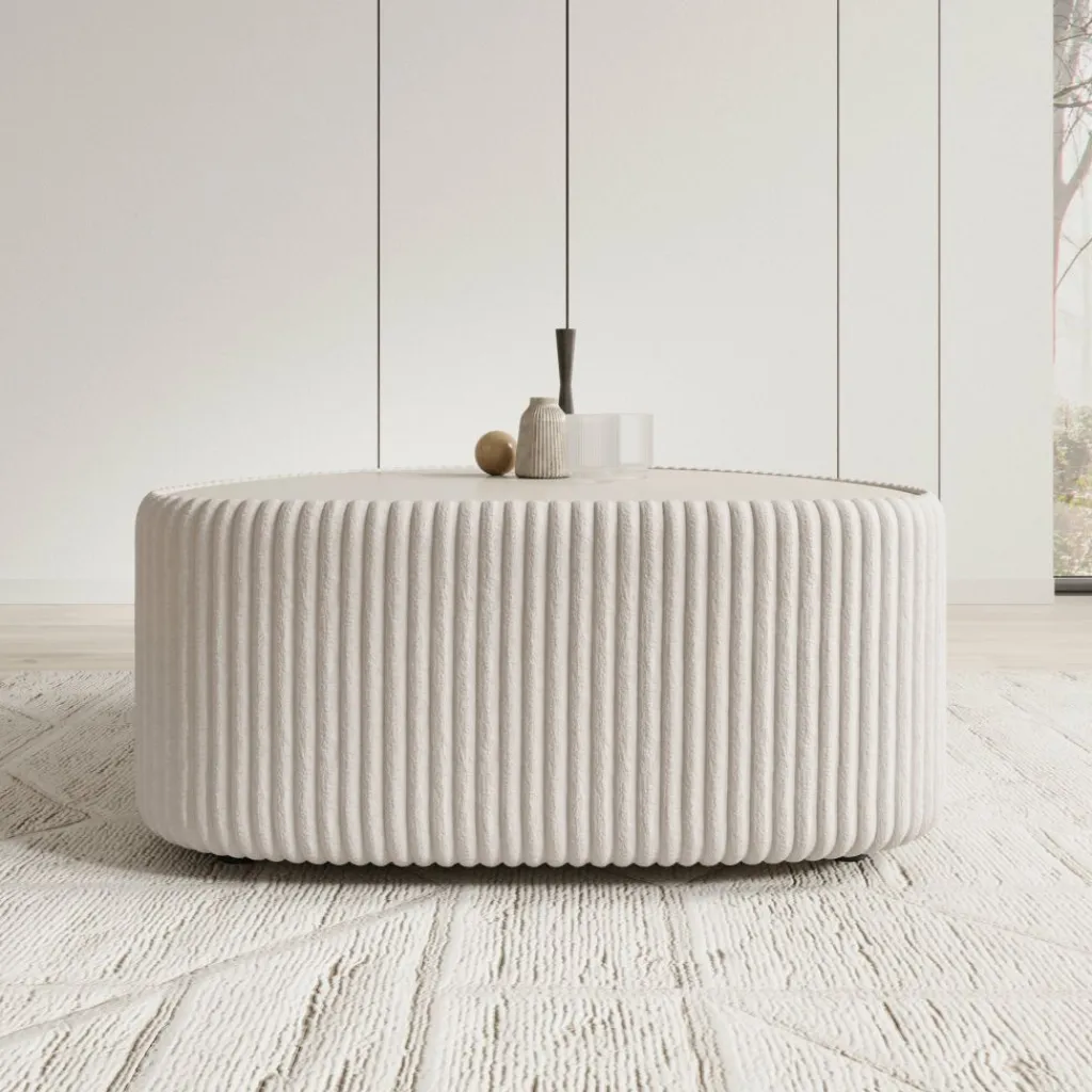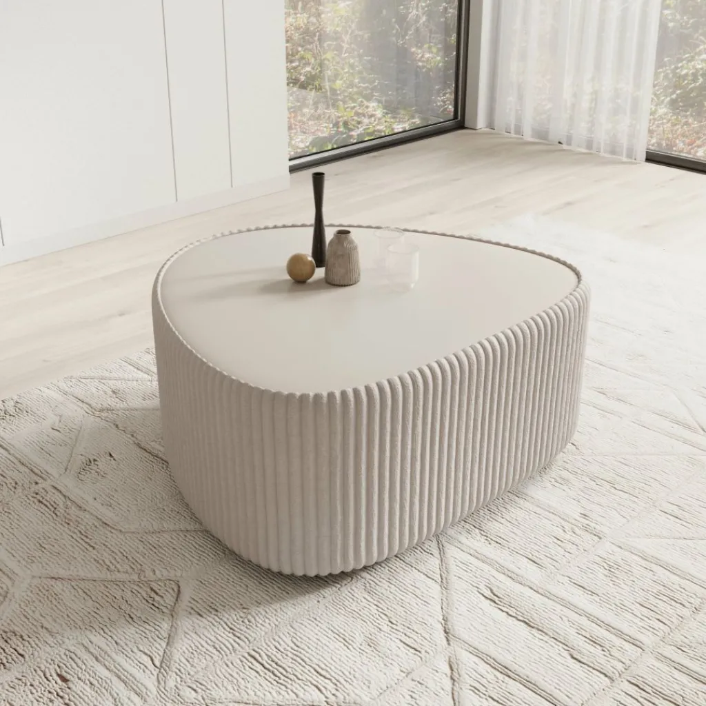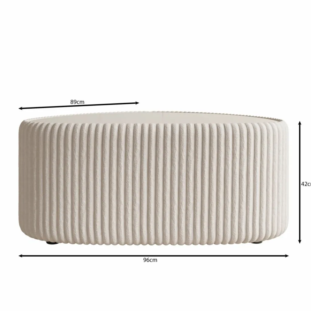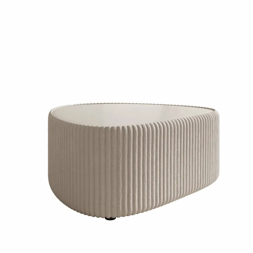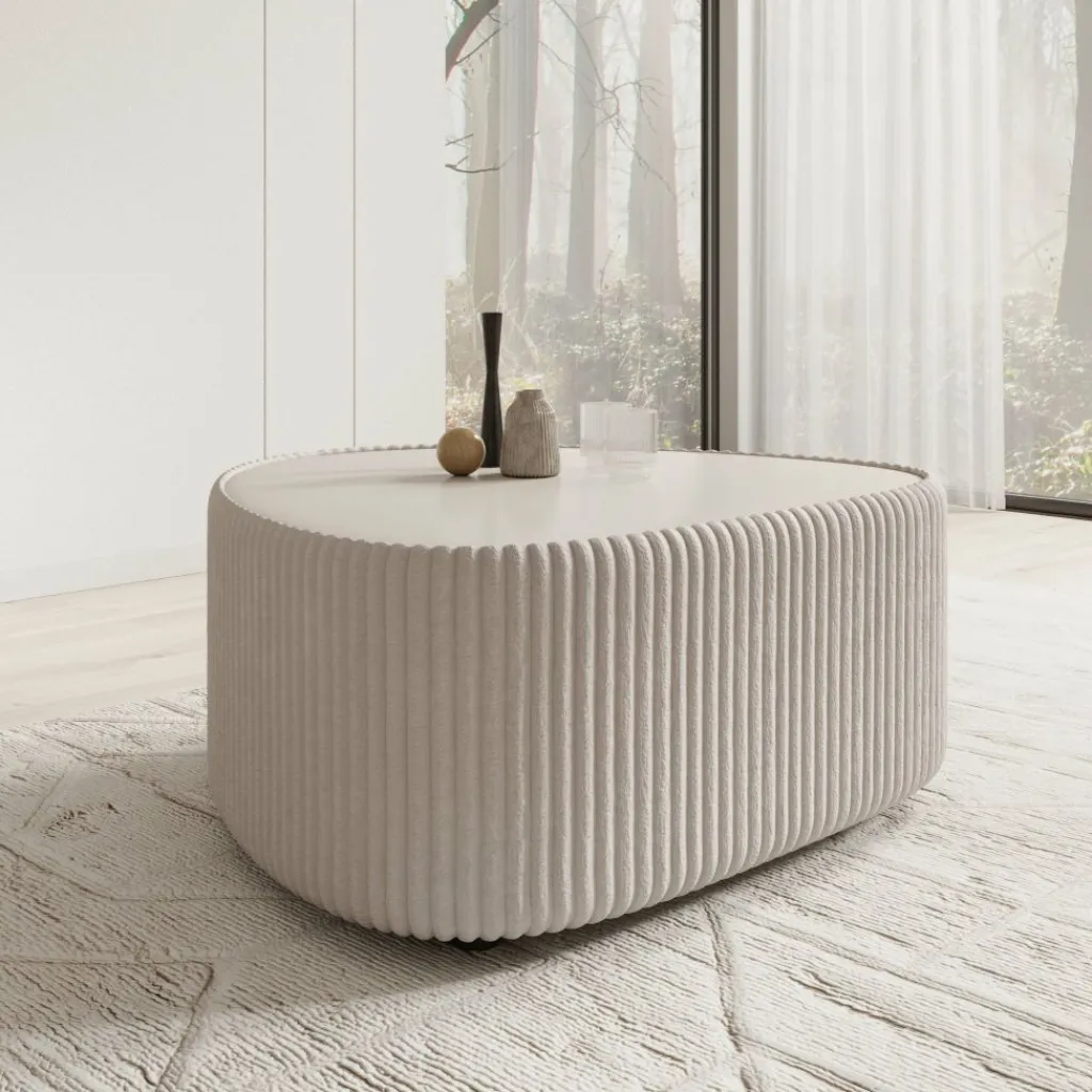 De tafel is rondom bekleed met een witte fluffy ribstof die het meubel een herkenbare structuur geeft. Het verticale ribpatroon loopt volledig rondom door en vormt samen met het glad afgewerkte bovenblad een duidelijk contrast. Dankzij de afgeronde hoeken oogt de tafel vriendelijk en praktisch in gebruik binnen de loopruimte.