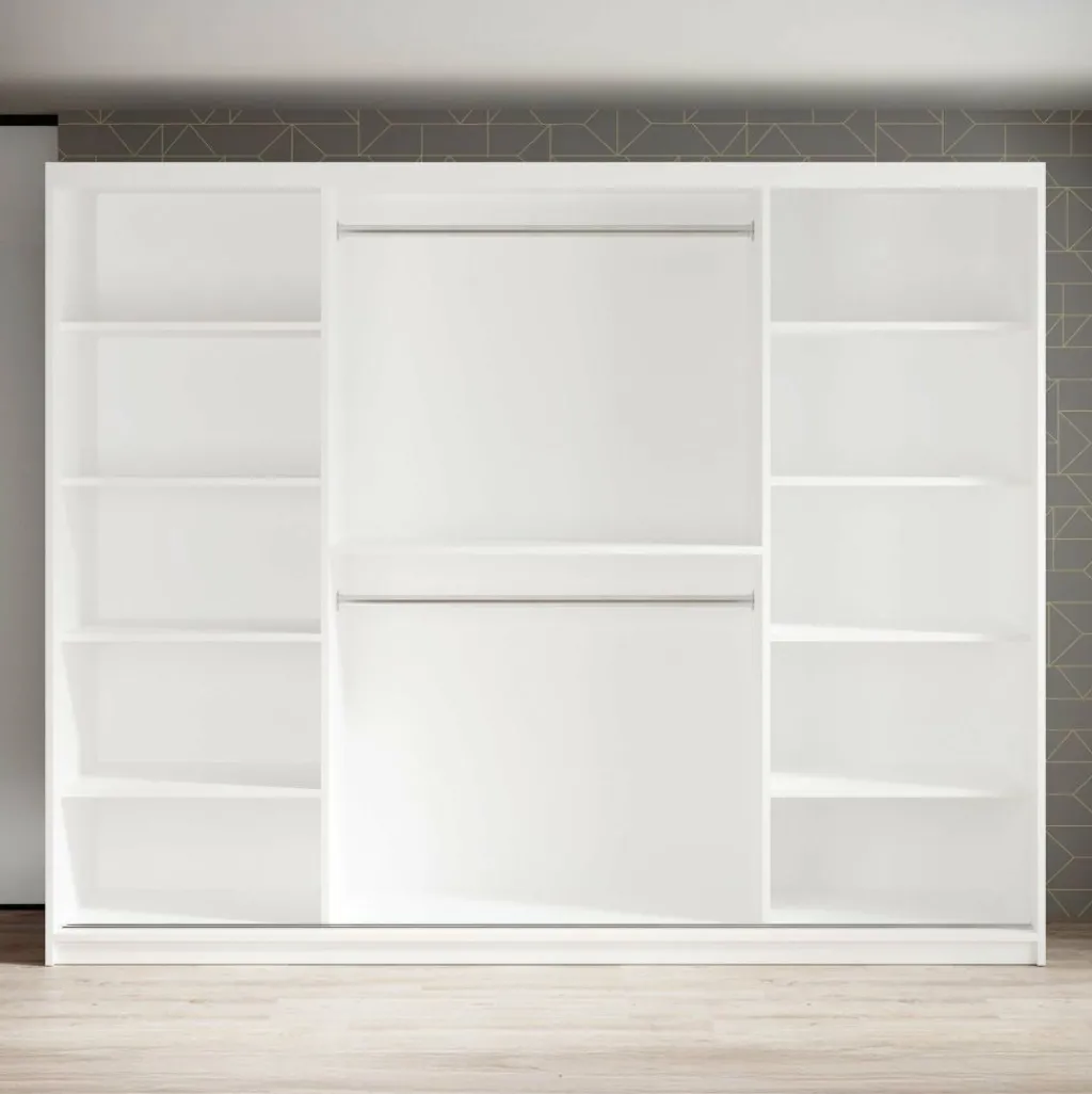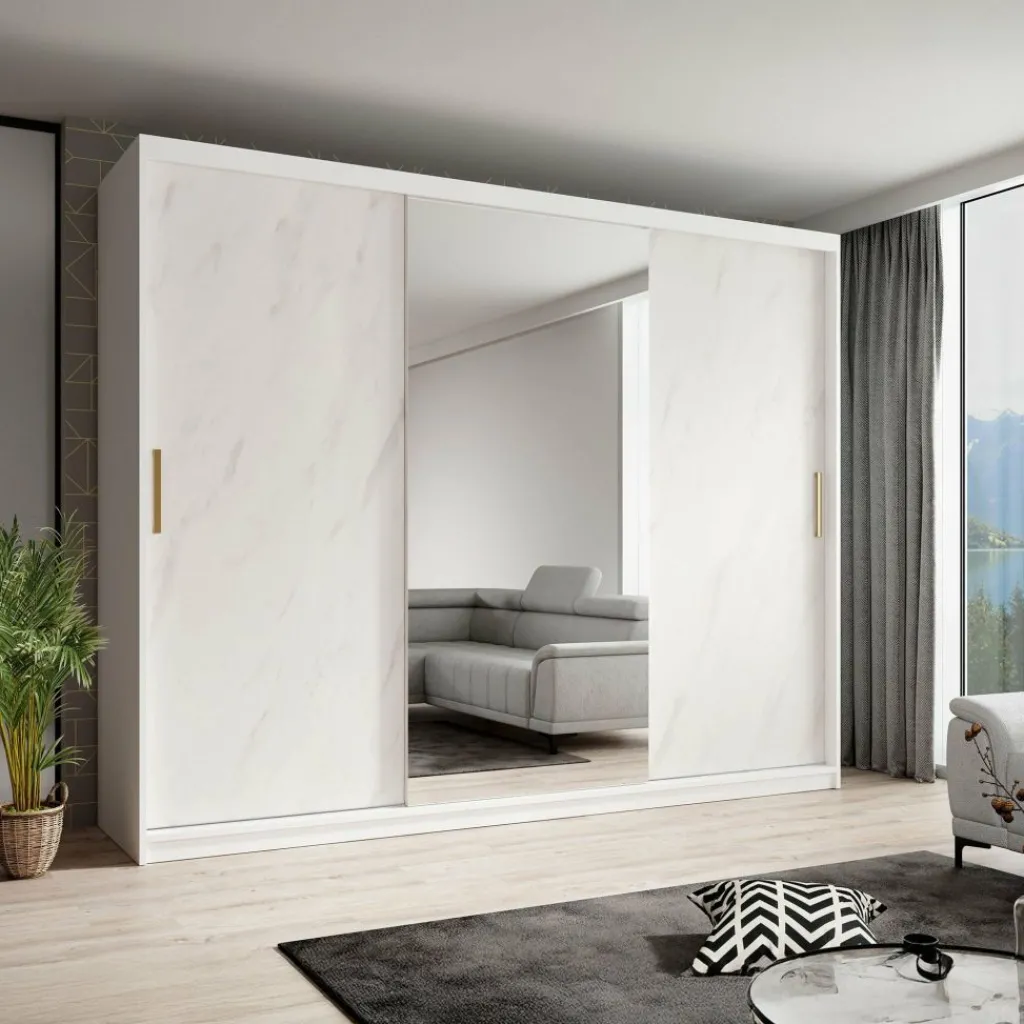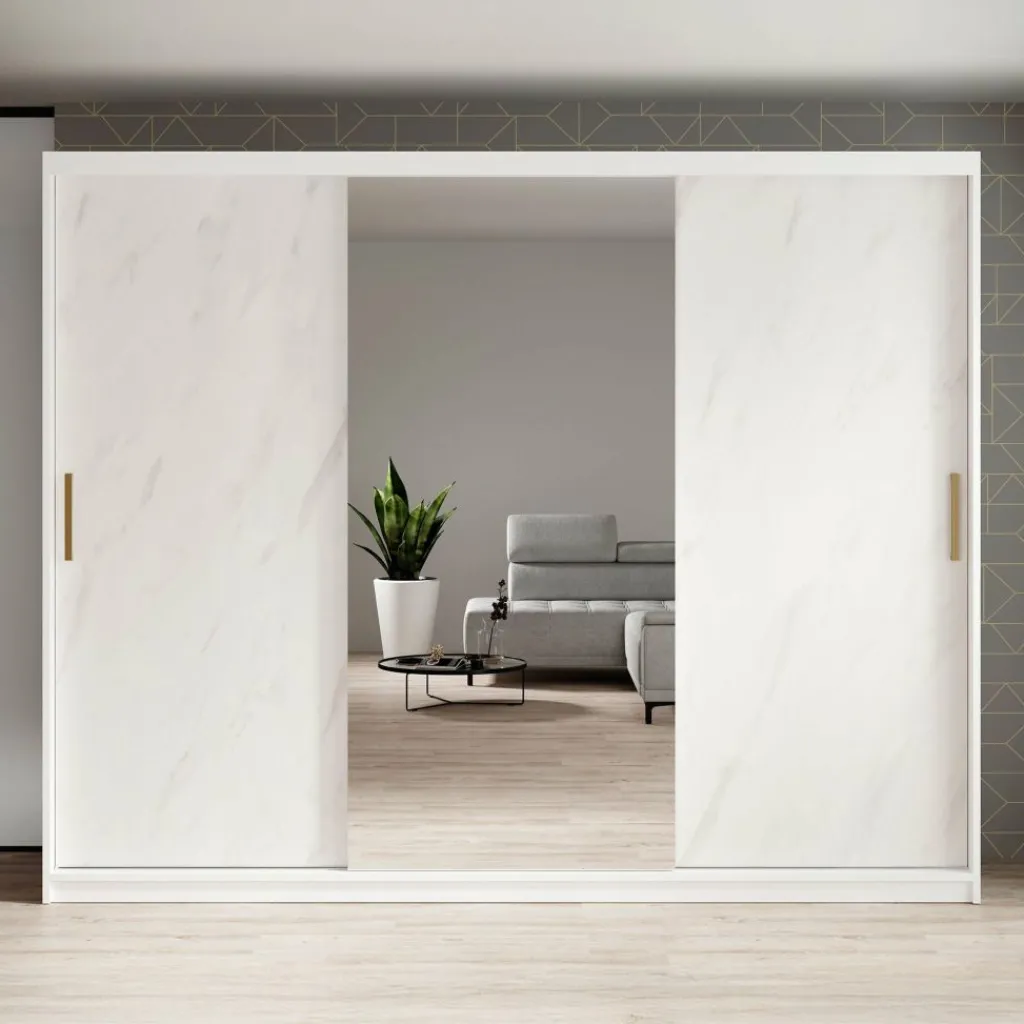 Kledingkast Marmer is een moderne garderobekast uitgevoerd in witte marmerlook kleur. De kledingkast heeft drie schuifdeuren met daarachter veel opbergruimte. De deuren zijn te openen middels goudkleurige handgrepen. Op de middelste deur zit een grote spiegel. In de binnenkant van de kast vind je 10 opbergvakken. Daarnaast beschikt de kast over twee stangen om kleding op te hangen.