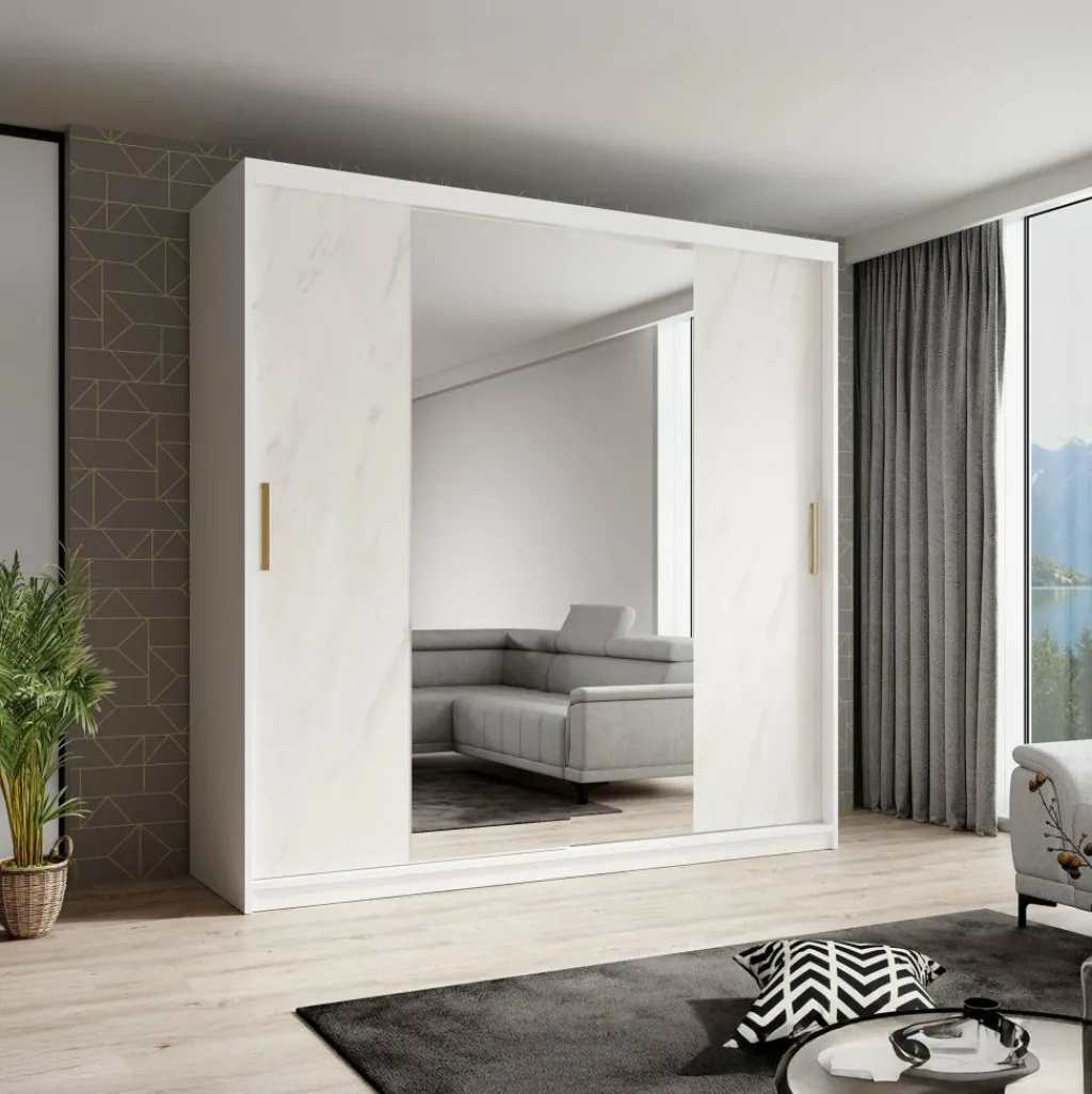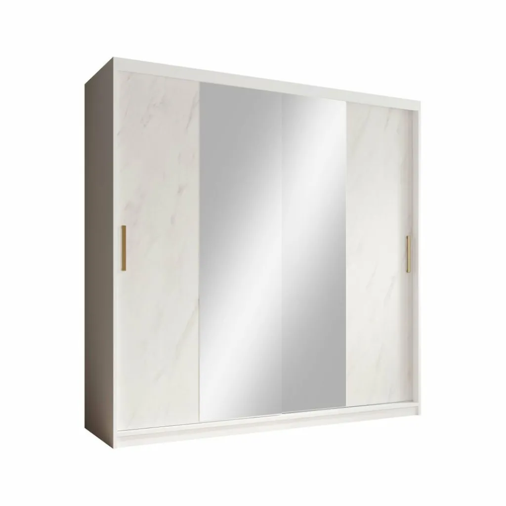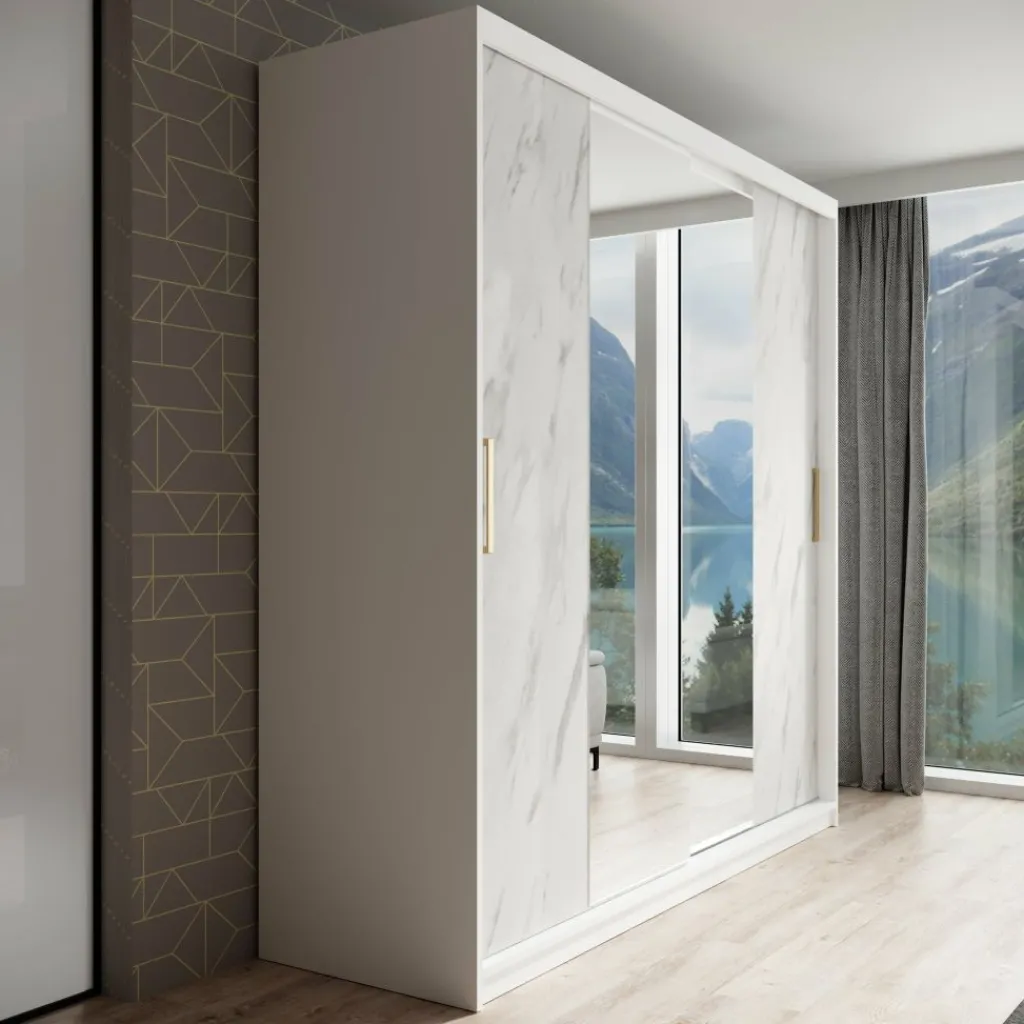 Kledingkast Marmer is een moderne garderobekast uitgevoerd in witte marmerlook kleur. De kledingkast heeft twee schuifdeuren met daarachter veel opbergruimte. De deuren zijn te openen middels goudkleurige handgrepen. Op beide deuren zitten grote spiegels. In de binnenkant van de kast vind je 10 opbergvakken. Daarnaast beschikt de kast over twee stangen om kleding op te hangen.