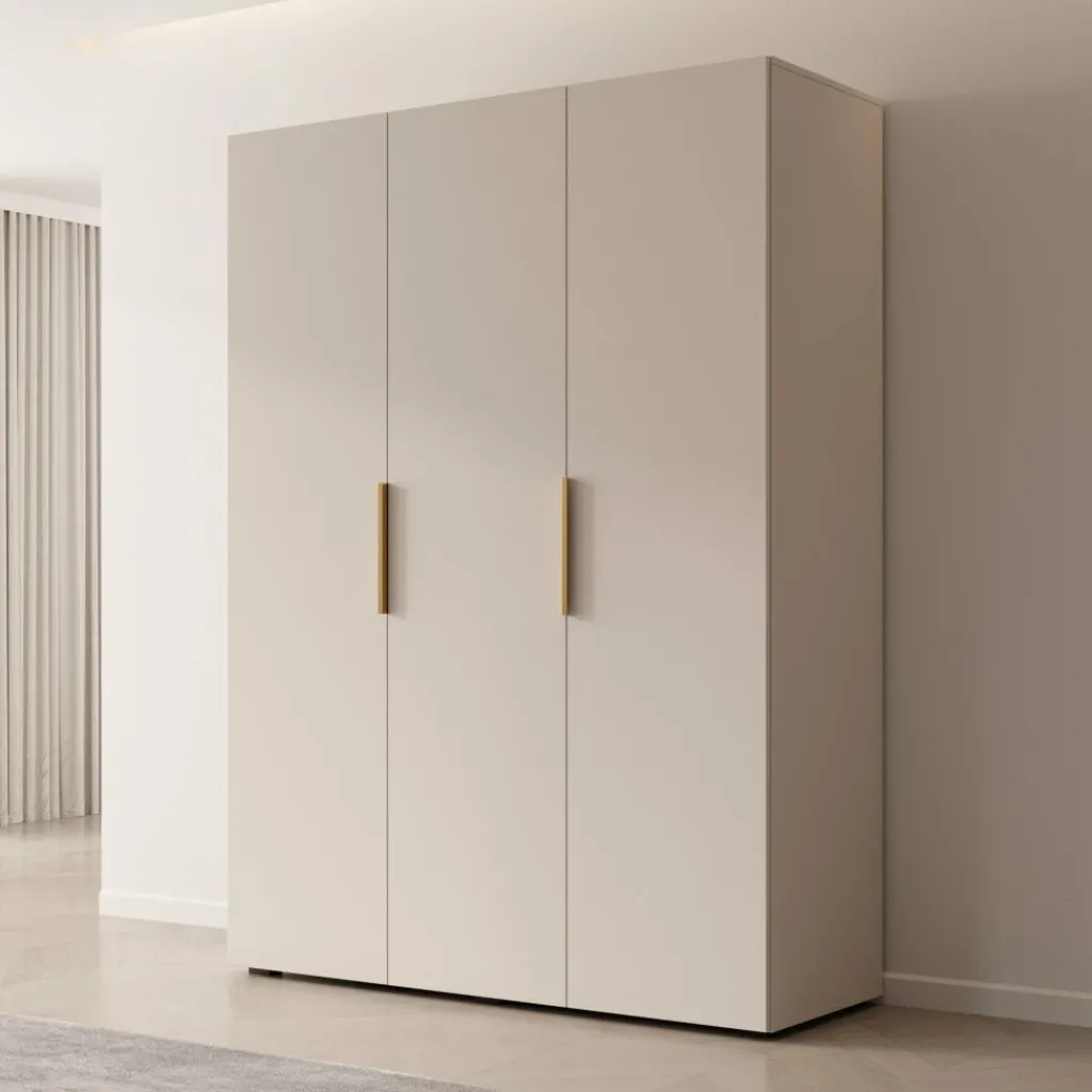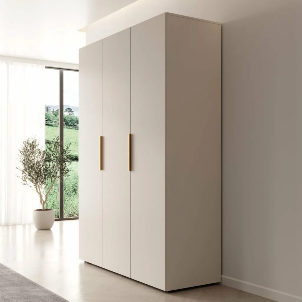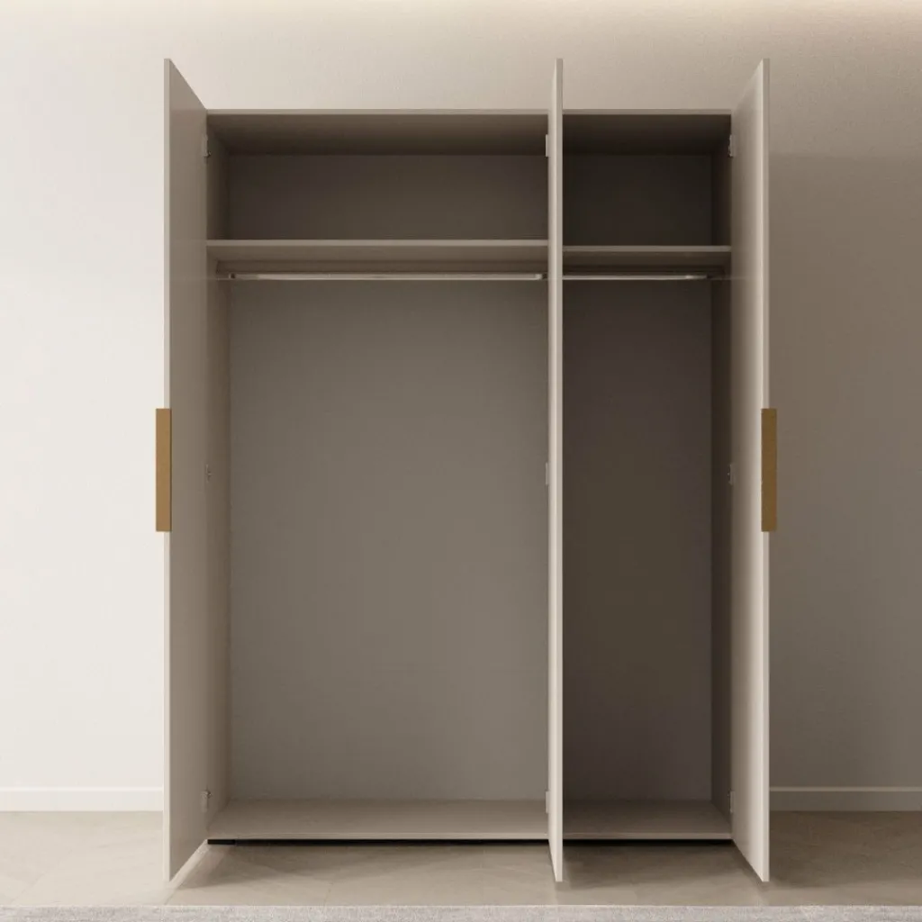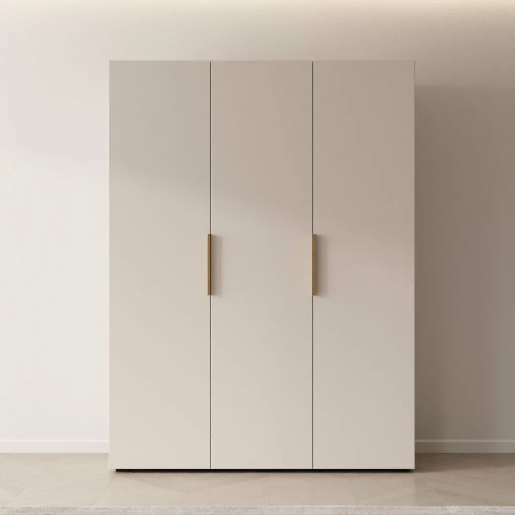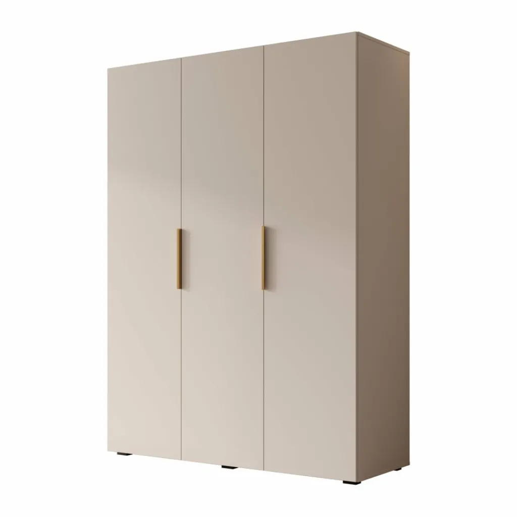 De kledingkast Marquesa combineert een warme beige look met een strak, modern ontwerp. Met drie draaideuren en geïntegreerde handgrepen past deze kast moeiteloos in verschillende interieurs.