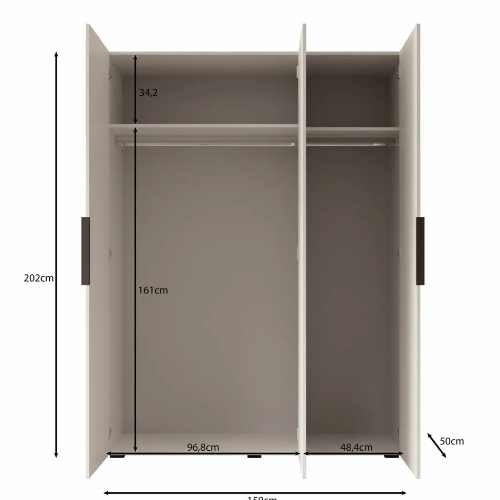 Binnenin is de kast voorzien van een praktische indeling: aan de linkerkant een brede ruimte van 96,8 cm met roede en legplank, ideaal voor het ophangen van kleding. Rechts bevindt zich een smalle sectie van 48,4 cm, eveneens uitgerust met roede en legplank, voor extra opbergruimte. Met een hoogte van 202 cm en diepte van 50 cm biedt de Marquesa voldoende plaats voor zowel dagelijkse kledingstukken als seizoensartikelen.