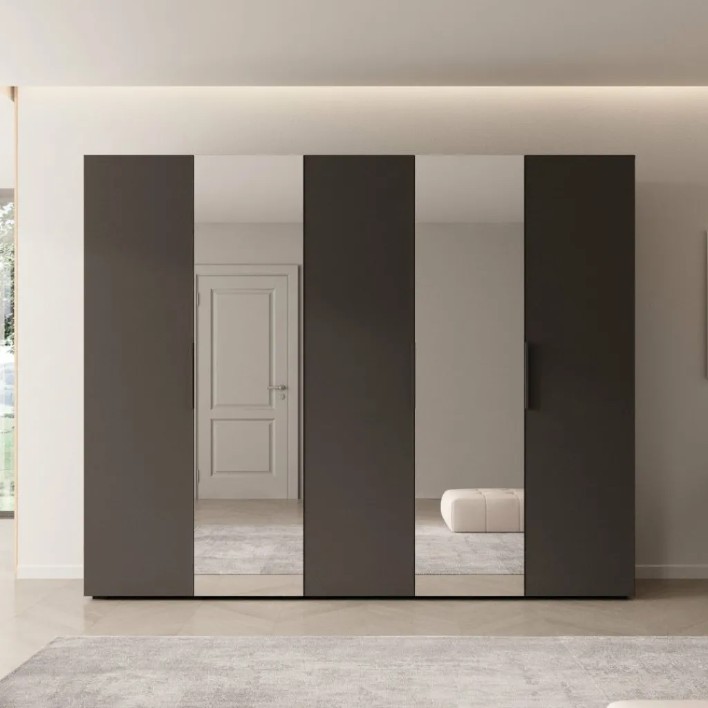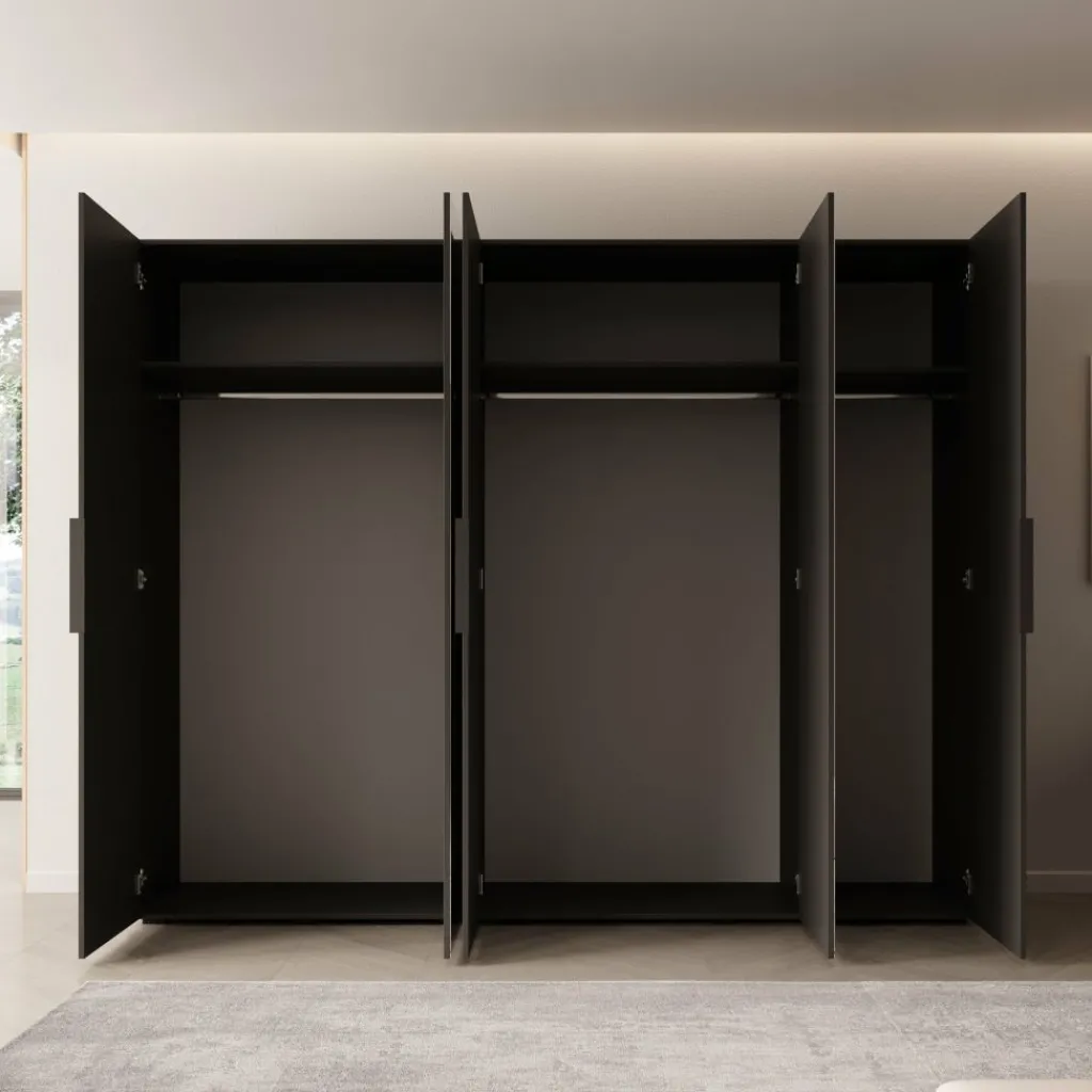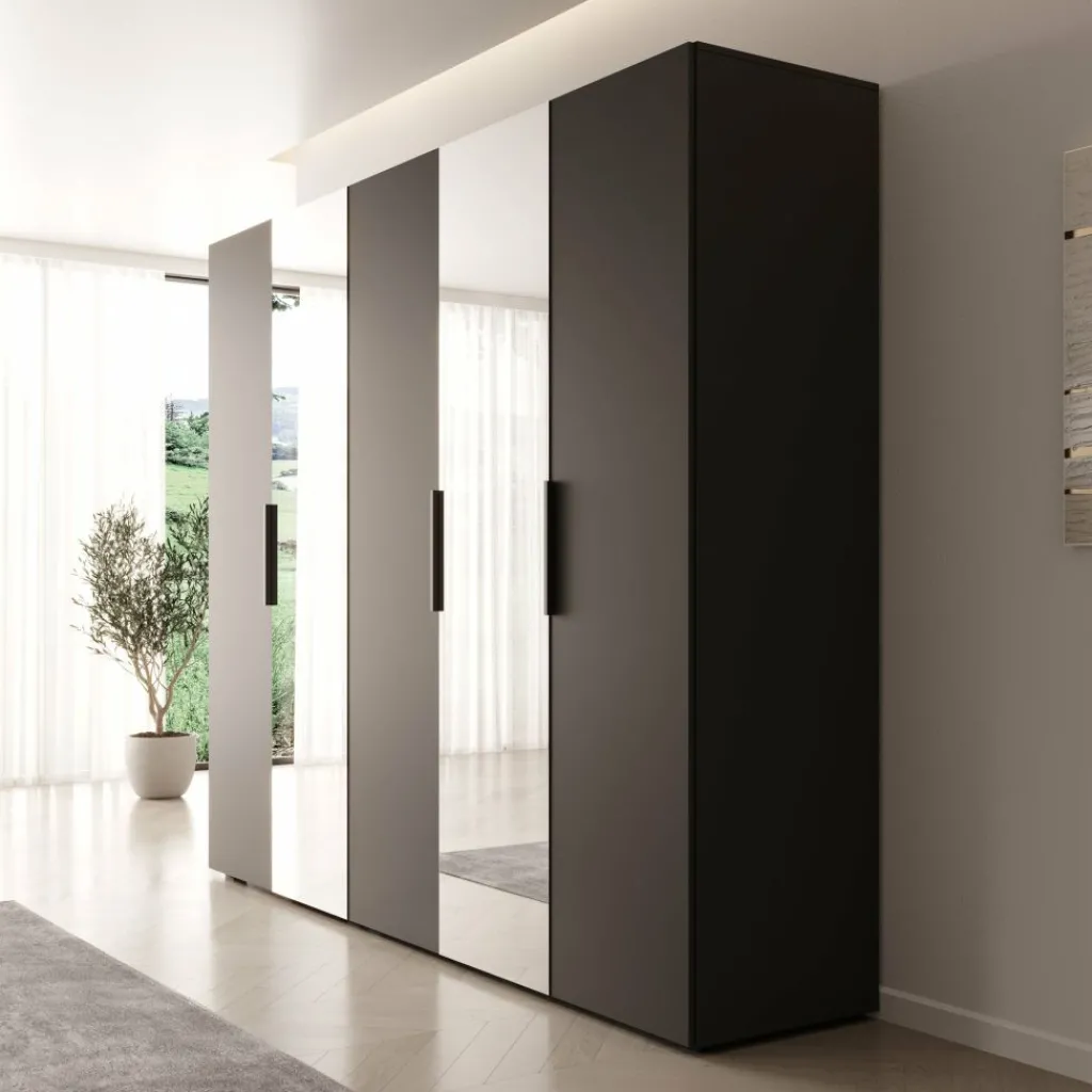 De zwarte uitvoering heeft een krachtige en moderne uitstraling. De kast vormt een stijlvolle blikvanger in de slaapkamer, zonder onrustig te ogen. De twee spiegeldeuren doorbreken het donkere geheel op een subtiele manier en voegen ruimtelijkheid toe. De zwarte handgrepen lopen mooi door in het totale ontwerp en geven de kast een strakke afwerking.