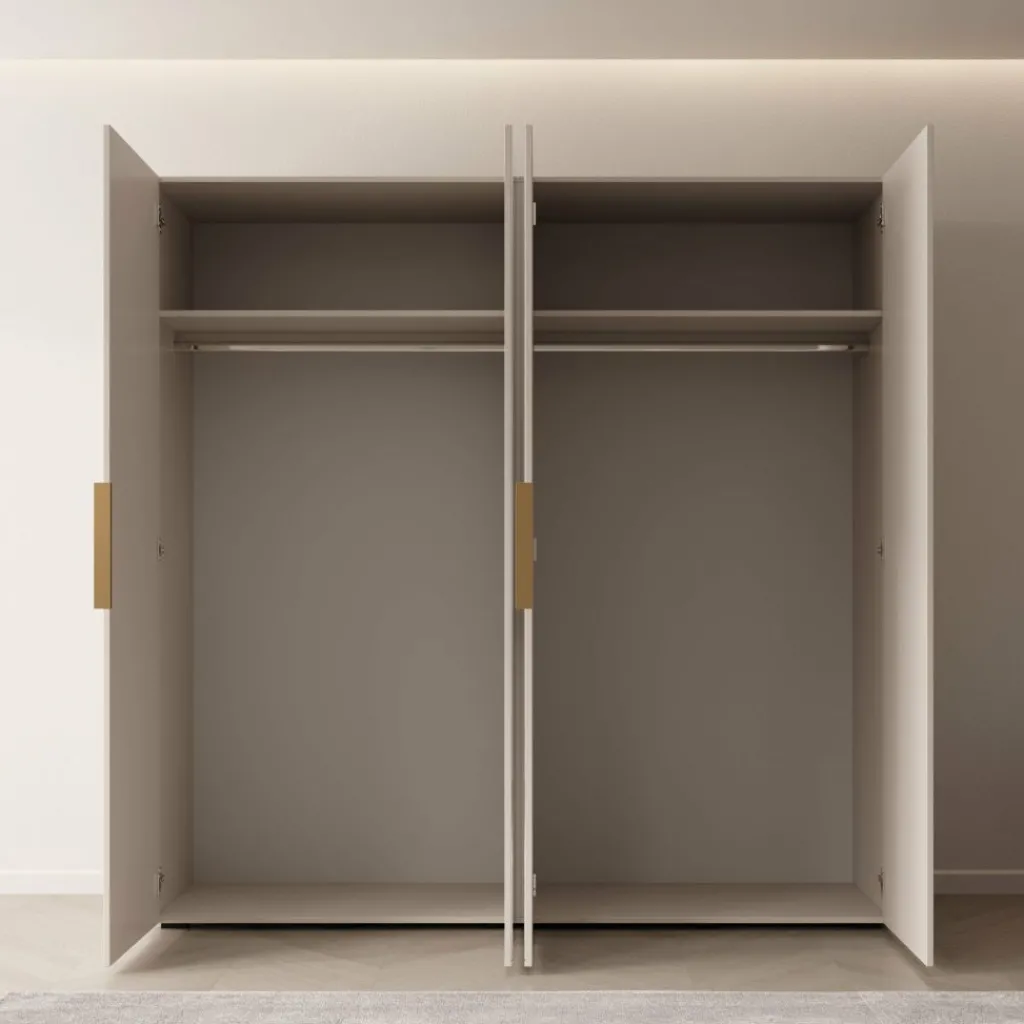 Aan de binnenzijde is opbergruimte aanwezig in de vorm van een hanggedeelte en legplanken. De kast heeft een rustige en neutrale uitstraling en kan worden toegepast in verschillende slaapkamerinrichtingen.