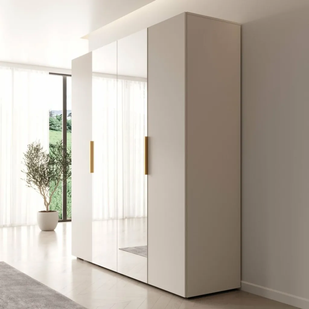 De Marquesa kledingkast van Meubella is uitgevoerd in beige en heeft een afmeting van 200 x 50 x 202 centimeter. De kast beschikt over meerdere draaideuren, waarvan twee deuren zijn voorzien van een spiegel. De handgrepen hebben een rechte vorm en zijn uitgevoerd in een goudkleurige afwerking.