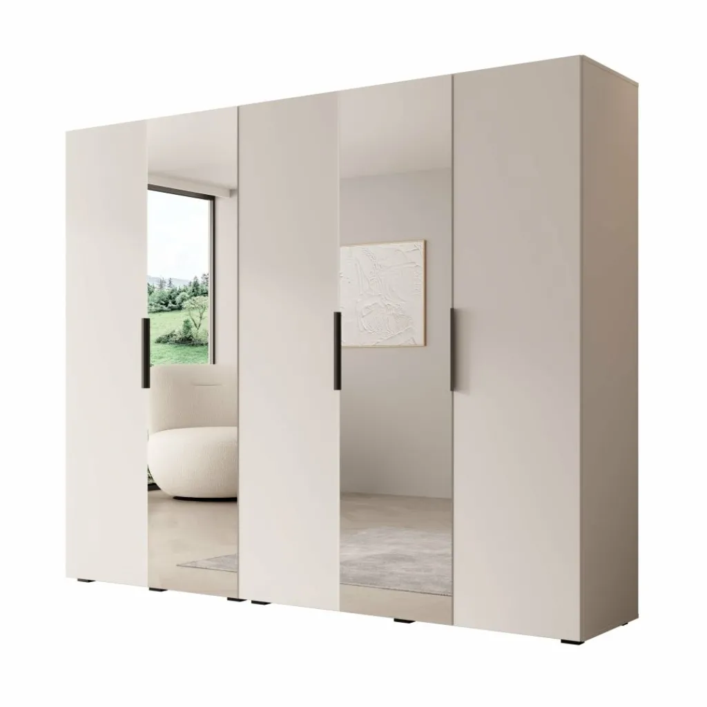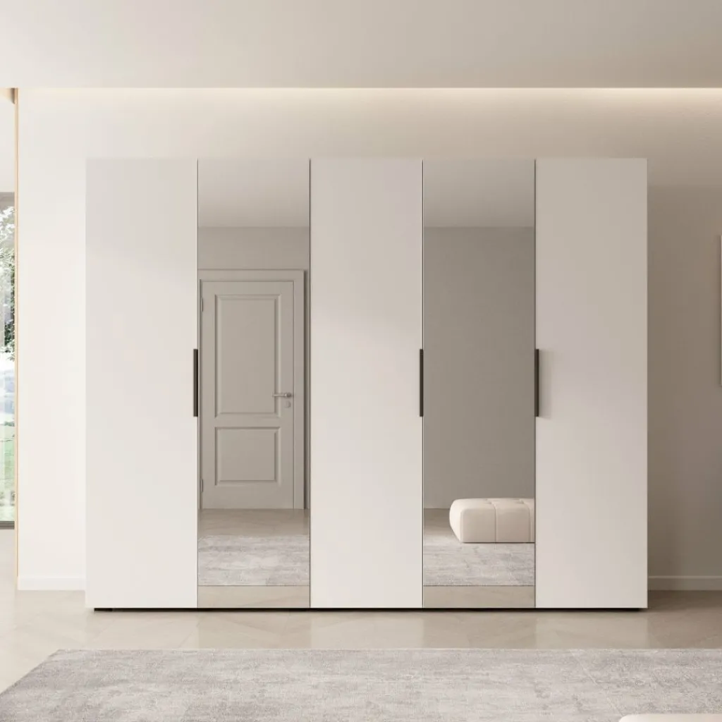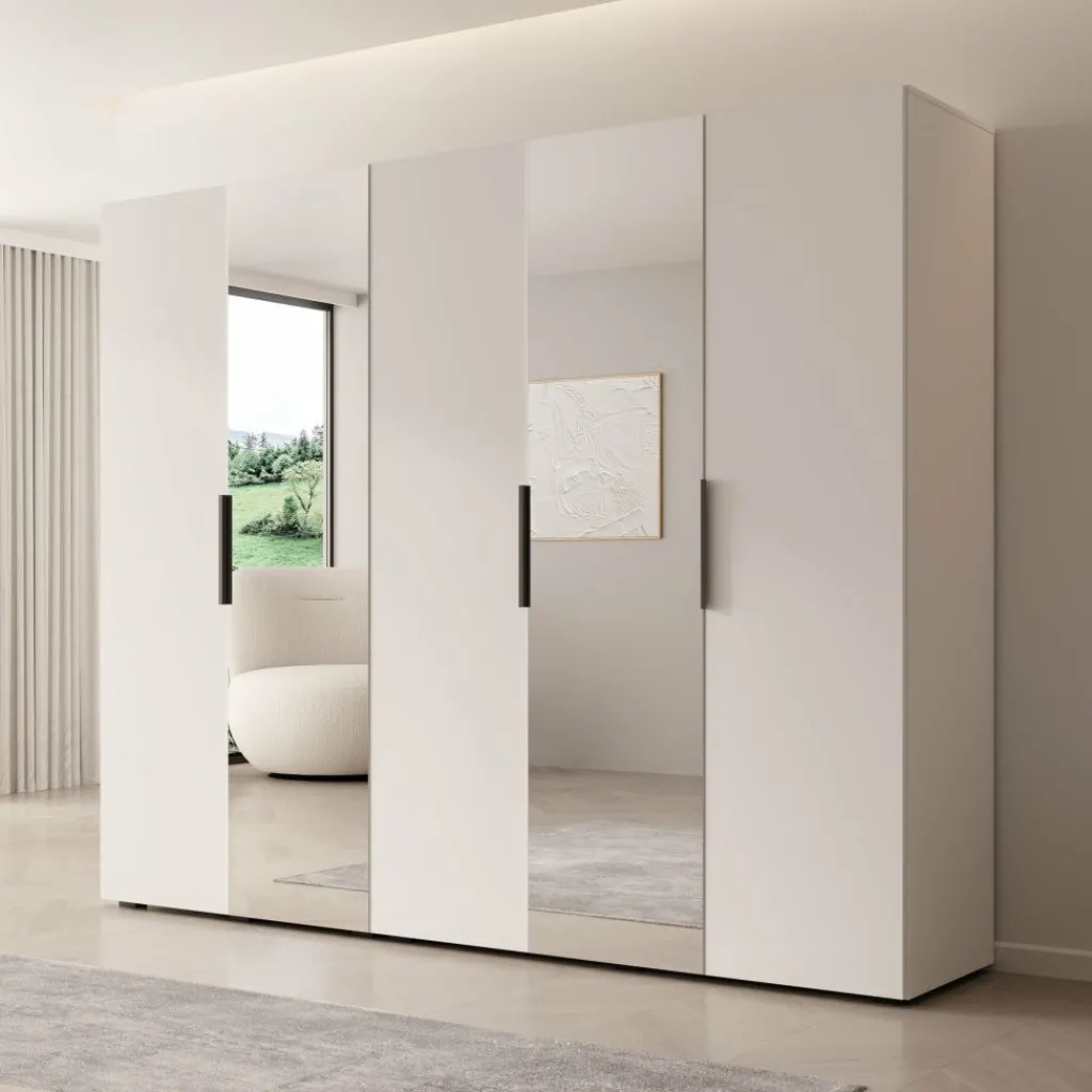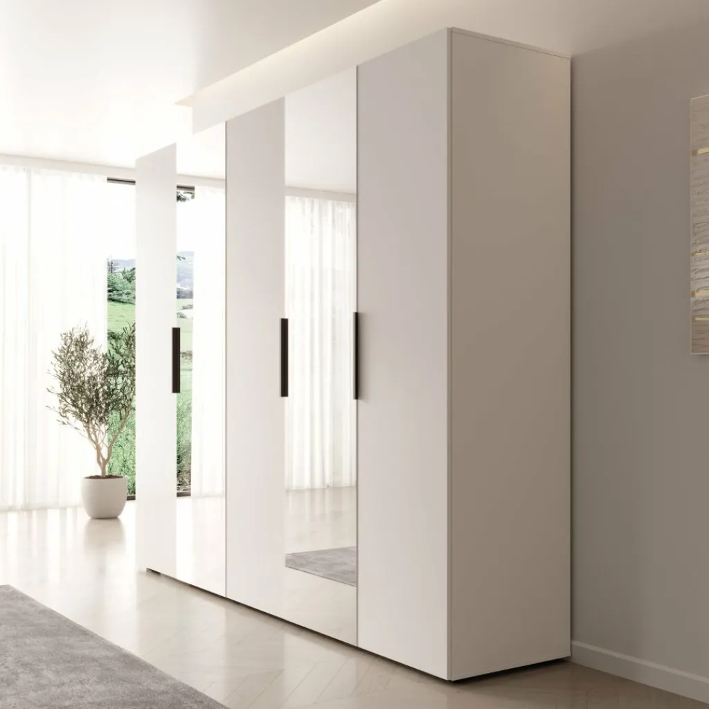 De witte variant van de Marquesa kledingkast brengt rust en helderheid in de slaapkamer. De uitvoering met zwarte handgrepen zorgt voor een subtiel contrast, waardoor de kast een moderne en verfijnde uitstraling krijgt. De twee spiegeldeuren in het midden zorgen niet alleen voor een luxe look, maar zijn ook praktisch bij het aankleden.