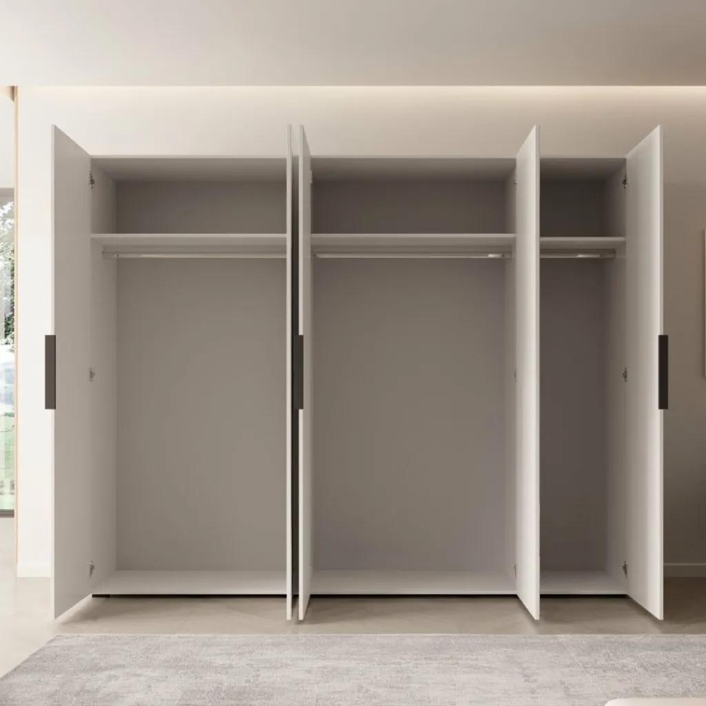 Binnenin zijn drie gedeelde vakken ingericht met kledingroedes en legplanken, zodat zowel lange kledingstukken als opgevouwen items netjes opgeborgen kunnen worden. Door de strakke vormgeving en neutrale kleur laat deze kast zich makkelijk combineren met verschillende interieurs, van minimalistisch tot Scandinavisch.