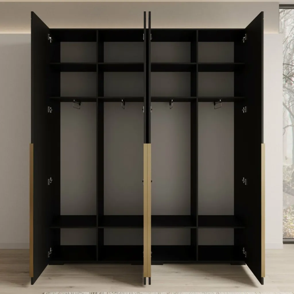 Achter de vier deuren is de kast verdeeld in meerdere compartimenten met legplanken en hanggedeeltes. Hierdoor kun je kleding overzichtelijk ophangen en combineren met gevouwen kleding en accessoires. De indeling is geschikt voor zowel lange kledingstukken als dagelijkse kleding.