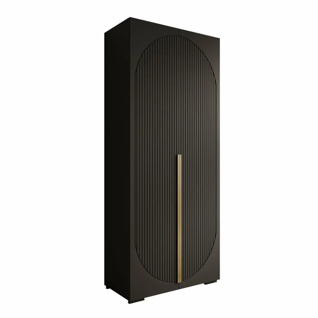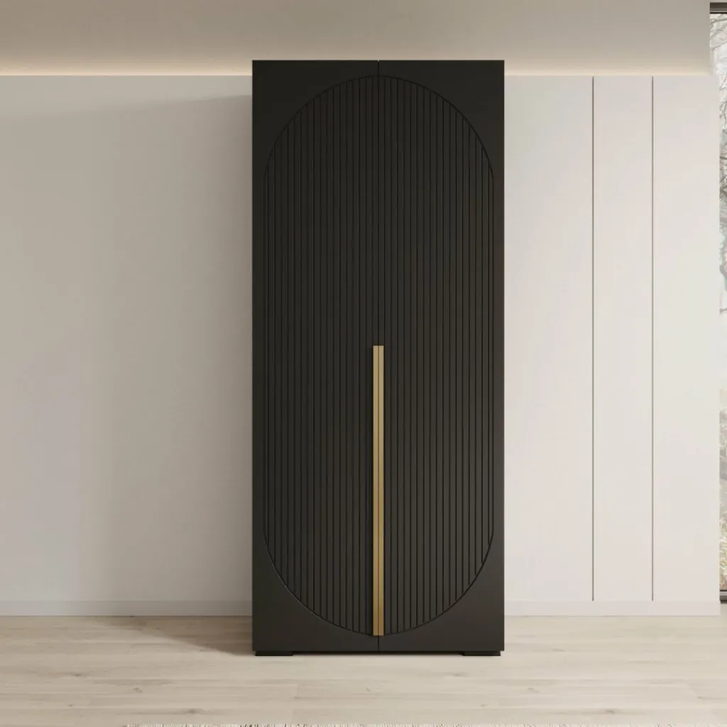 De zwarte afwerking, gecombineerd met de verticale belijning en het afgeronde detail in de deuren, geeft de kast een uitgesproken en modern karakter. De Mayfair kledingkast past goed in moderne en strakke interieurs waar vorm en functionaliteit samenkomen.