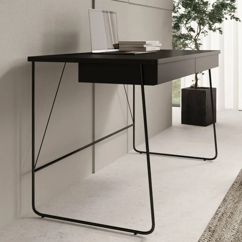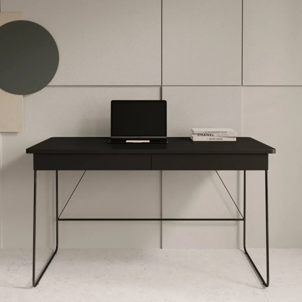 Het Medea bureau combineert een strak design met praktische functionaliteit, waardoor het perfect past in zowel een thuiskantoor als een stijlvolle werkhoek in de woonkamer. Met zijn zwarte blad, minimalistische lijnen en slanke metalen poten straalt dit bureau moderne elegantie uit, zonder in te leveren op gebruiksgemak.