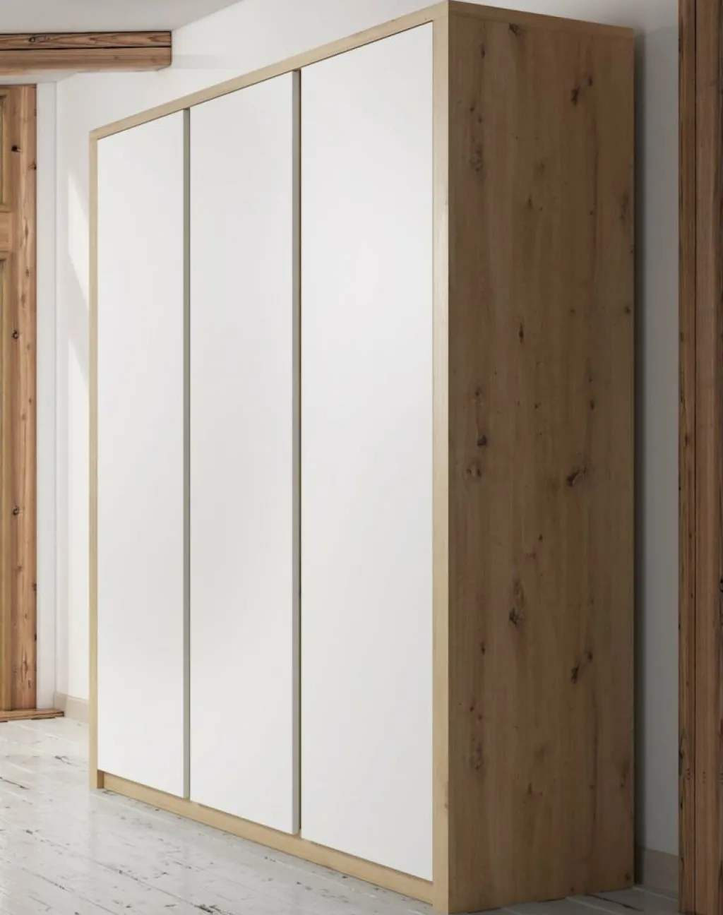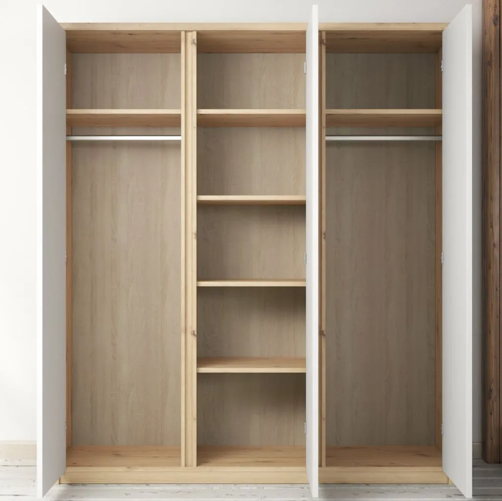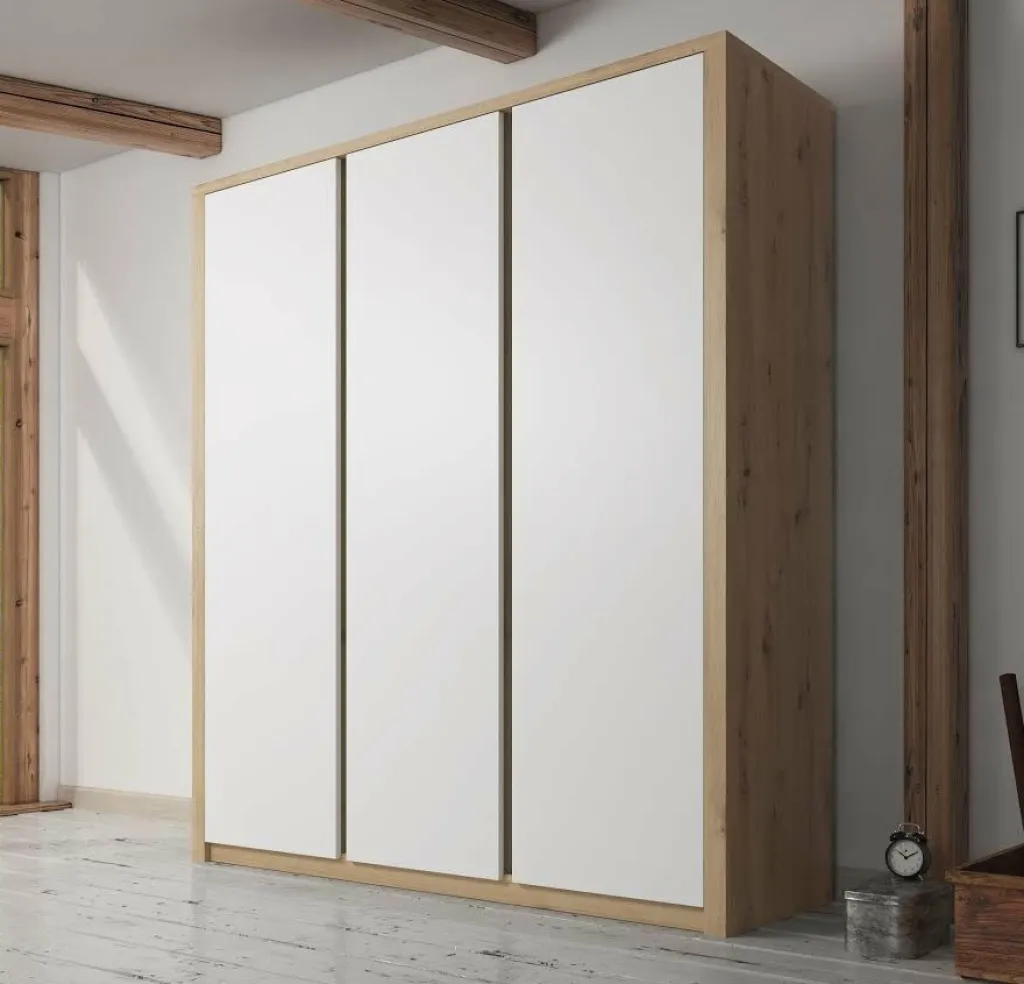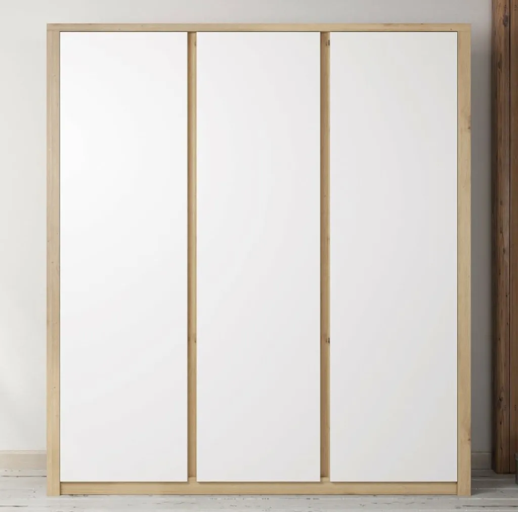 Garderobekast Melody is een robuuste, stijlvolle kledingkast met ruim voldoende opbergmogelijkheden. Het meubel is uitgevoerd in een combinatie van eiken met wit welke zorgt voor een frisse uitstraling en geschikt is voor zowel landelijke als moderne slaapkamers. Er zijn 3 deuren te vinden met daarachter een zee aan opbergruimte. Aan de linker- en rechterkant zijn metalen stangen geplaatst waaraan je kleding kunt ophangen. Daarboven zijn schappen geplaatst waar je bijvoorbeeld schoenen of accessoires op kan bergen. Tot slot zijn er in het midden van de kast vijf ruime schappen geplaatst. Garderobekast Melody maakt deel uit van een uitgebreid woonprogramma waarmee je een totaal nieuwe stijl in huis kan creëren.