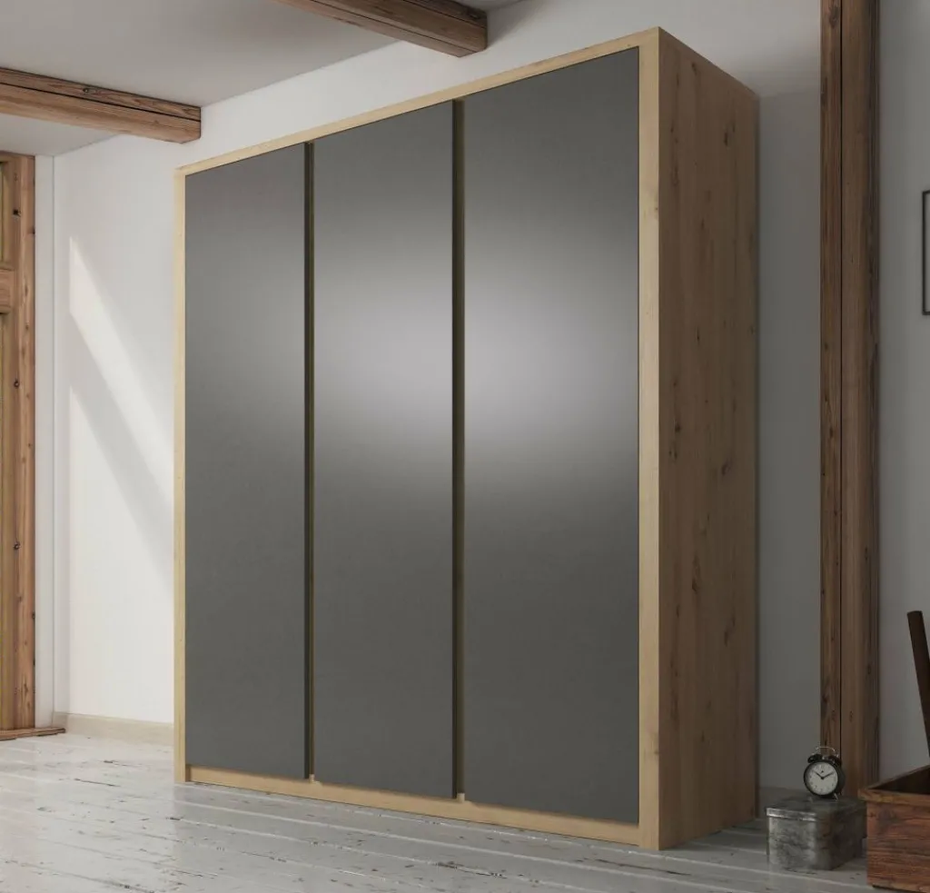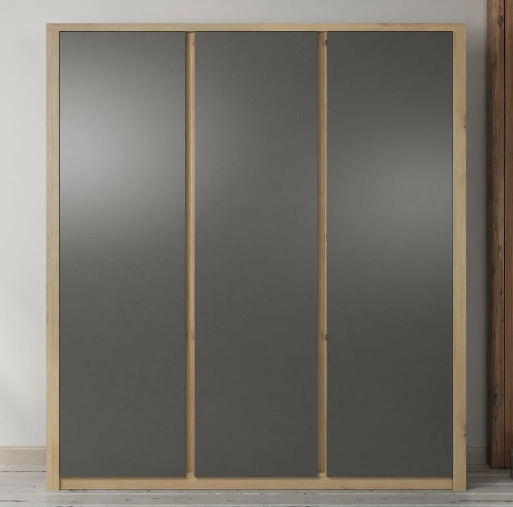 Garderobekast Melody is een robuuste, stijlvolle kledingkast met ruim voldoende opbergmogelijkheden. Het meubel is uitgevoerd in een combinatie van eiken met grijs welke zorgt voor een frisse uitstraling en geschikt is voor zowel landelijke als moderne slaapkamers. Er zijn 3 deuren te vinden met daarachter een zee aan opbergruimte. Aan de linker- en rechterkant zijn metalen stangen geplaatst waaraan je kleding kunt ophangen. Daarboven zijn schappen geplaatst waar je bijvoorbeeld schoenen of accessoires op kan bergen. Tot slot zijn er in het midden van de kast vijf ruime schappen geplaatst. Garderobekast Melody maakt deel uit van een uitgebreid woonprogramma waarmee je een totaal nieuwe stijl in huis kan creëren.