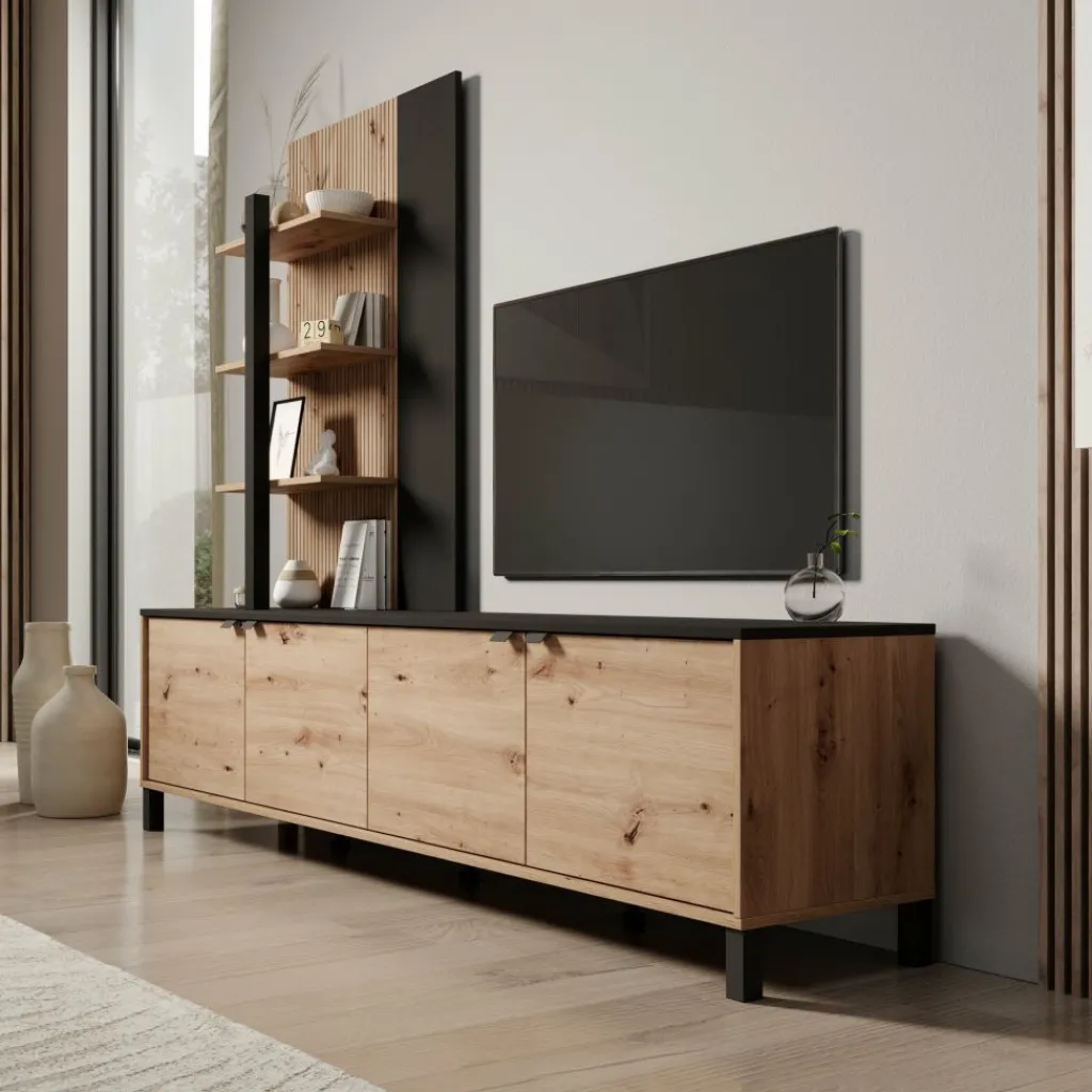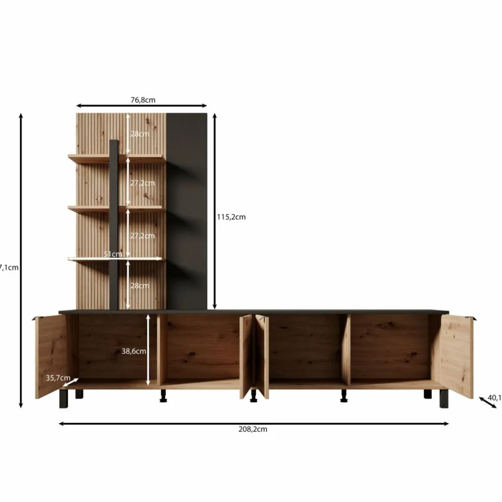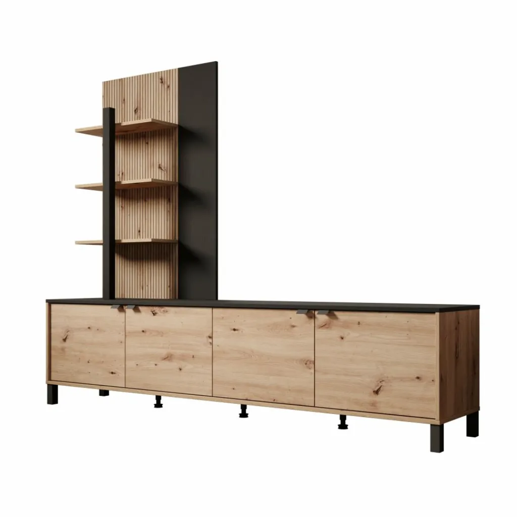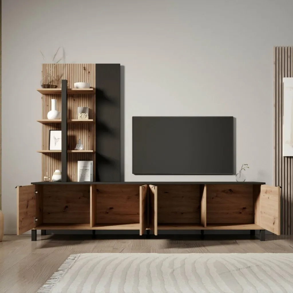 Het wandmeubel bestaat uit een laag tv-meubel met meerdere deurtjes en een hoge open kast aan de linkerzijde. De open kast is voorzien van meerdere open vakken, terwijl het lage meubel gesloten opbergruimte biedt. Het bovenblad van het tv-meubel is geschikt voor het plaatsen van een televisie en accessoires. Het geheel staat op poten en is vrij van de vloer geplaatst.