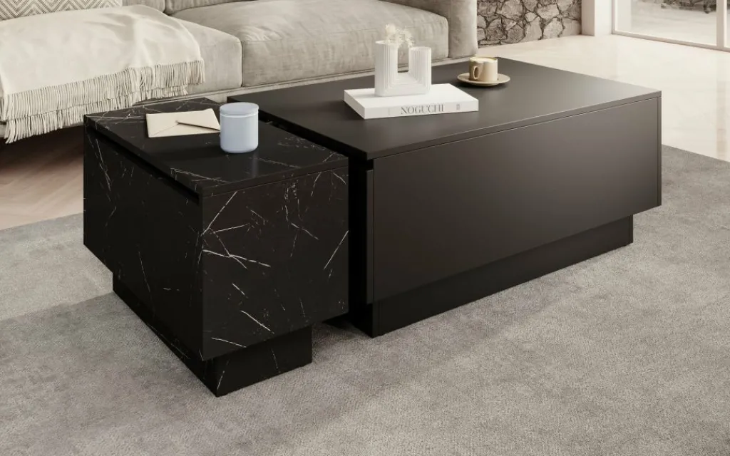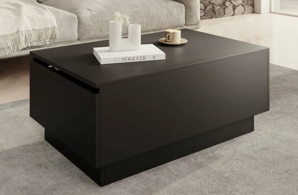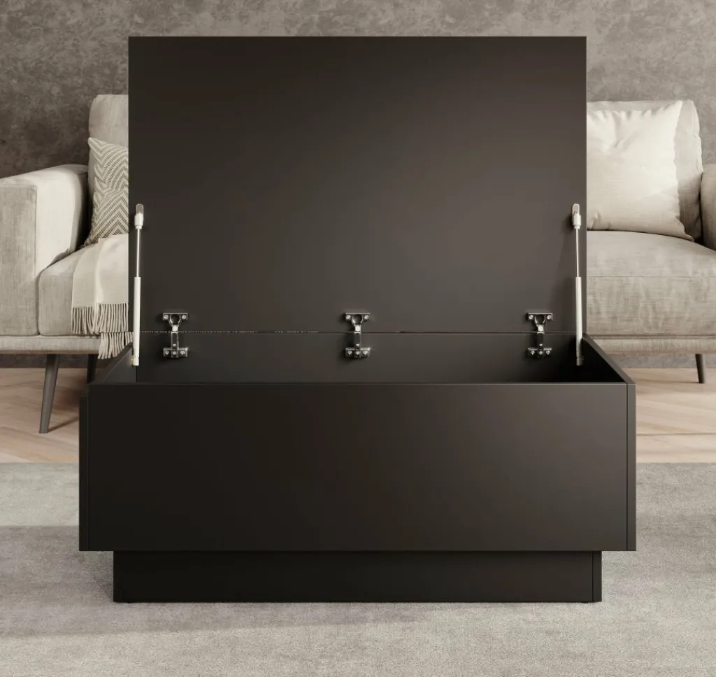 Salontafel Micha is een rechthoekige salontafel met een moderne uitstraling uitgevoerd in mat zwart. Het tafelblad is open te klappen waardoor je over handige opbergruimte beschikt. Deze klep is te openen met de opening aan de zijkant.