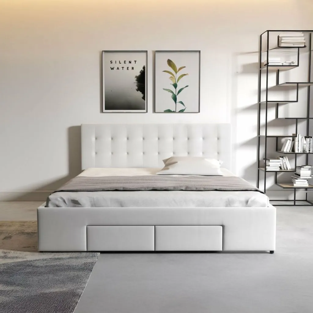 Tweepersoonsbed Milo is een opvallend, modern bed en een echte eyecatcher. Dit model is afgewerkt met onderhoudsvriendelijk, deels gecapitonneerd, kunstleer in de kleur wit. Het bed beschikt over een stevige constructie inclusief hoofdbord, voetbord en zijpanelen en staat op kunststoffen pootjes van 4 cm hoog. Bij de prijs is ook een standaard lattenbodem inbegrepen. Een matras wordt niet bijgeleverd. Het bed is ontzettend praktisch aangezien er in totaal vier lades in geplaatst zijn: twee bij het voetenbord en aan de linker- en rechterkant ook nog één. Tweepersoonsbed Milo heeft een draagvermogen van 100 kg per ligzijde.