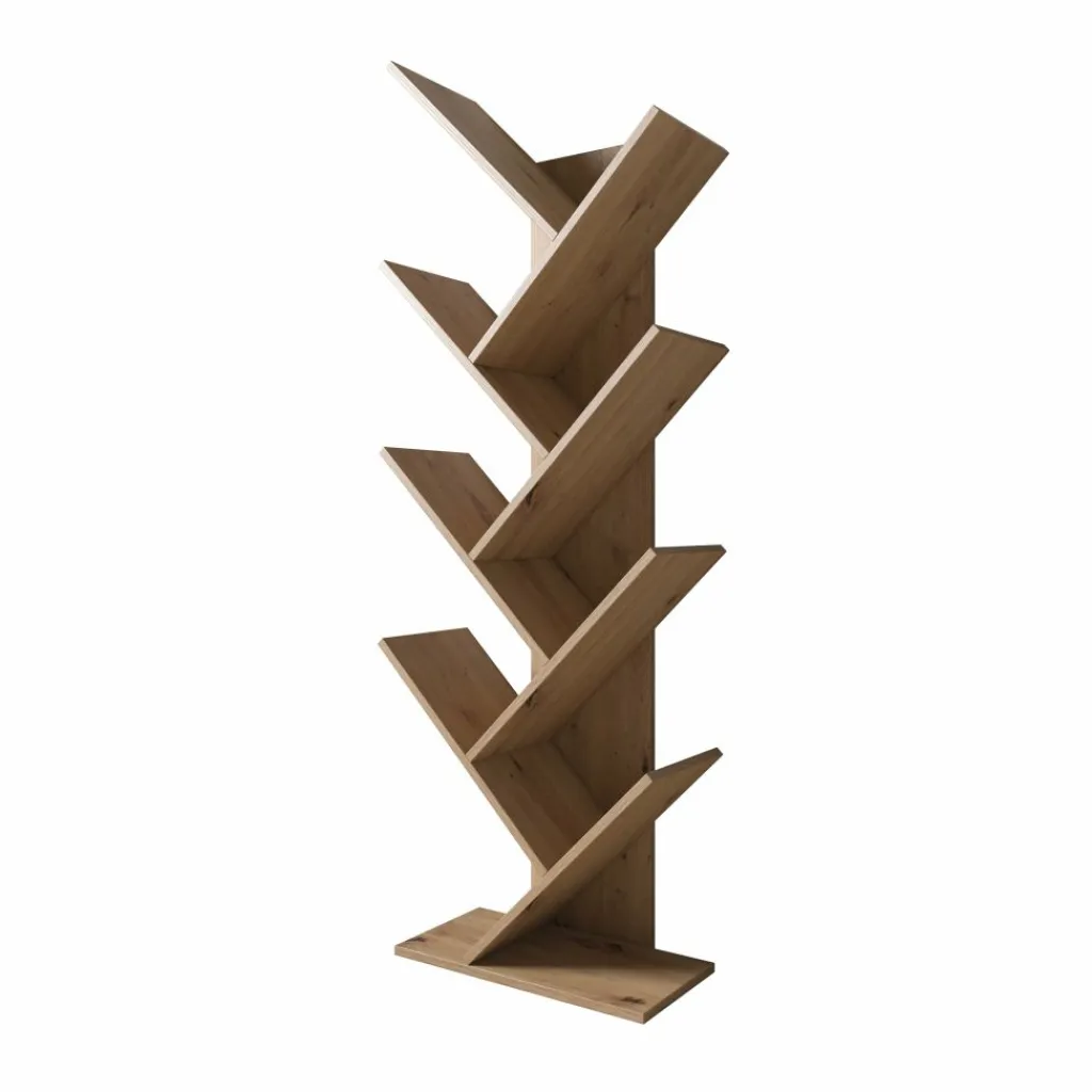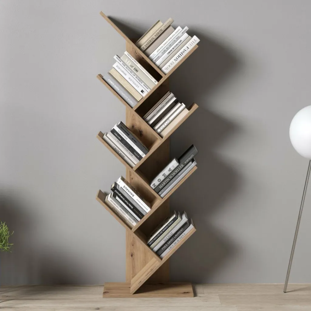 De kast is opgebouwd uit meerdere schuin geplaatste legvlakken die trapsgewijs langs de verticale achterplaat zijn gemonteerd. Deze indeling biedt ruimte voor het opbergen en presenteren van boeken, tijdschriften of decoratieve objecten. Elk legvlak is afzonderlijk toegankelijk en houdt de inhoud zichtbaar.