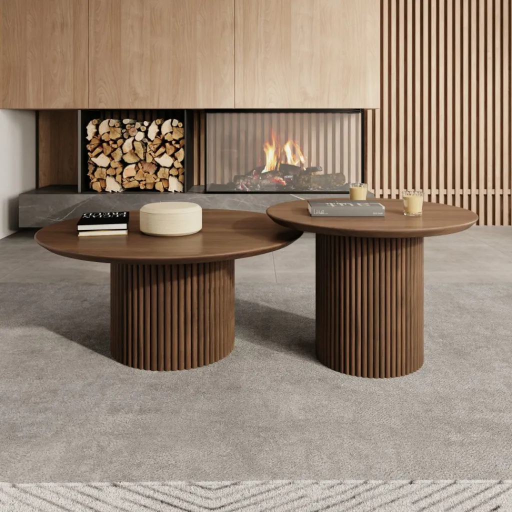Beide tafels zijn uitgevoerd in een walnootpatroon en voorzien van een cilindervormige poot met verticale groeven. Het ronde tafelblad sluit hier strak op aan en vormt samen met de poot één geheel. Het walnootpatroon geeft de set een warme houtlook die goed te combineren is met diverse interieurstijlen.