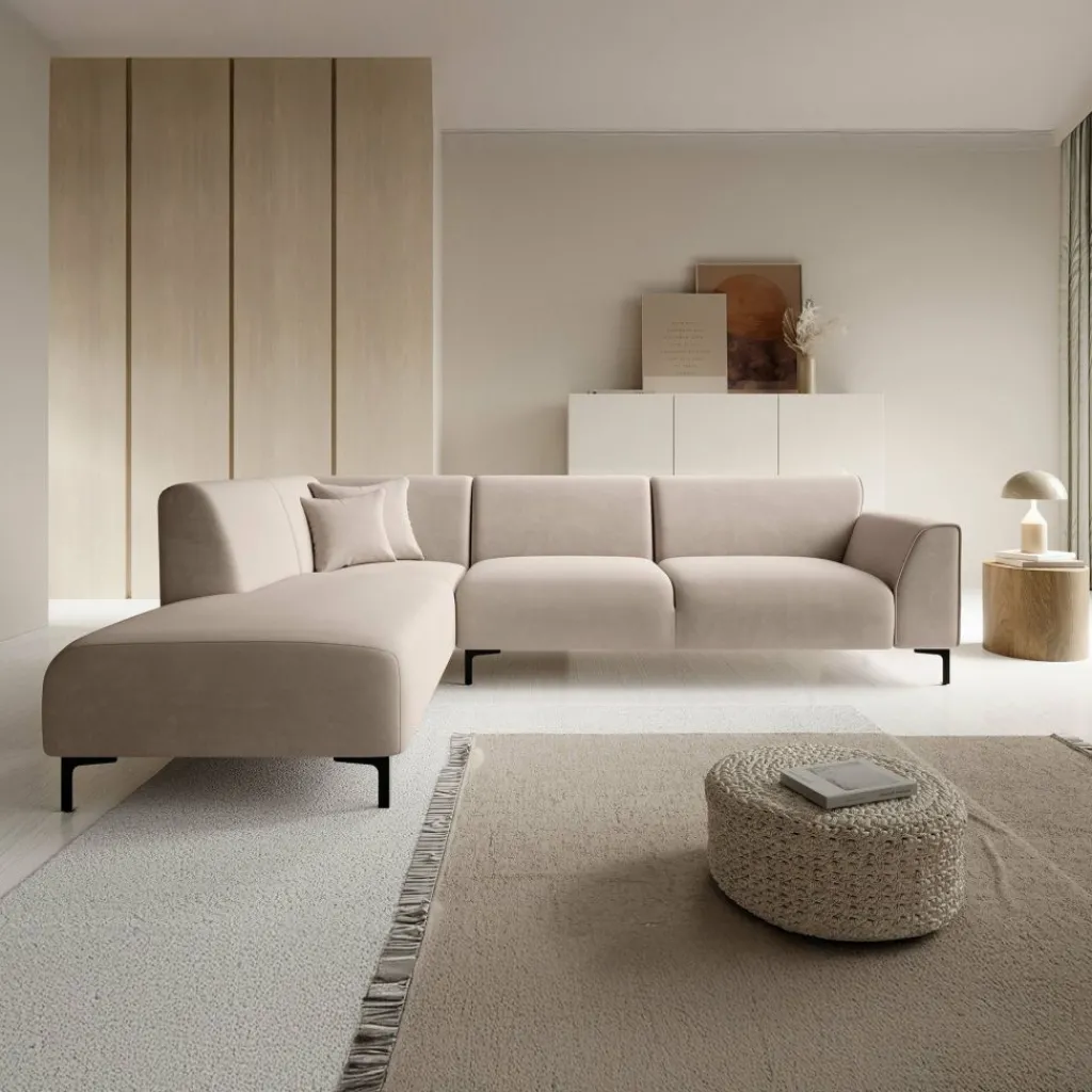 Hoekbank Moana is een moderne bank gemaakt van stof. Dit model is geschikt voor 4 tot 5 personen. Naast de 2-zitter is de bank voorzien van een lounge-deel. De hoekbank is bekleed met een beige zachte stof en staat op hoge, zwart metalen pootjes. De Moana bestaat uit zowel vaste rugkussens als uit vaste zitkussens en wordt met 2 bijpassende sierkussentjes geleverd.