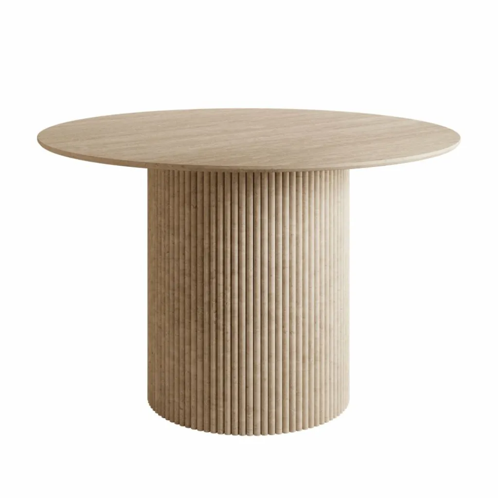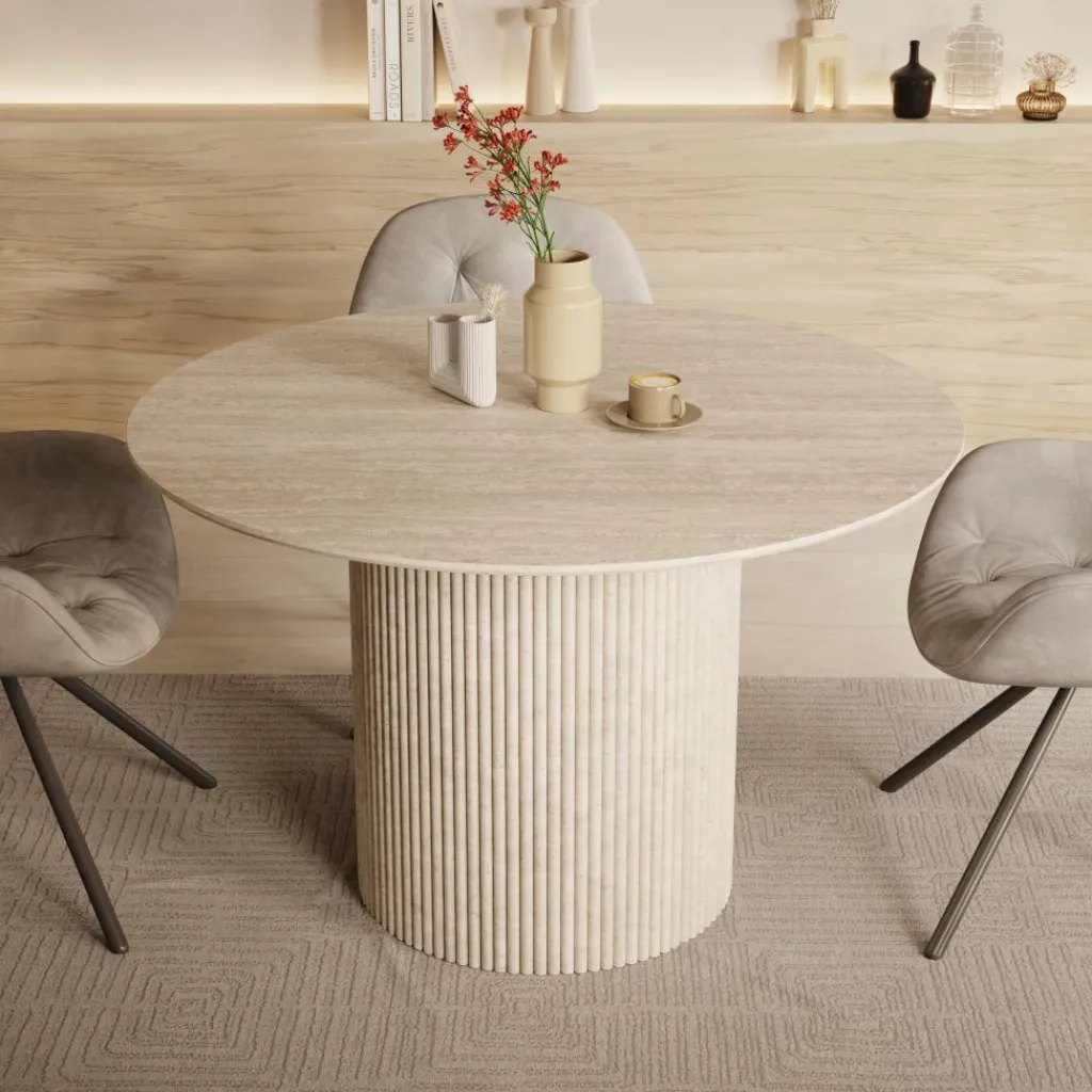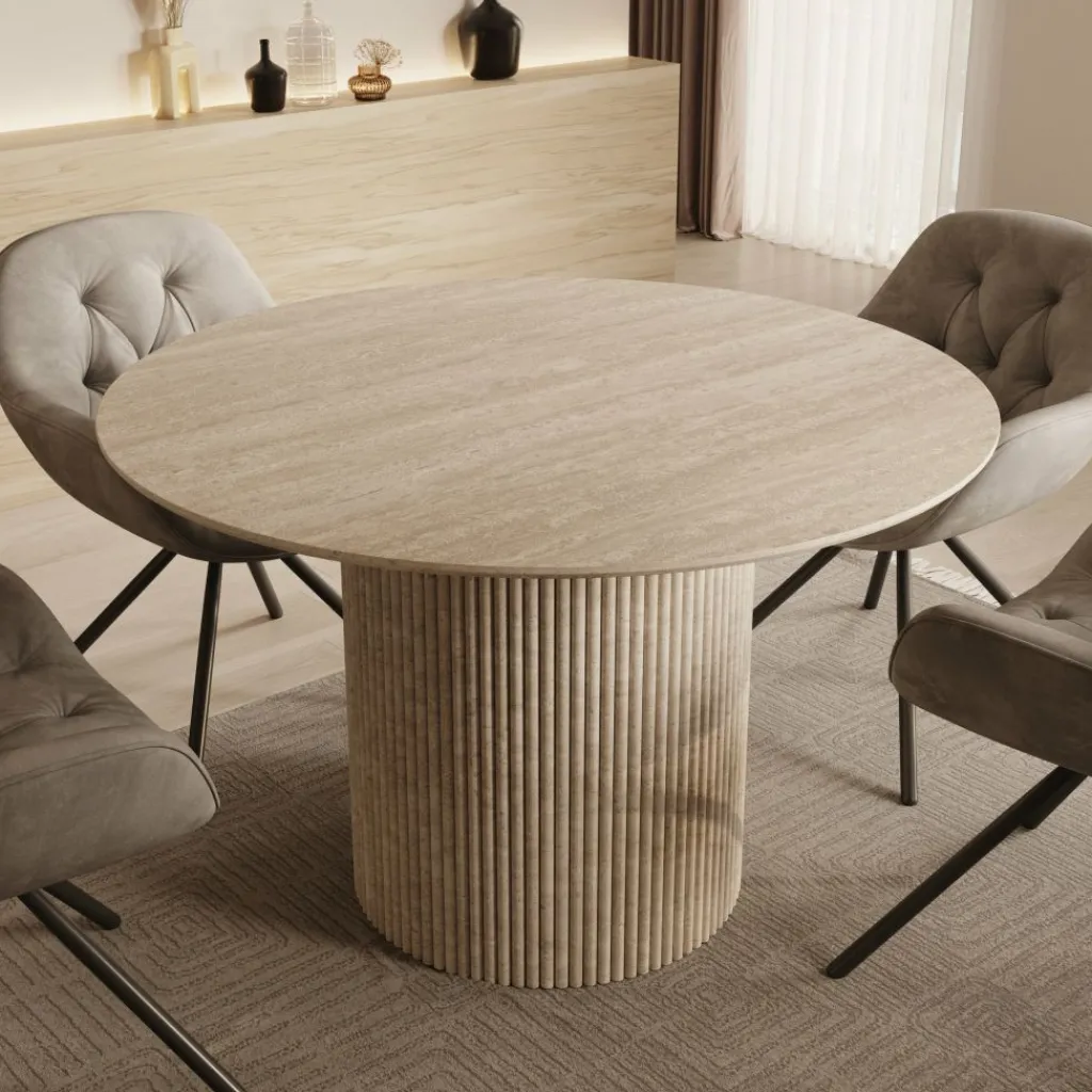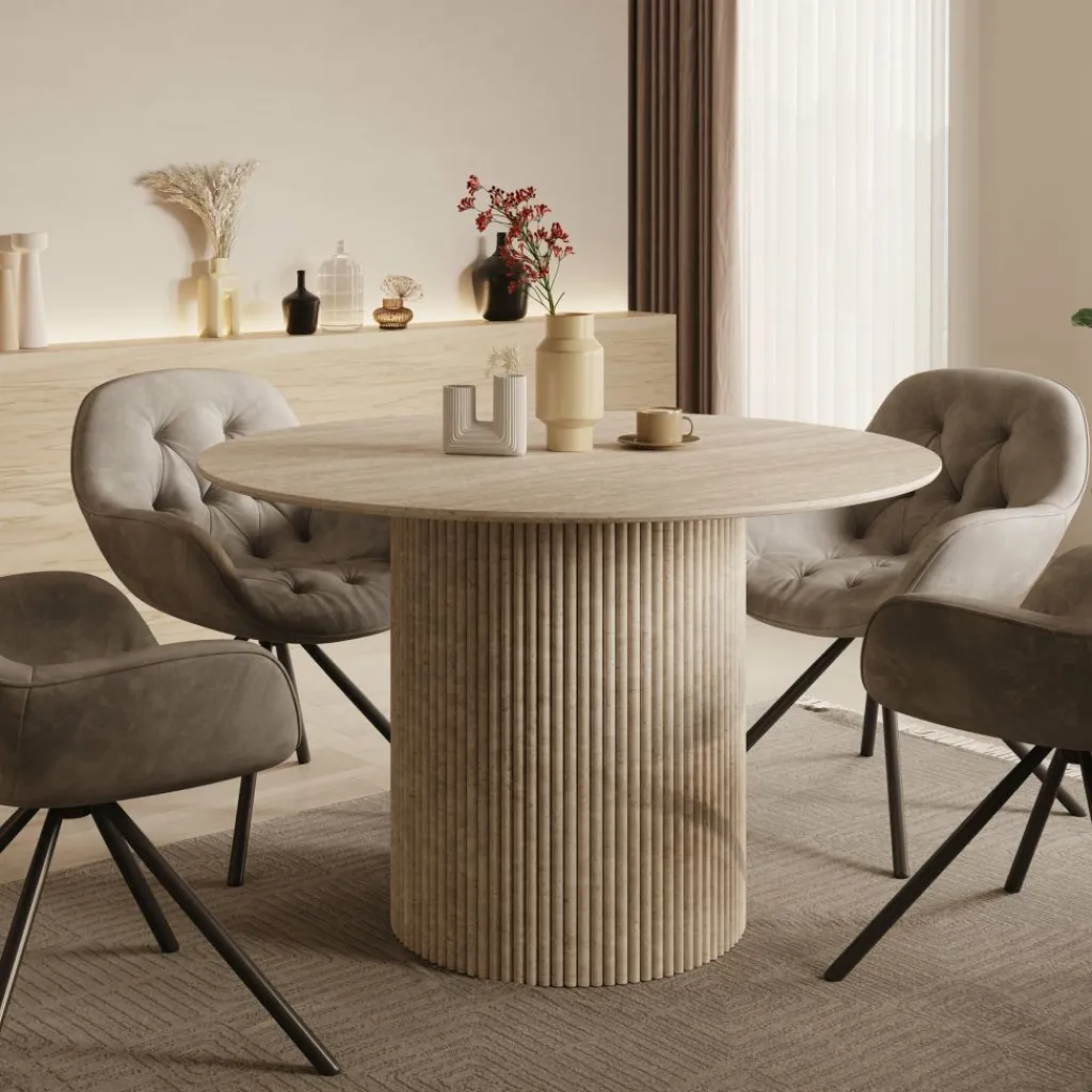 De warme travertin-look geeft de tafel een natuurlijke en tijdloze uitstraling, waardoor hij perfect past in verschillende interieurstijlen – van modern en Scandinavisch tot Japandi en hotel chique. De ronde vorm zorgt daarnaast voor een intieme en uitnodigende setting, ideaal voor dagelijks gebruik.