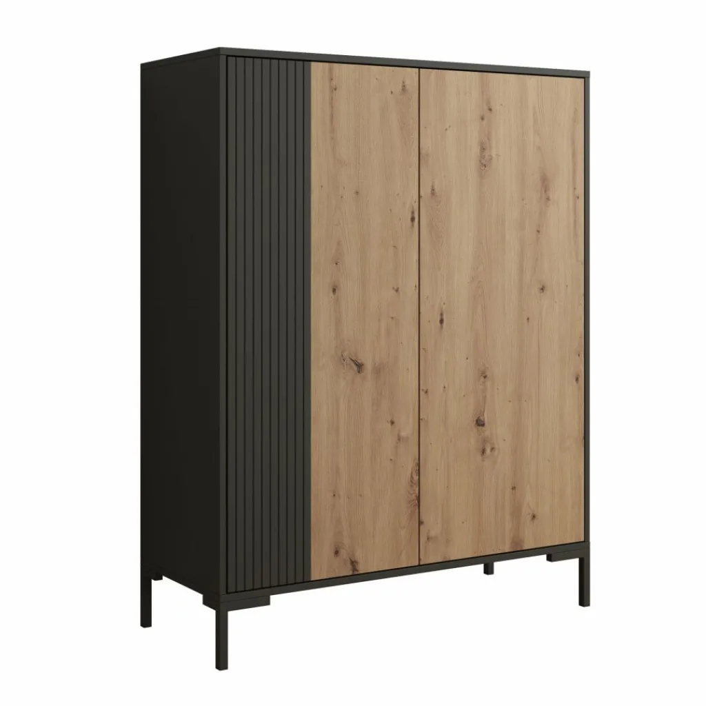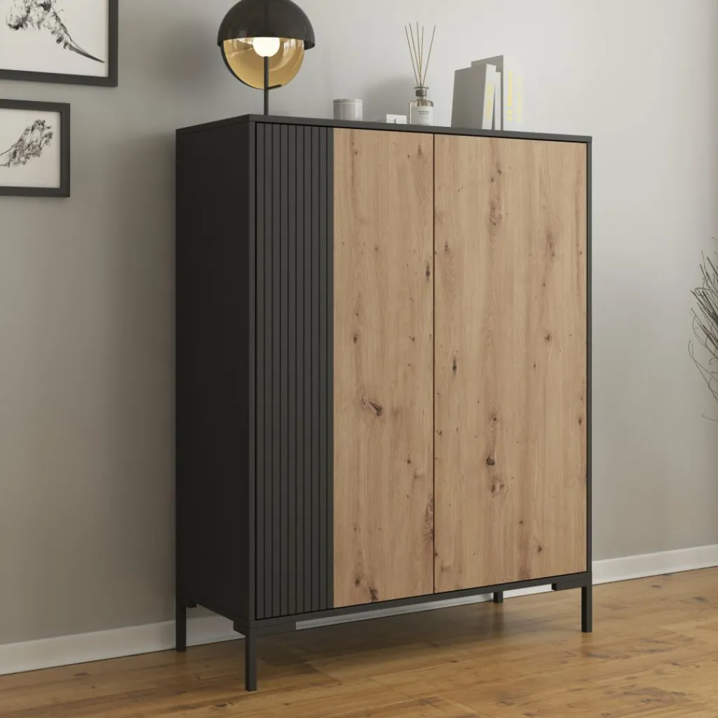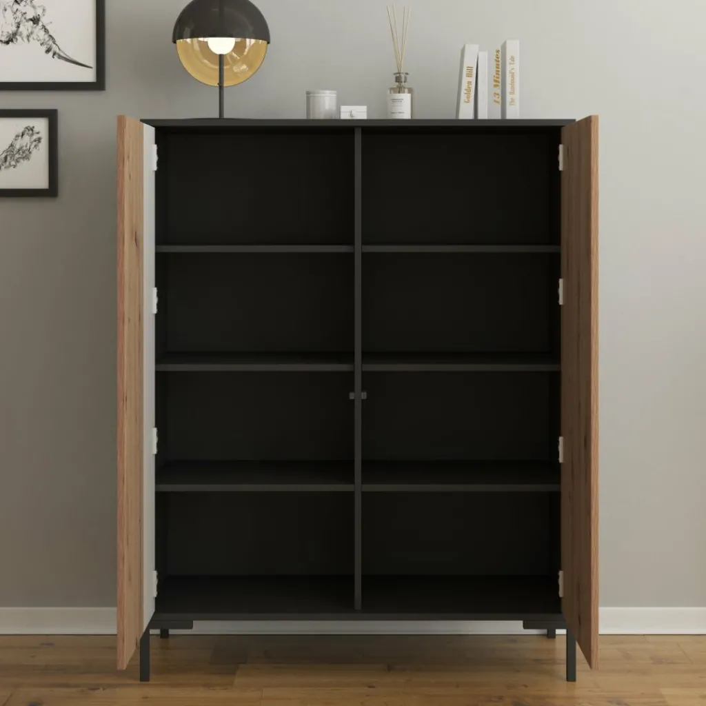 Dressoir Molina is een opbergkast in een industriële stijl. De kast beschikt over 2 deuren die openen met het push to open systeem. Achter de deuren zitten in totaal 8 opbergvakken. De Molina is uitgevoerd in de kleur eiken met zwart en staat op metalen poten.