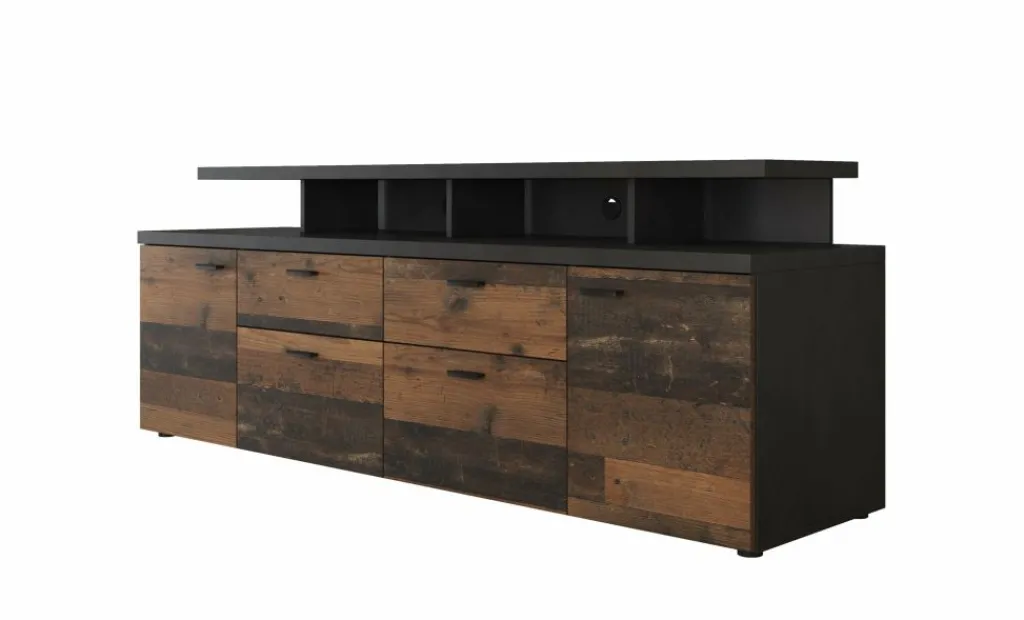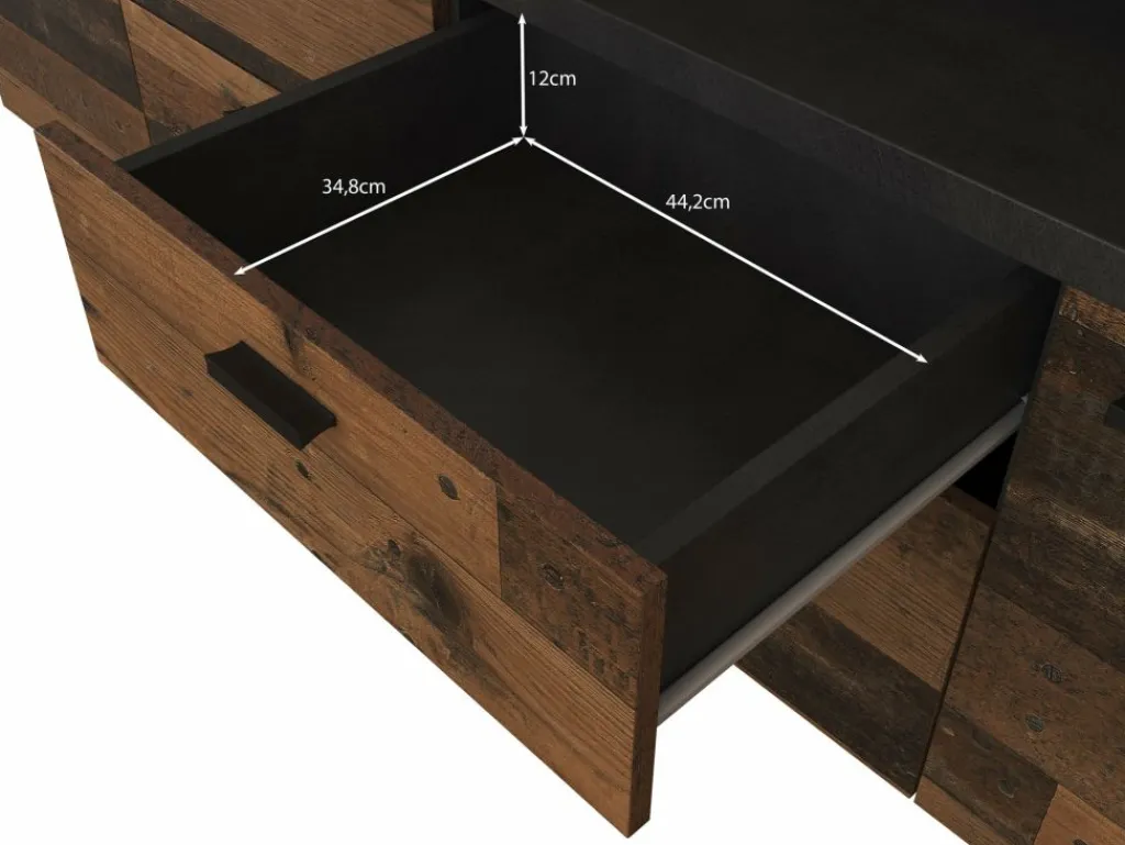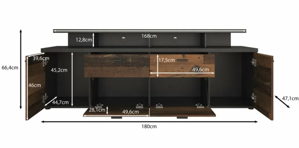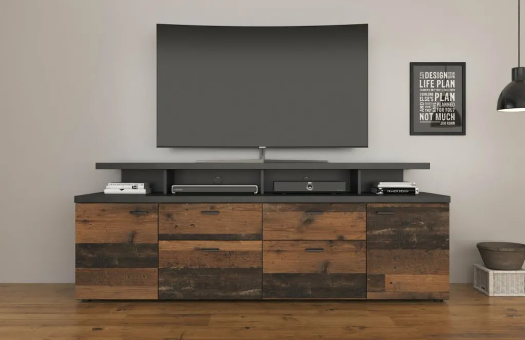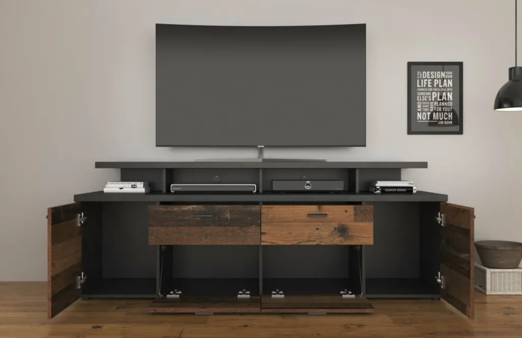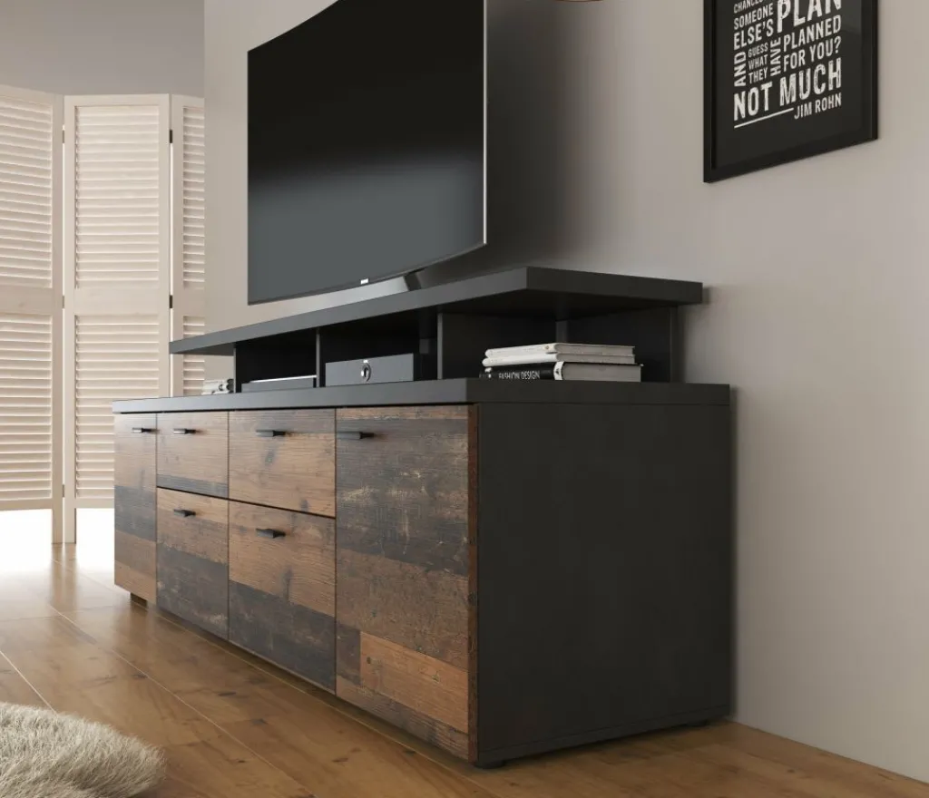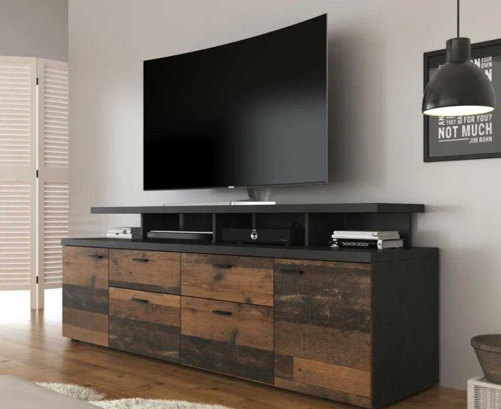 TV-Meubel Molly is een opbergkast voor onder de tv in een moderne, industriële stijl. De TV-kast is gemaakt in een old wood kleur met grijs. De Molly beschikt over 2 deuren, 2 kleppen en 2 lades. Deze openen allemaal met zwarte handgrepen. Bovenop zitten nog 4 open vakken. In de achterwand van de 2 middelste open vakken zit een uitsparing om bedrading weg te werken.