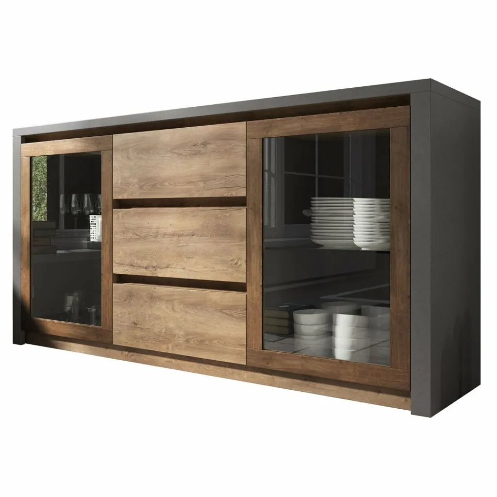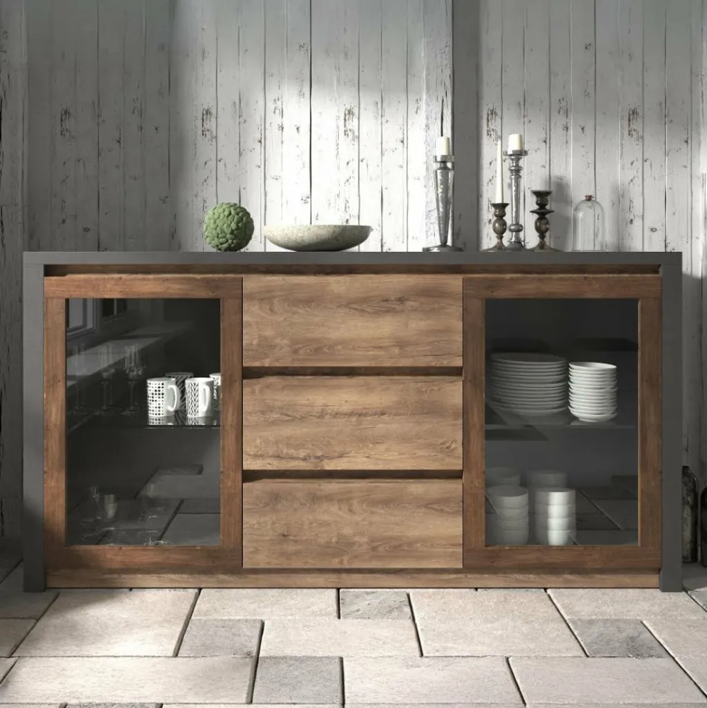 Dressoir Monaco is een robuuste en opvallende designkast met veel opbergruimte. Dit meubel is afgewerkt in een neutrale, maar warme eiken kleur in combinatie met een stoere mat grijze ombouw. De kast beschikt over 3 lades in het midden en twee deuren met glasplaten aan de zijkanten. Achter deze deuren zijn nog glazen schappen geplaatst.