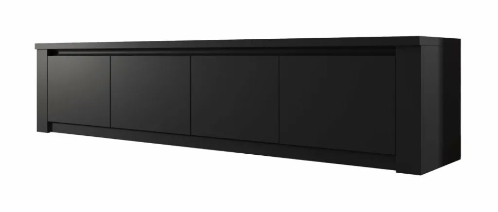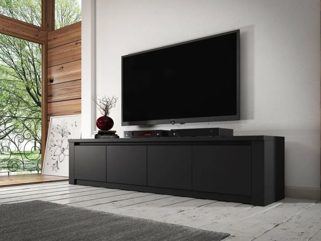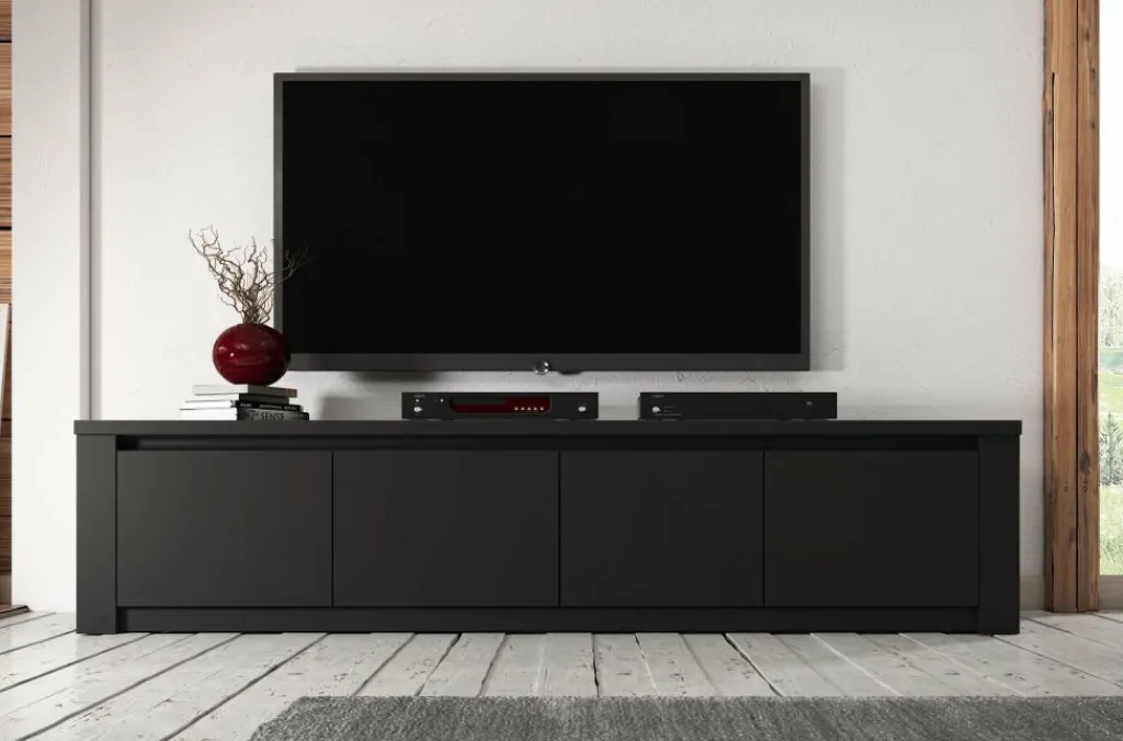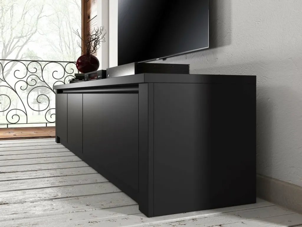 TV-Meubel Monaco is design tv-meubel, afgewerkt in een neutrale mat zwarte kleur. De kast beschikt over 3 schappen met opbergruimte voorzien van deuren. Aan de achterzijde bevindt zich geen gat om eventuele bedrading weg te werken. TV-meubel Monaco is onderdeel van een uitgebreid woonprogramma waarmee je een compleet nieuwe sfeer in huis kan creëren. Passend in industriële moderne interieurs.