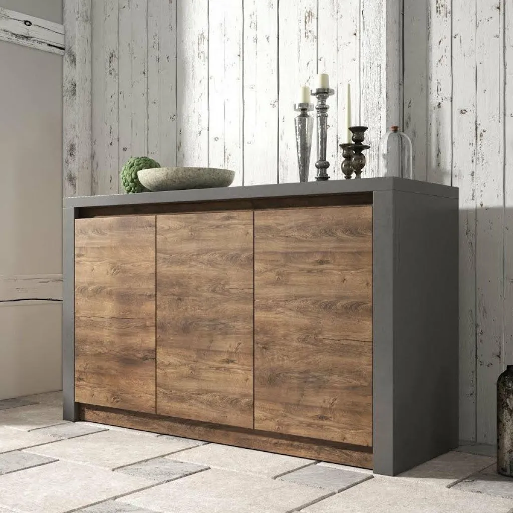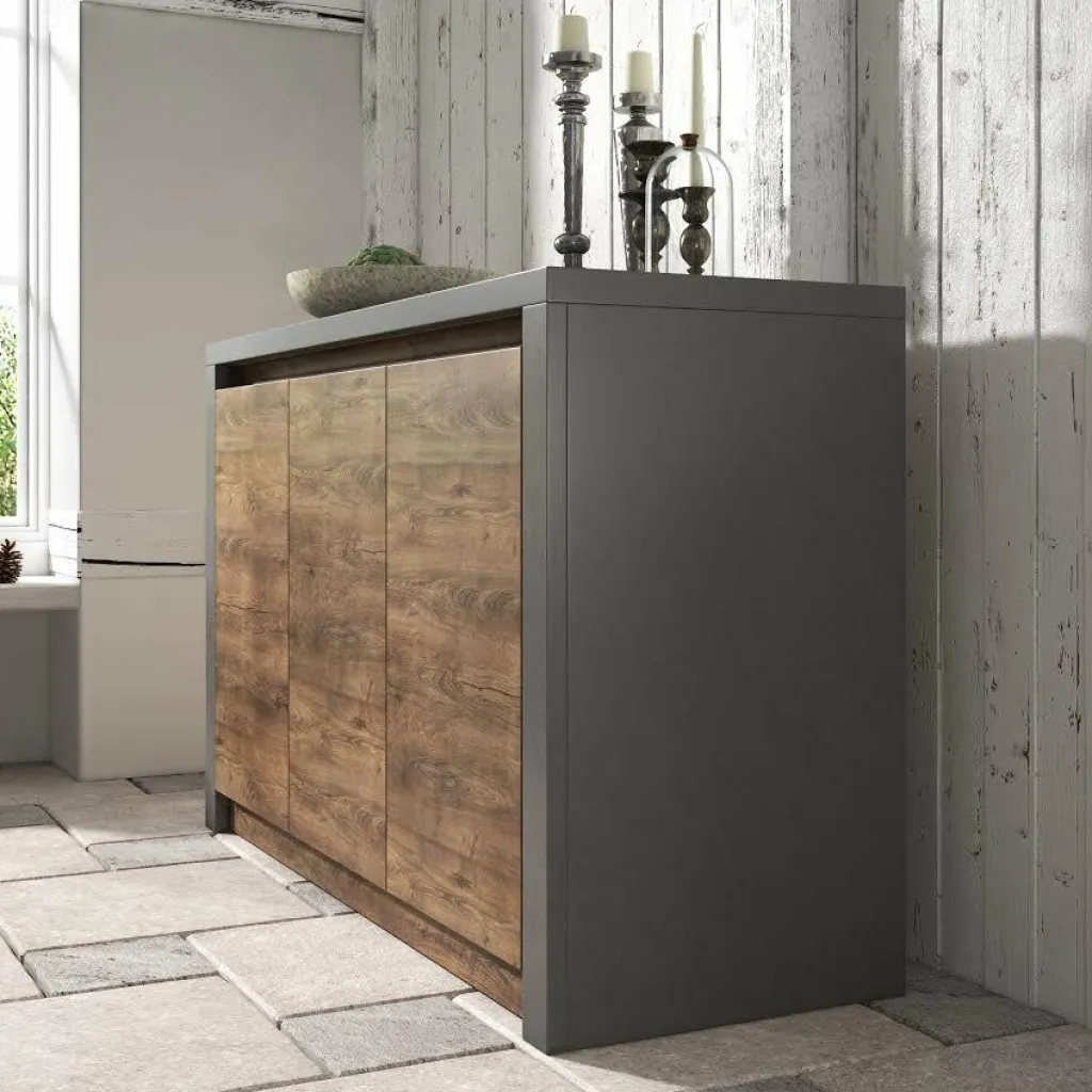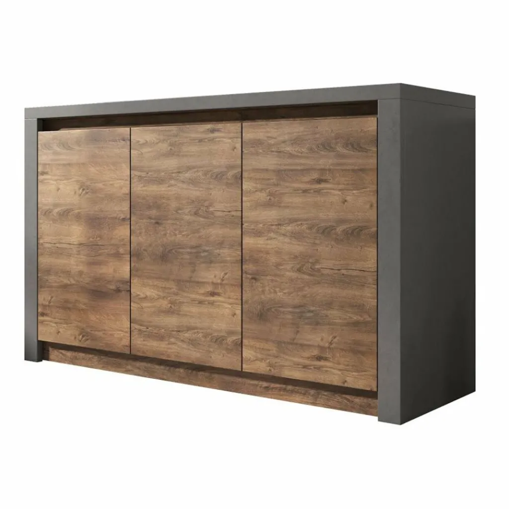 Dressoir Monaco afgewerkt in een neutrale, maar warme eiken kleur in combinatie met een stoere mat grijze ombouw. Het dressoir is voorzien van 3 greeploze deuren. Vanwege de strakke uitstraling is het dressoir passend in elke stijl woonkamer.