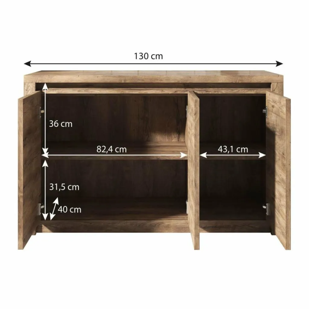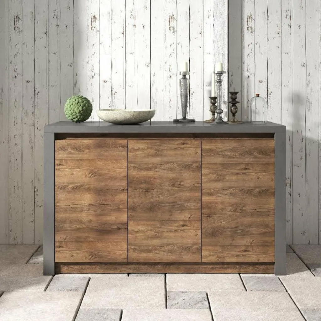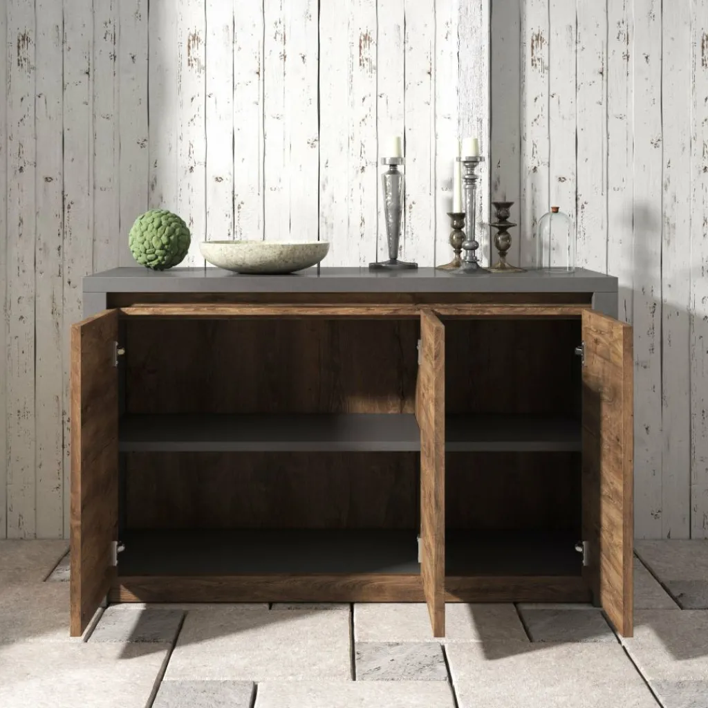 Dressoir Monaco afgewerkt in een neutrale, maar warme eiken kleur in combinatie met een stoere mat grijze ombouw. Het dressoir is voorzien van 3 greeploze deuren. Vanwege de strakke uitstraling is het dressoir passend in elke stijl woonkamer.