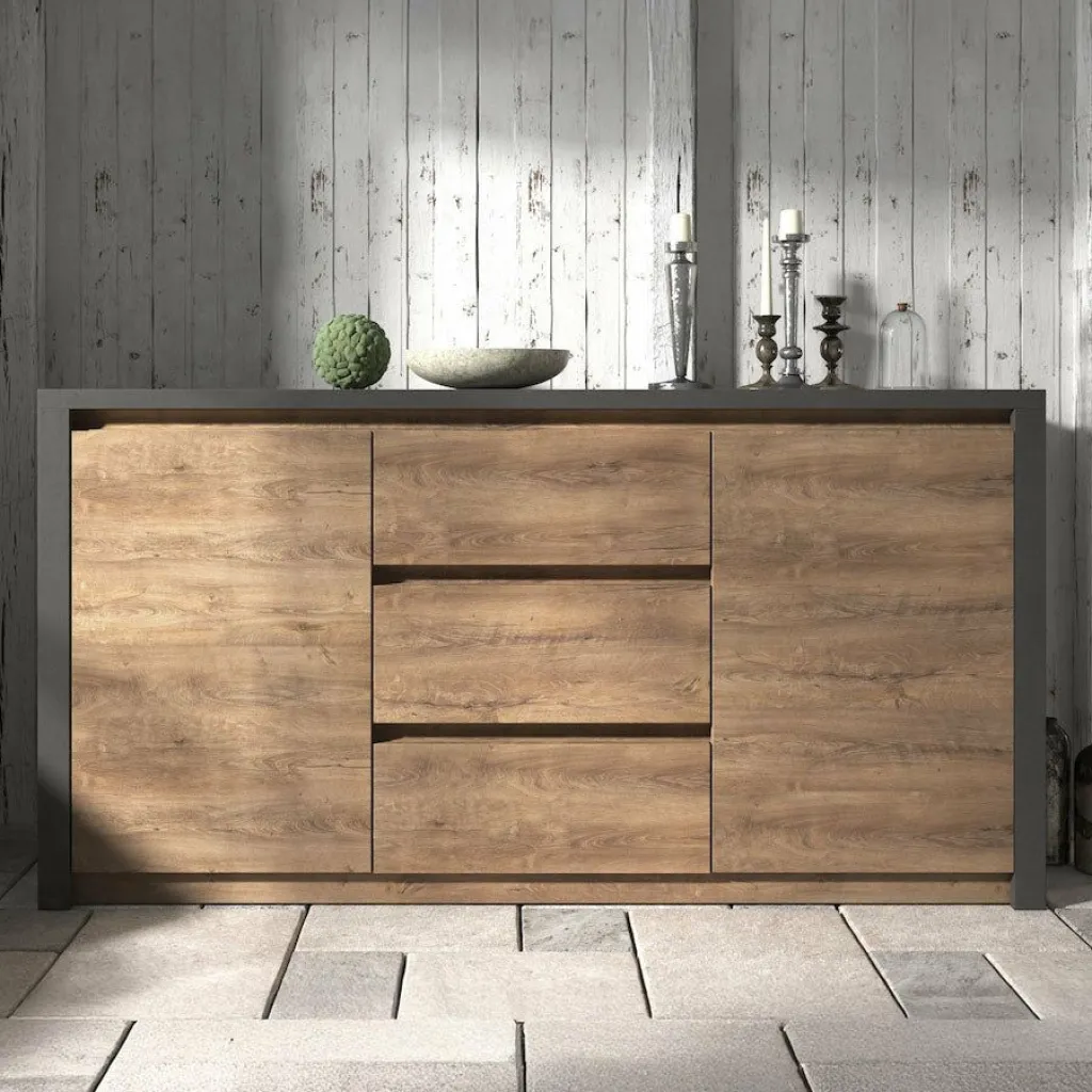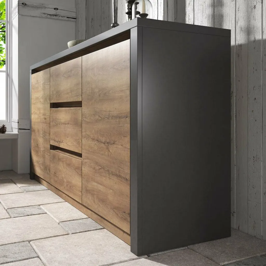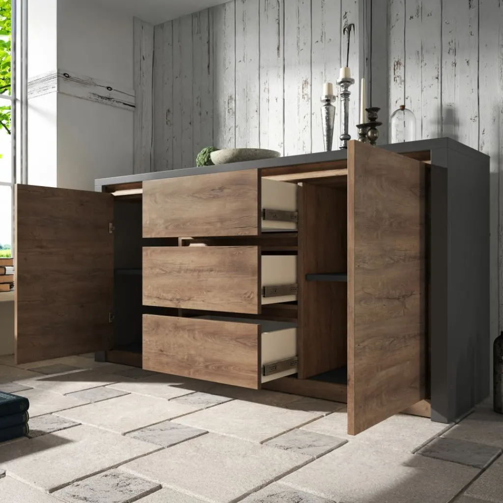 Dressoir Monaco is een robuust en praktisch vormgegeven meubel met voldoende opbergmogelijkheden. Dankzij het kleurgebruik en design is dit meubel geschikt voor zowel landelijke als moderne interieurs. De kast beschikt over 3 lades in het midden met aan weerszijden deuren waarachter legplanken zijn geplaatst. Zowel de deuren als lades zijn volledig greeploos afgewerkt.