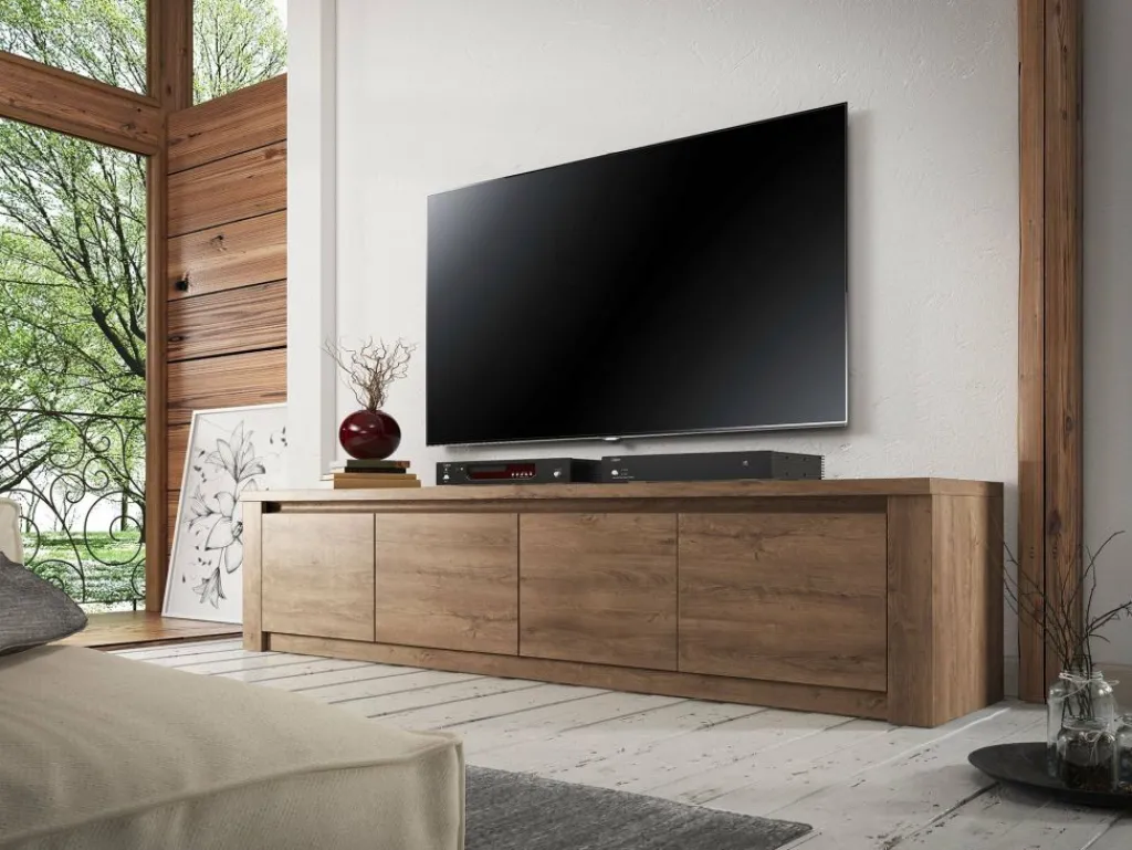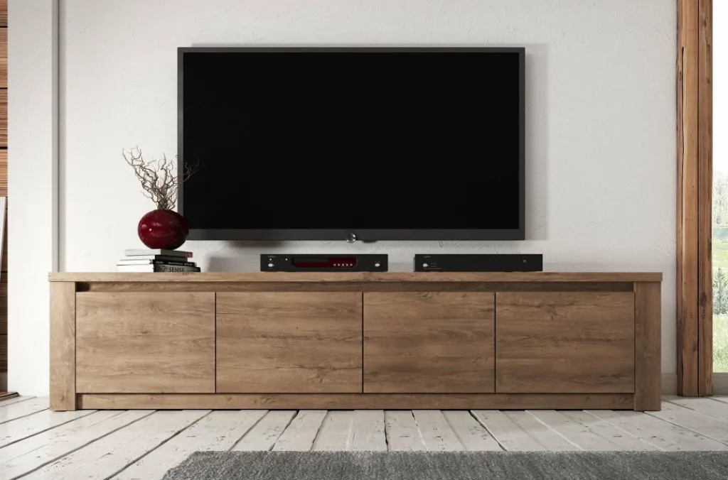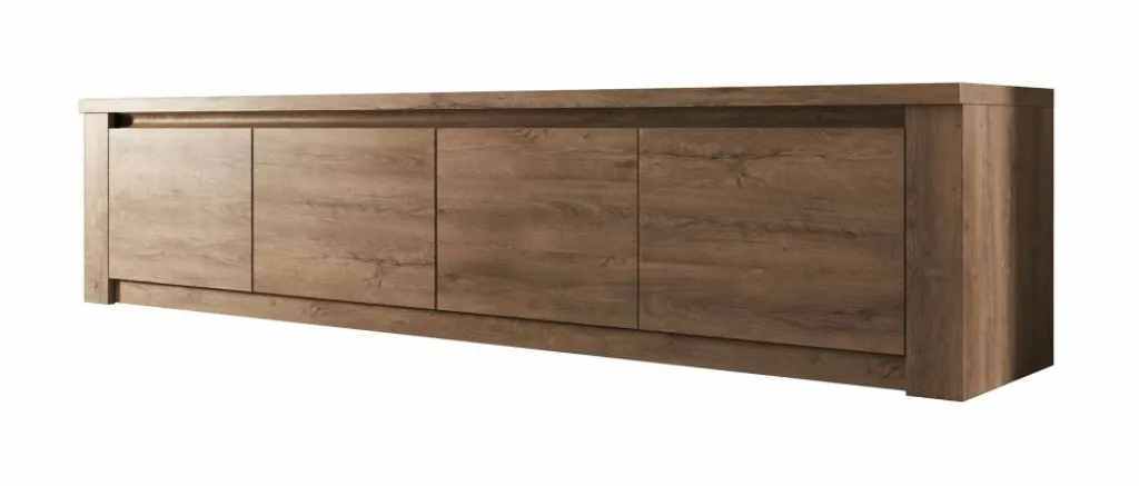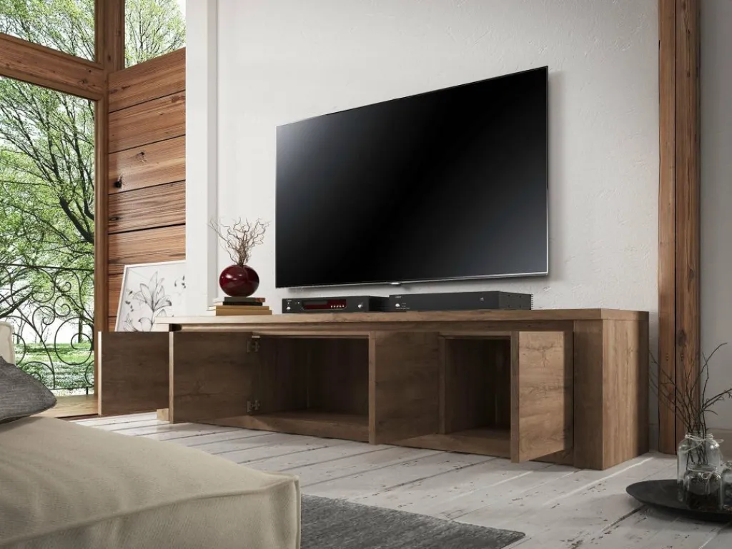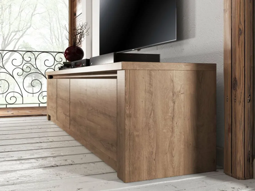 TV-Meubel Monaco is design tv-meubel, afgewerkt in een neutrale eiken kleur. De kast beschikt over 3 schappen met opbergruimte voorzien van deuren. Aan de achterzijde bevindt zich geen gat om eventuele bedrading weg te werken. TV-meubel Monaco is onderdeel van een uitgebreid woonprogramma waarmee je een compleet nieuwe sfeer in huis kan creëren. Je zou deze stijl kunnen omschrijven als ‘stoer industrieel’ en past zowel in landelijke als moderne interieurs.