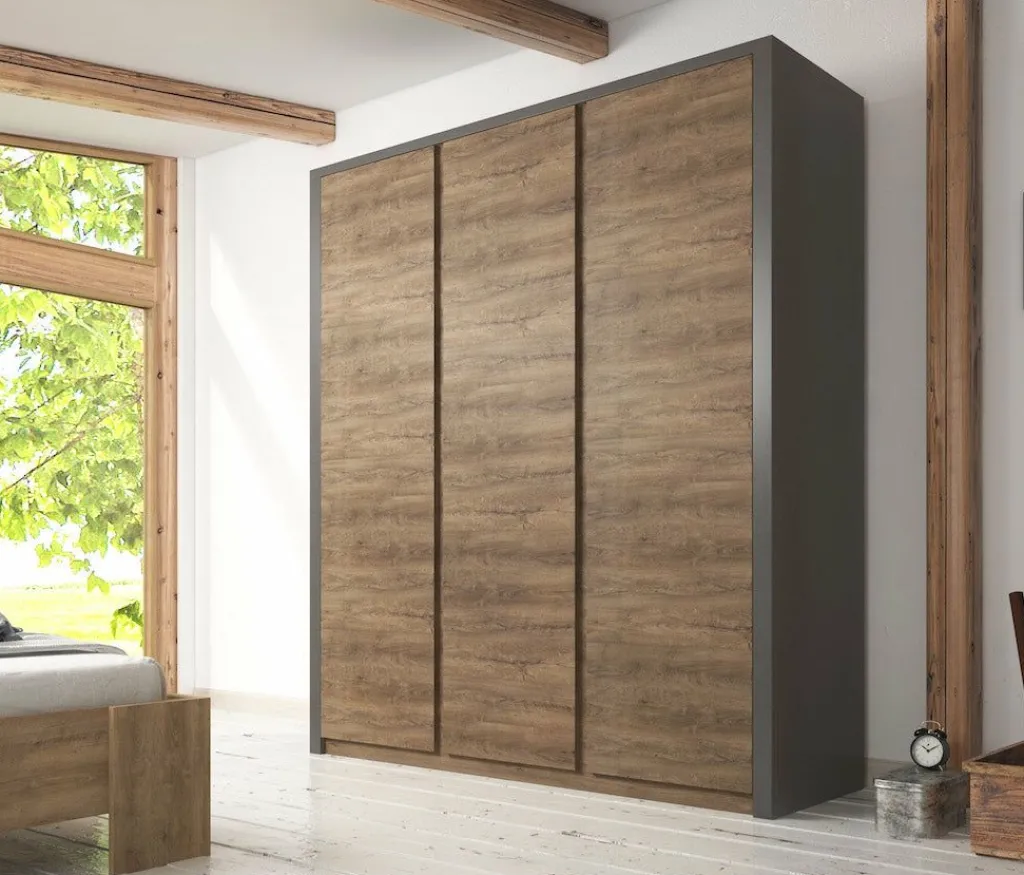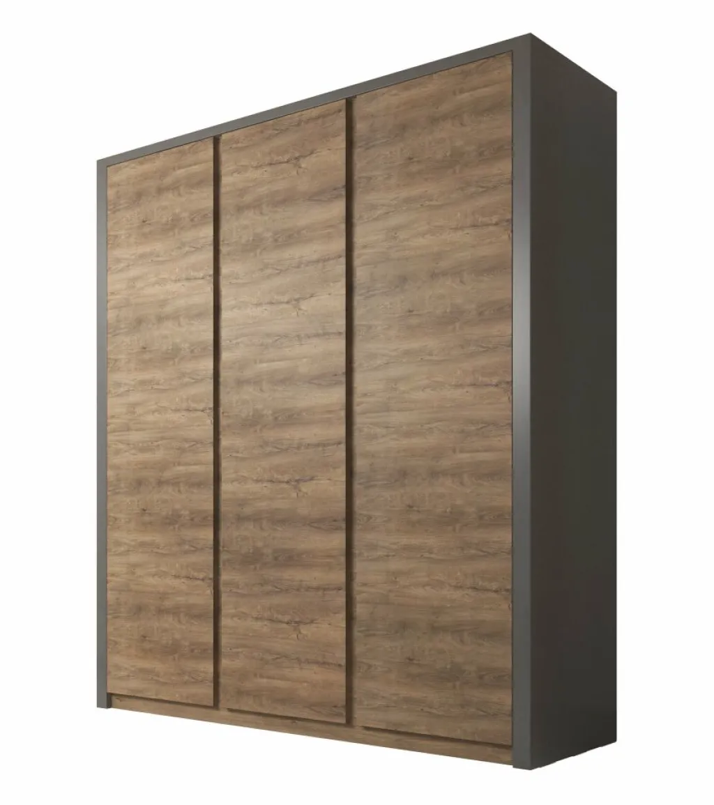 Garderobekast Monaco is een robuuste, stijlvolle kledingkast met ruim voldoende opbergmogelijkheden. Het meubel is uitgevoerd in een combinatie van eiken met grijs welke zorgt voor een warme uitstraling en geschikt is voor zowel landelijke als moderne slaapkamers. Er zijn 3 deuren te vinden met daarachter een zee aan opbergruimte. Aan de linker- en rechterkant zijn metalen stangen geplaatst waaraan je kleding kunt ophangen. Daarboven zijn schappen geplaatst waar je bijvoorbeeld schoenen of accessoires op kan bergen. Tot slot zijn er in het midden van de kast vijf ruime schappen geplaatst. Garderobekast Monaco maakt deel uit van een uitgebreid woonprogramma waarmee je een totaal nieuwe stijl in huis kan creëren.