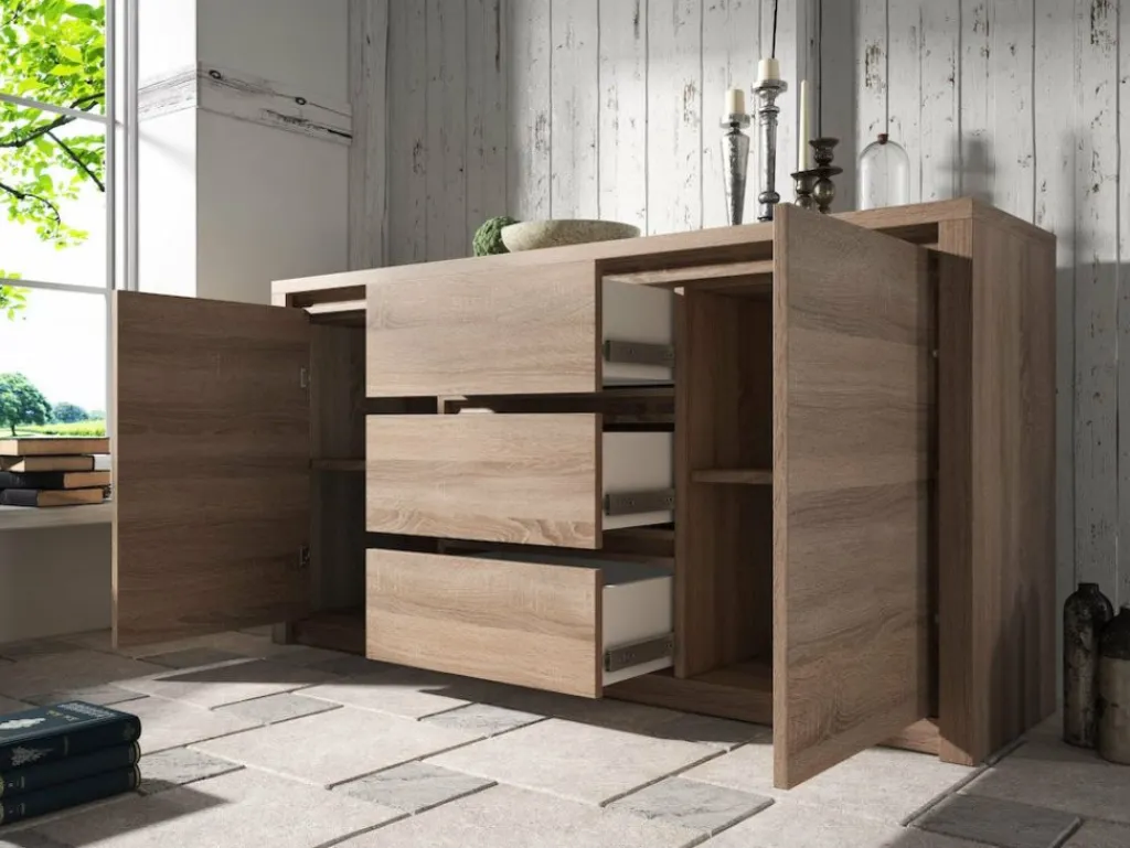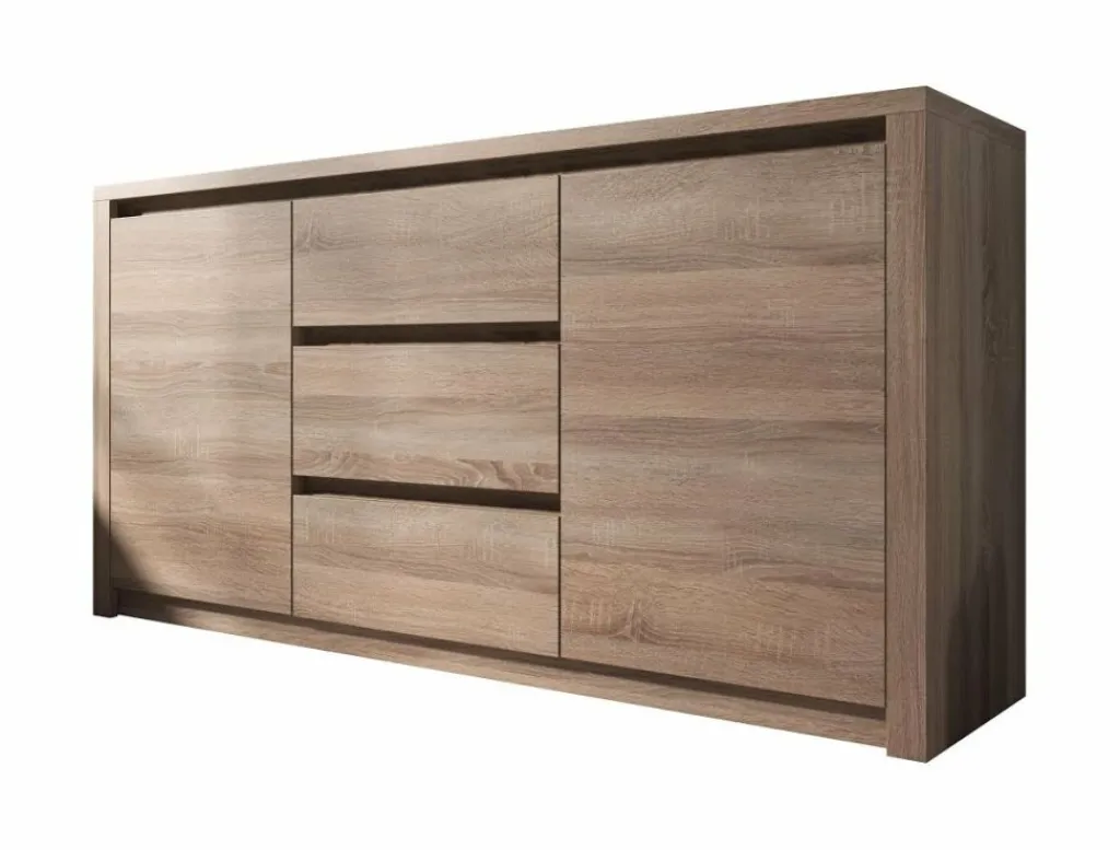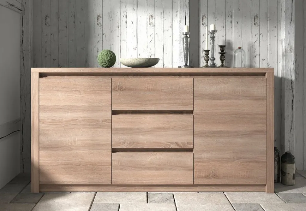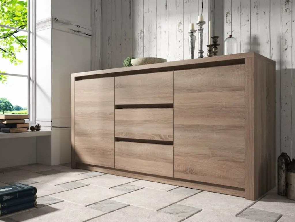 Dressoir Monaco is een landelijk dressoir gemaakt van hout in truffel eiken kleur. Het dressoir is voorzien van 2 deuren en 3 lades. Vanwege de robuuste uitstraling is het dressoir een eyecatcher en vult net dat lege plekje in de woonkamer op.